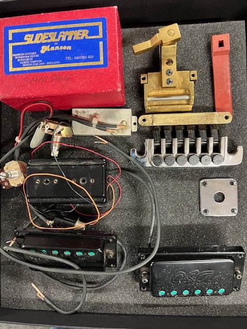 A miscellaneous selection of guitar parts useful for a repairer or hobby guitarist. A Manson Slideslammer in brass with retainer protector, box and paperwork. A Gibson TP6 adjustable tailpiece in chrome, a Gibson ABR1 bridge plate in gold with no saddle. Two early 1980's OSC Active pickups. A Gibson jack plate in chrome. A Bass Guitar pickup with bakelite possibly Gibson.
