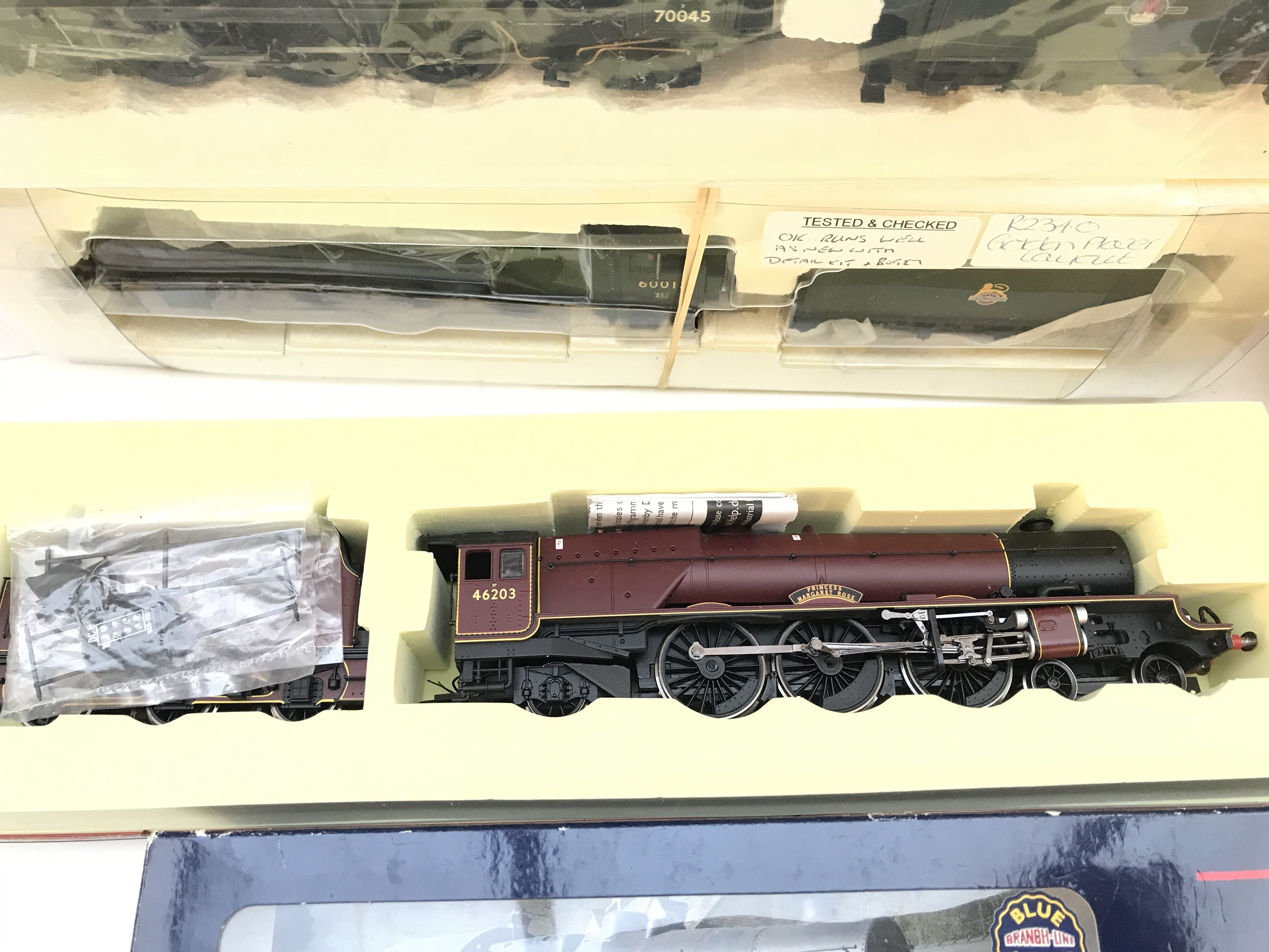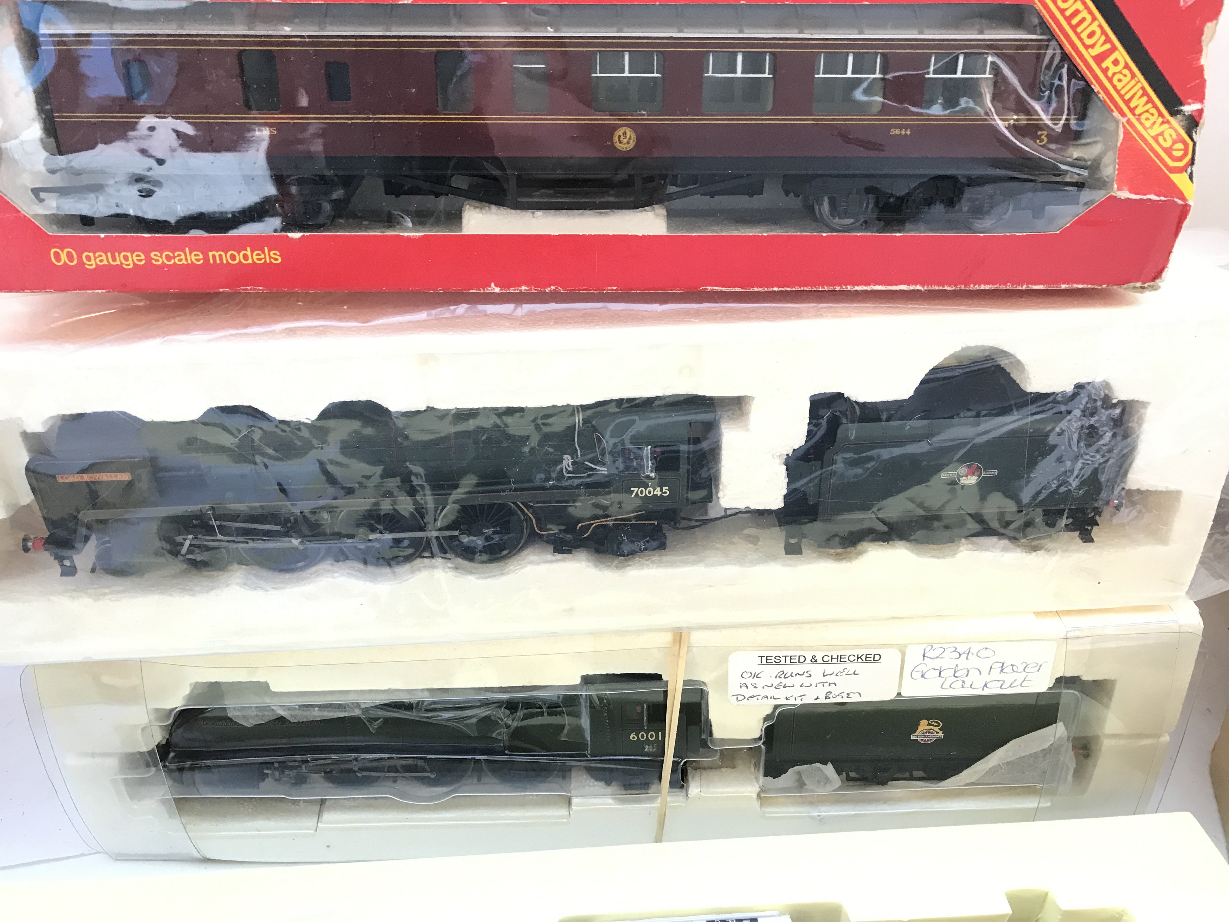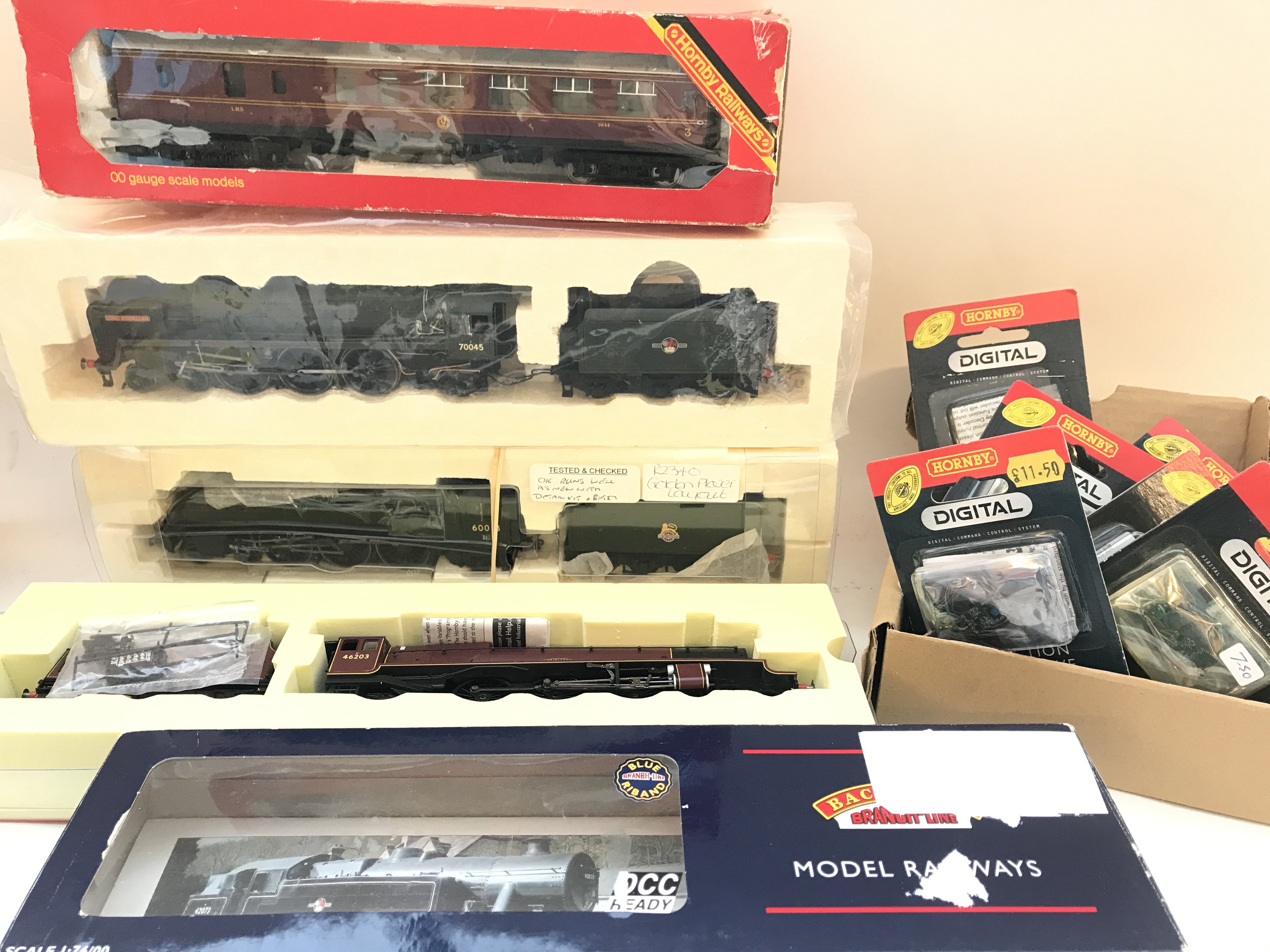 A Collection of Partly Boxed 00 Gauge Locomotives Digital Decoders. Includes a Bachmann Fairborn Tank 42073(Part of Cylinder Missing). Also Includes 2 Coaches.