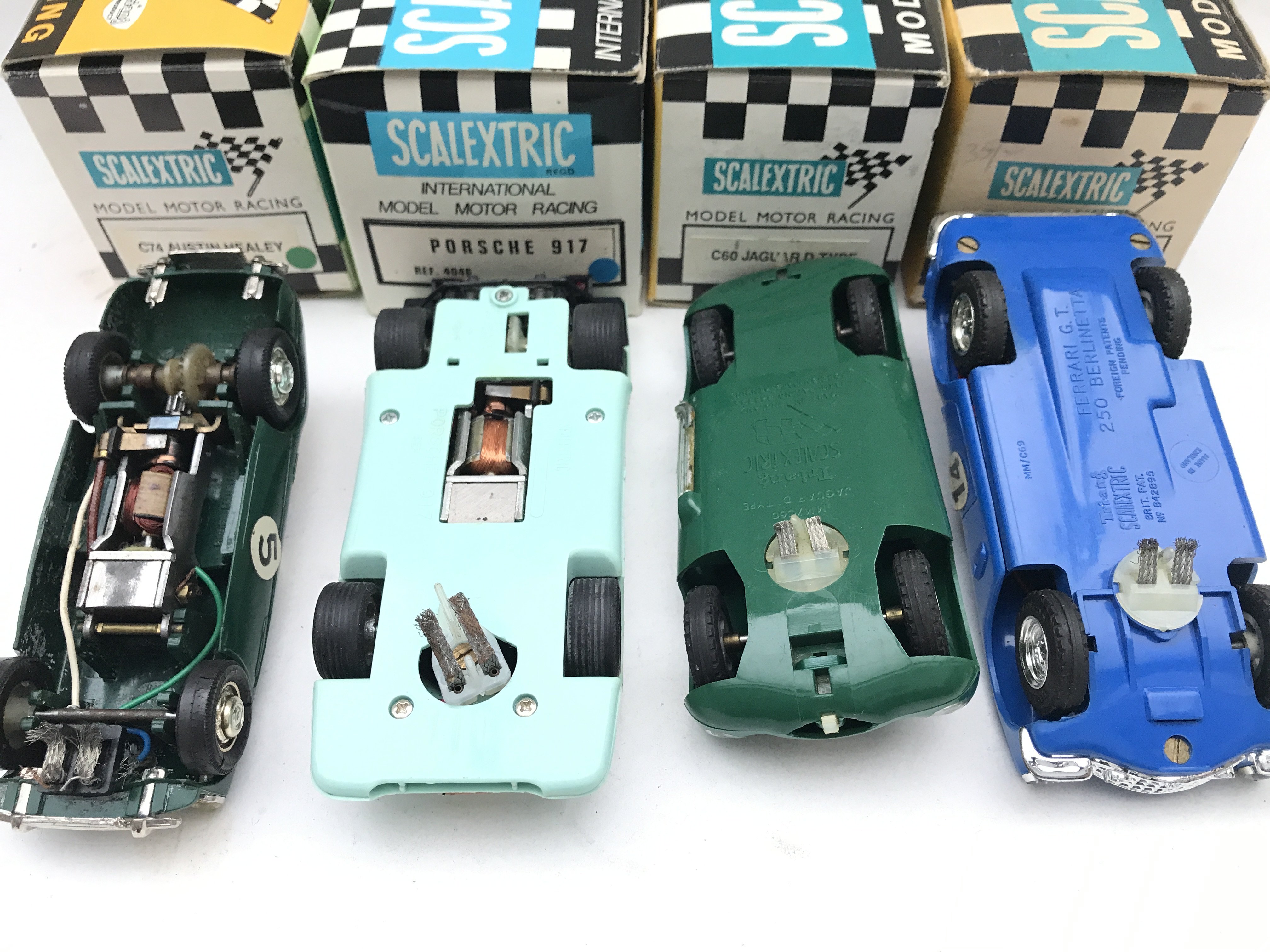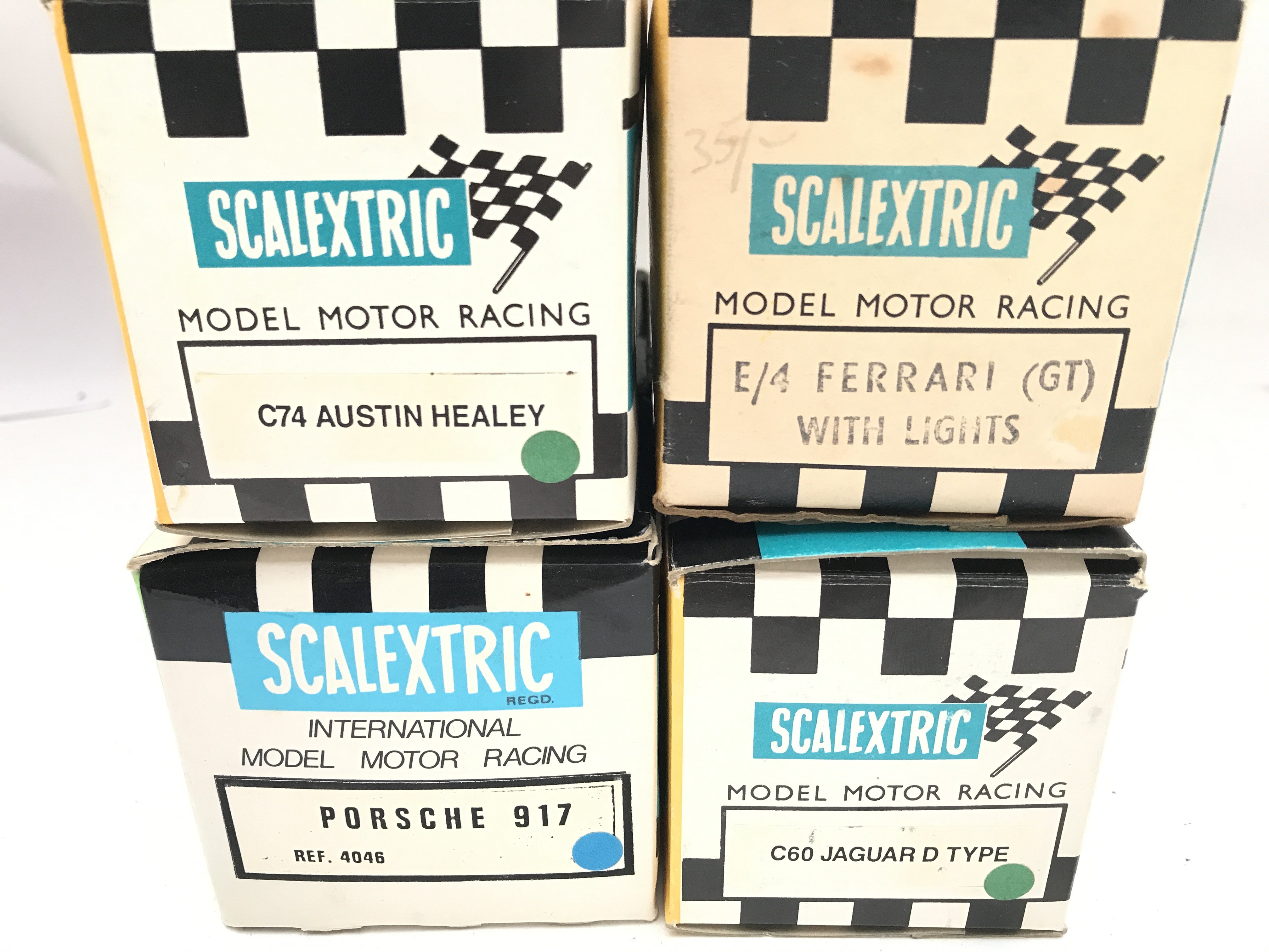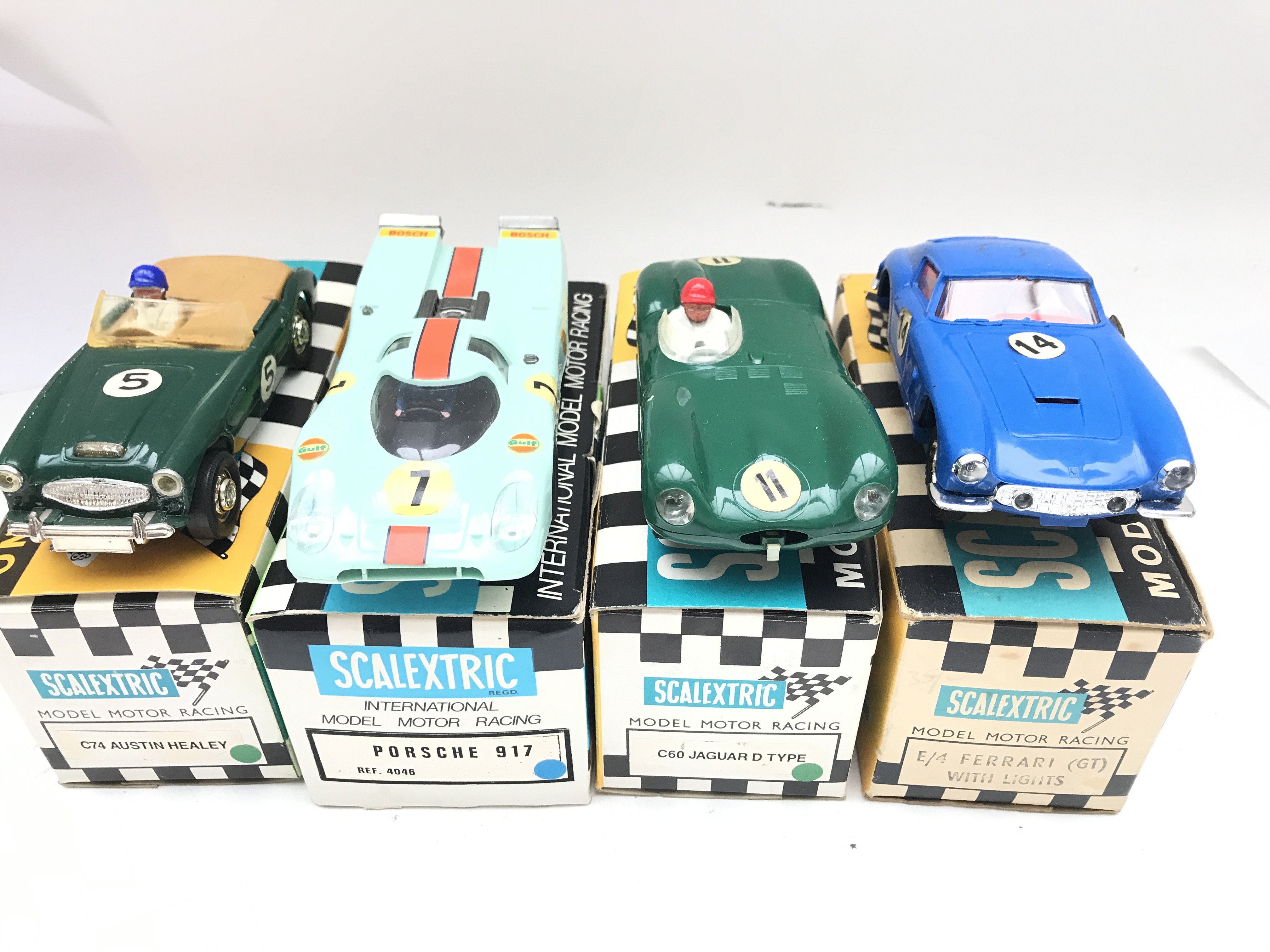 4 X Boxed Scalextric Cars. A Austin Healey (Repro Box) a Porsche 917 (Repro Box). A Jaguar D Type(Repro Box) and a Ferrari (GT) (Original Box).