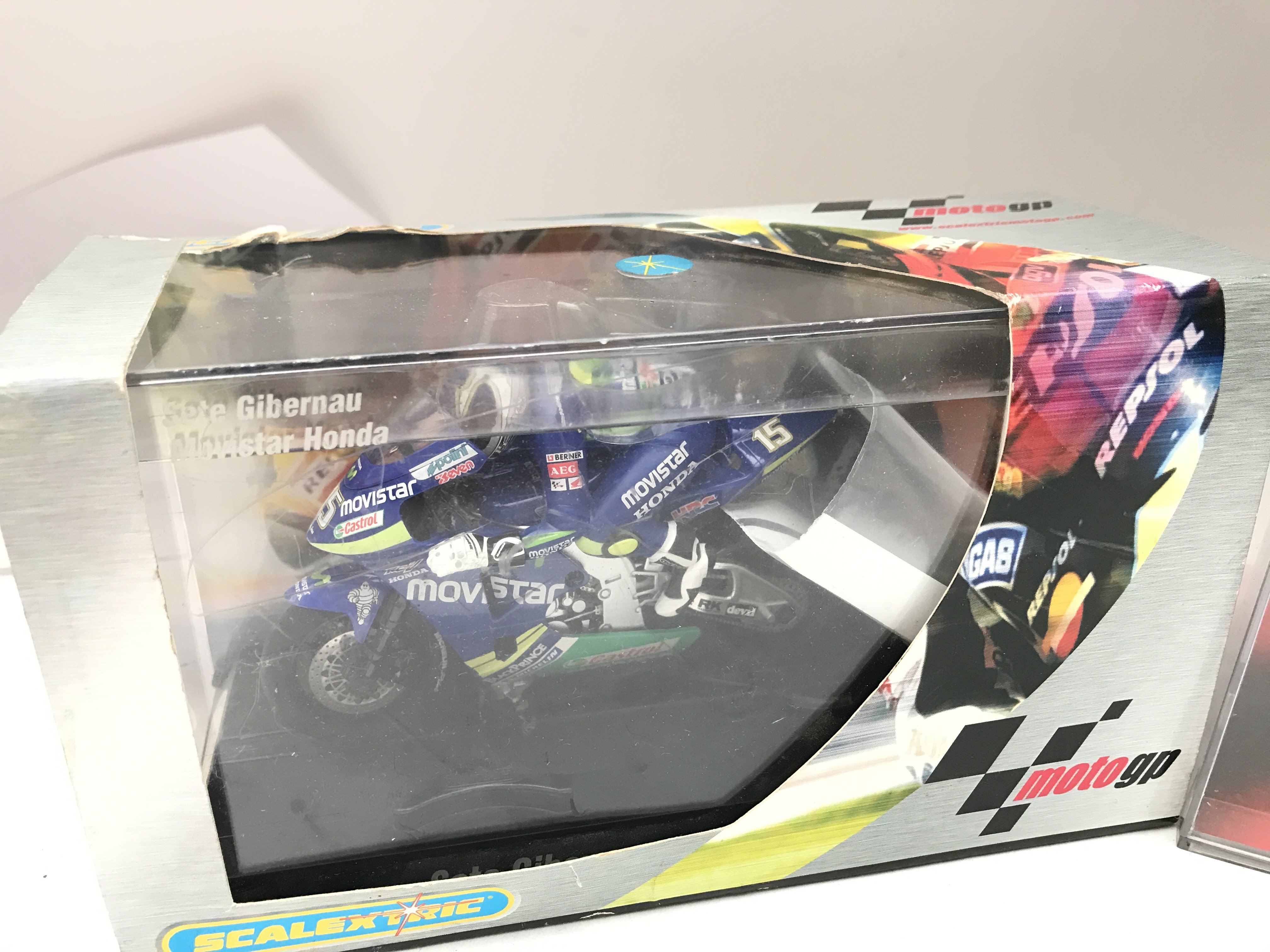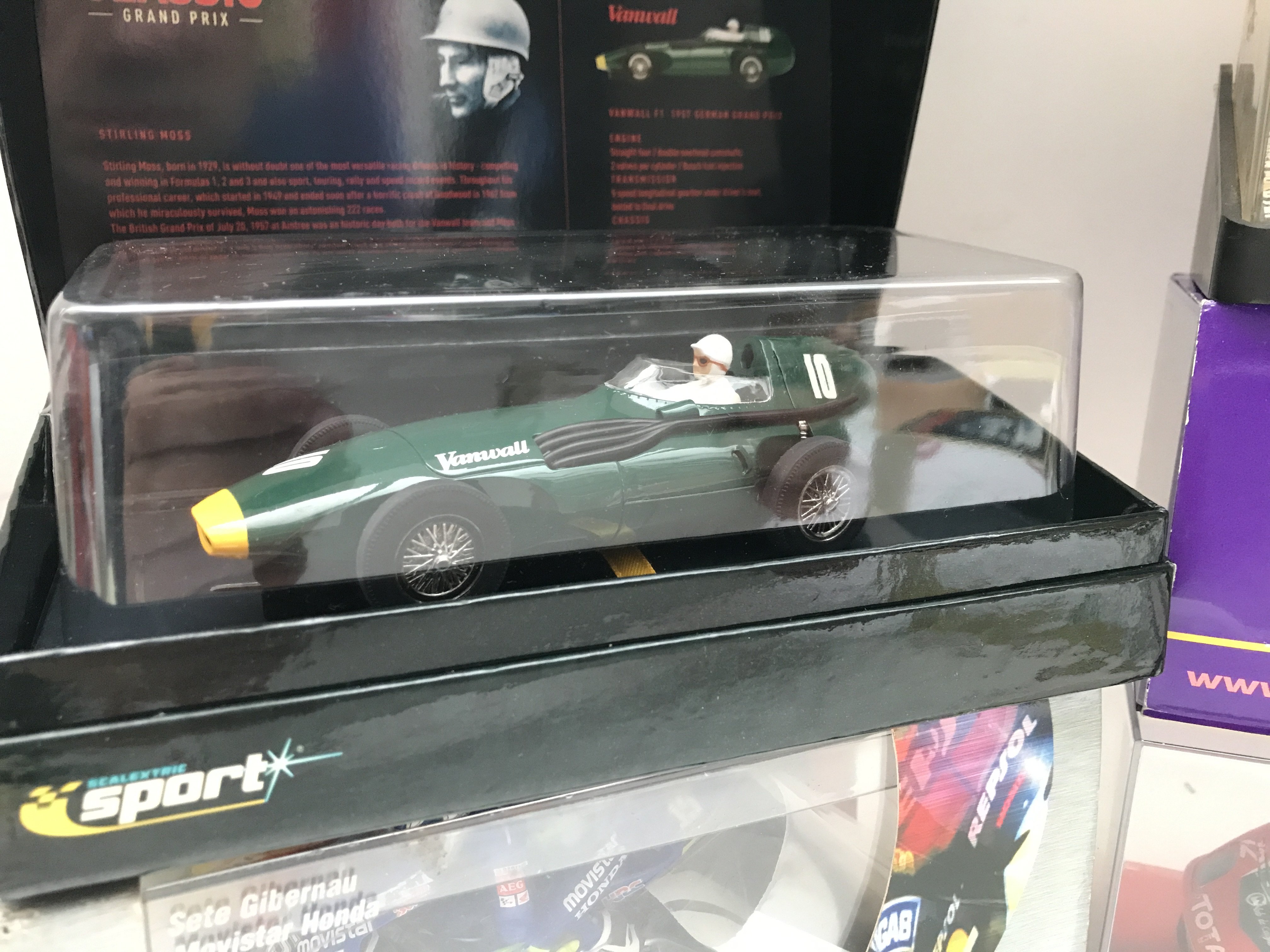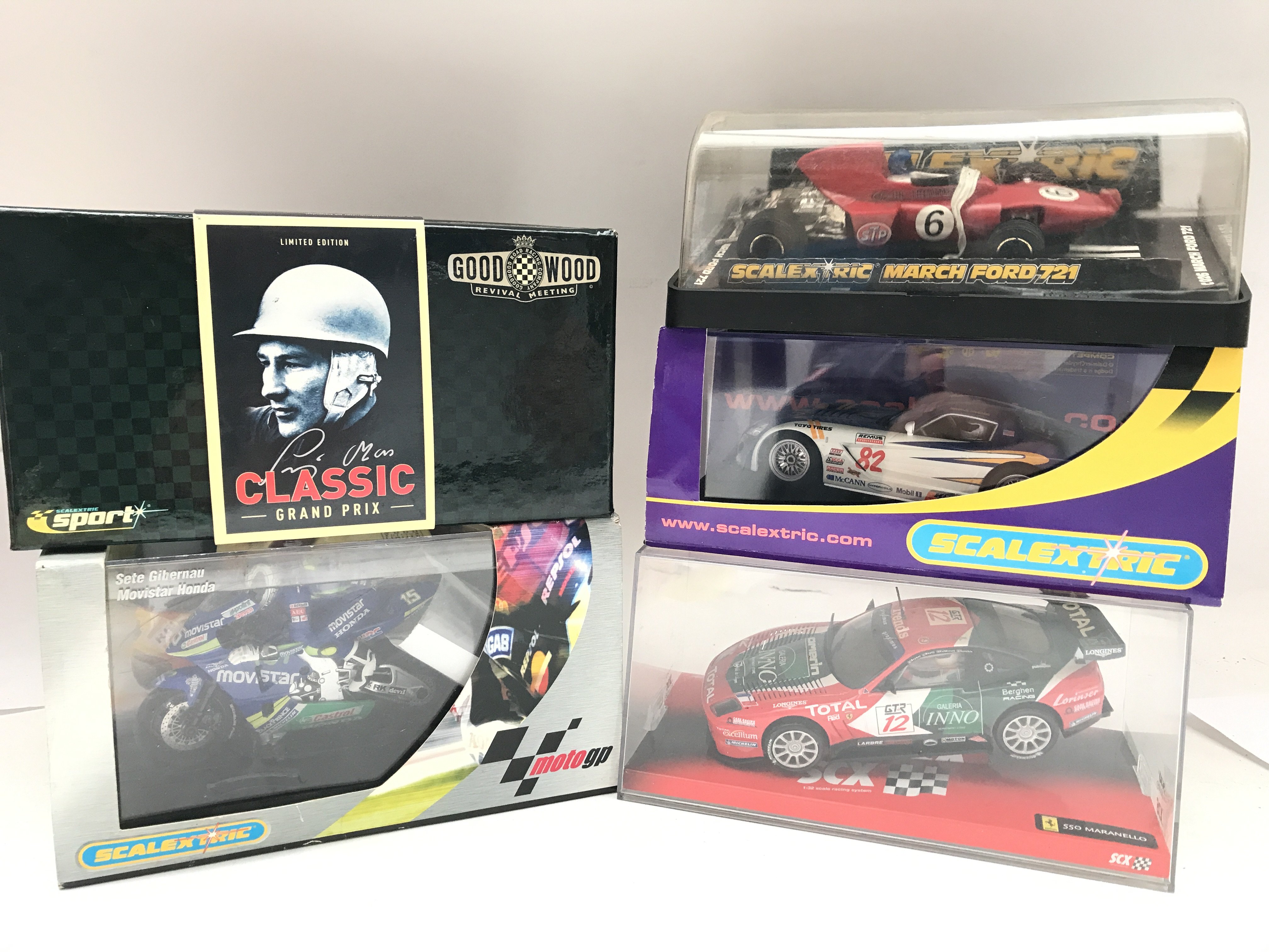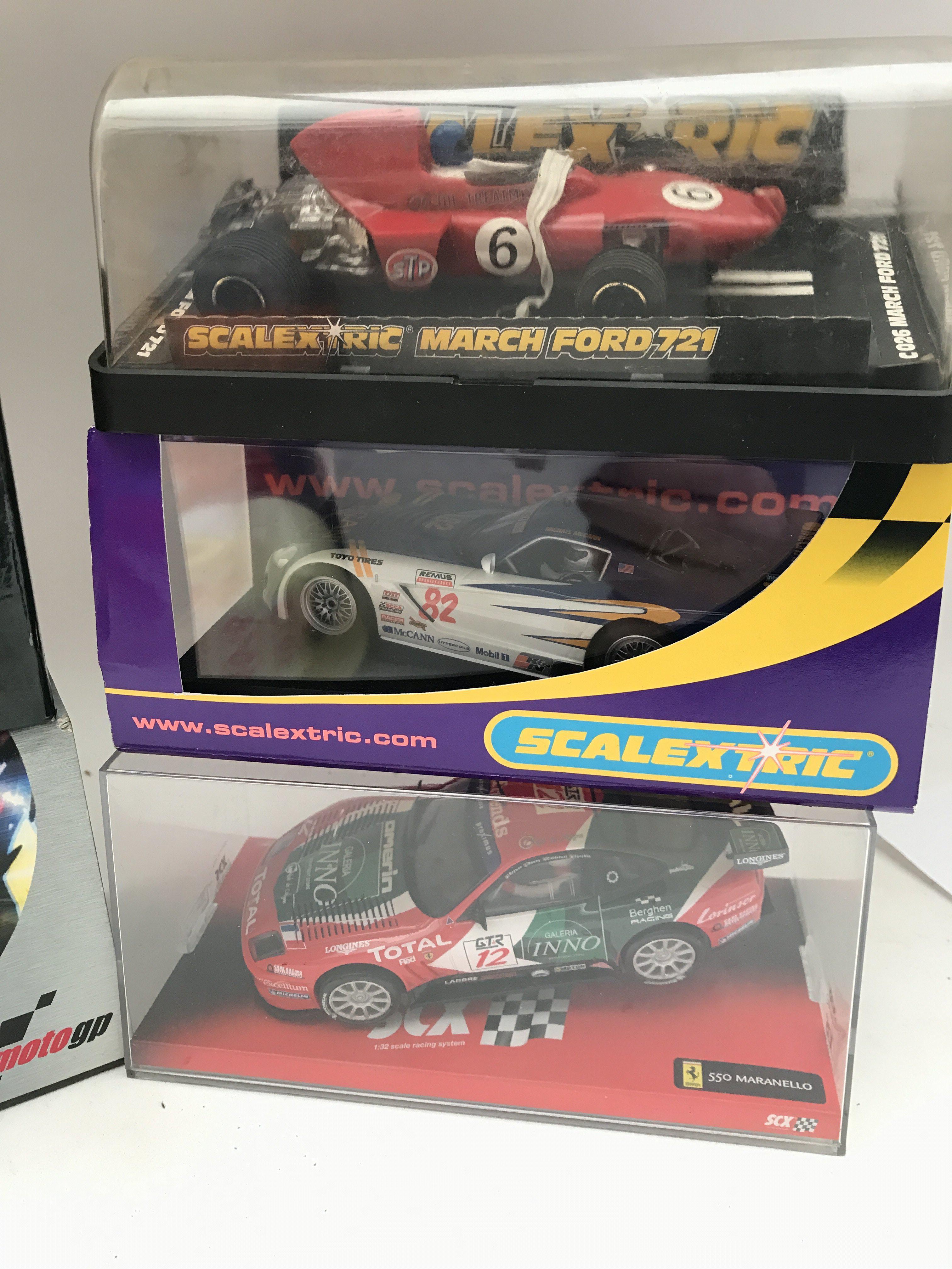 A Collection of Boxed Scalextric Cars including a SCX Ferrari 530 Maranello. A March Ford 721. A Dodge Viper.Vanwall F1 1957 Stirling Moss. And A Moto GP Movistar Honda Bike.