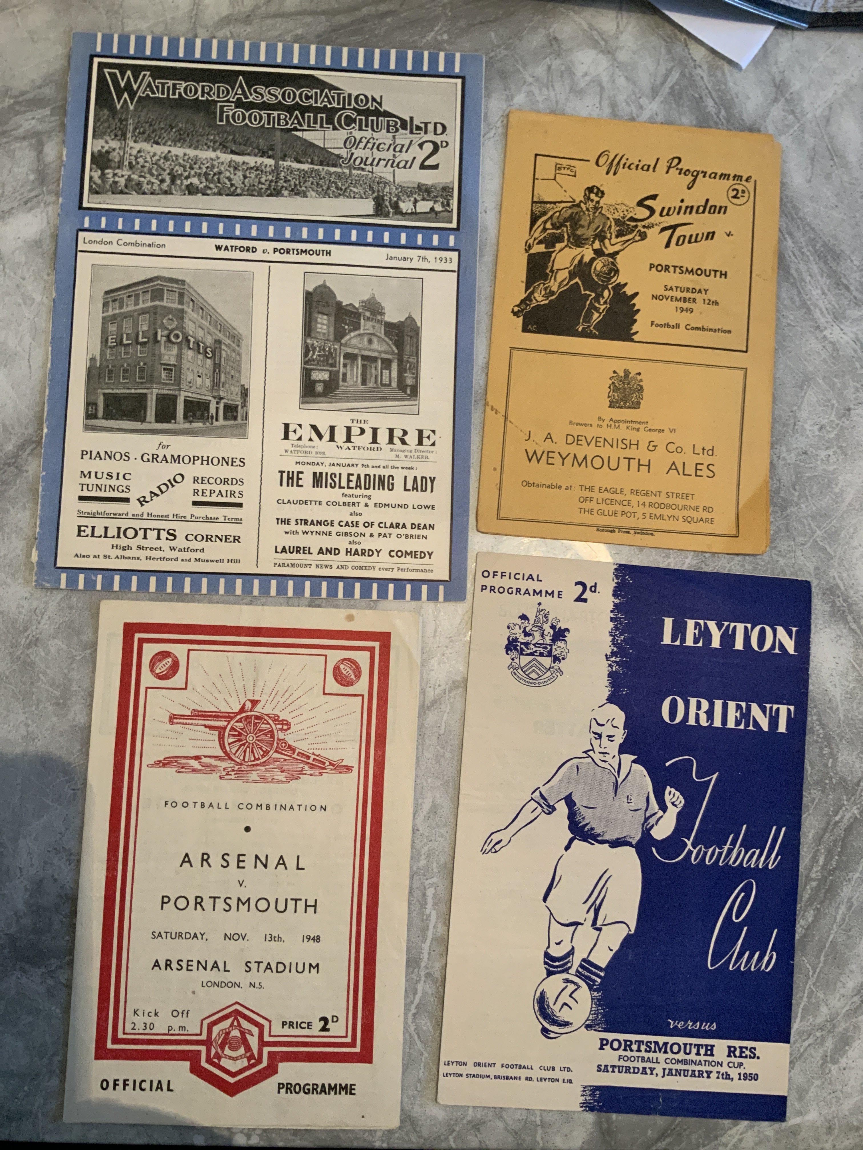 Portsmouth Pre 1950 Reserve Away Football Programmes: 32/33 Watford, 48/49 Arsenal, 49/50 Swindon and Leyton Orient. Very good. (4)