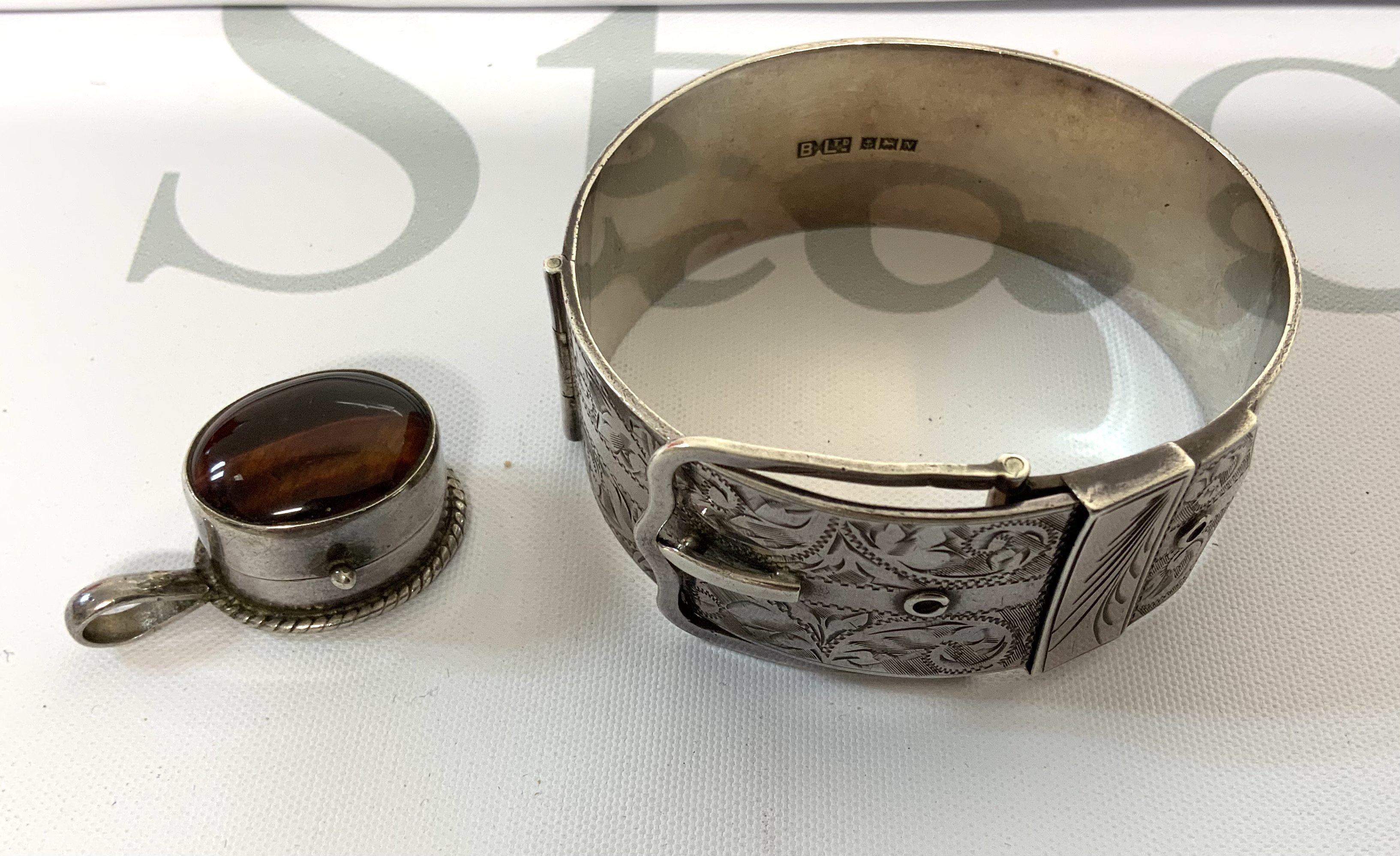 A heavy hallmarked silver buckle design bangle, with silver pill box. (A) 69g.