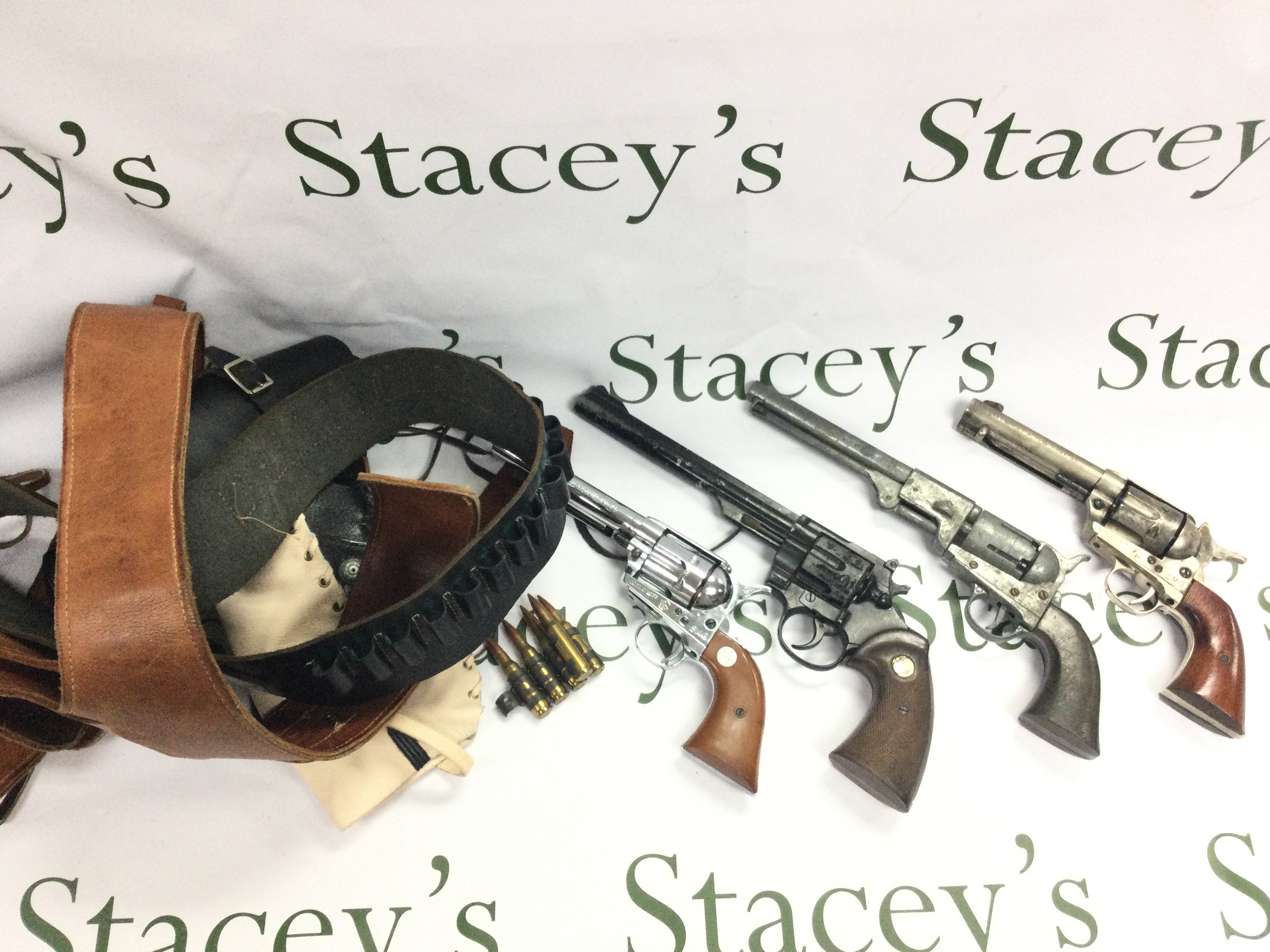A collection of replica revolvers including a Kokusai Sangyo SMG colt single action army. 45 model of 10.77 & model of 9.78, Sussex Armoury made in Italy revolver and an unmarked revolver. Also including leather gun belts. This lot cannot be posted,