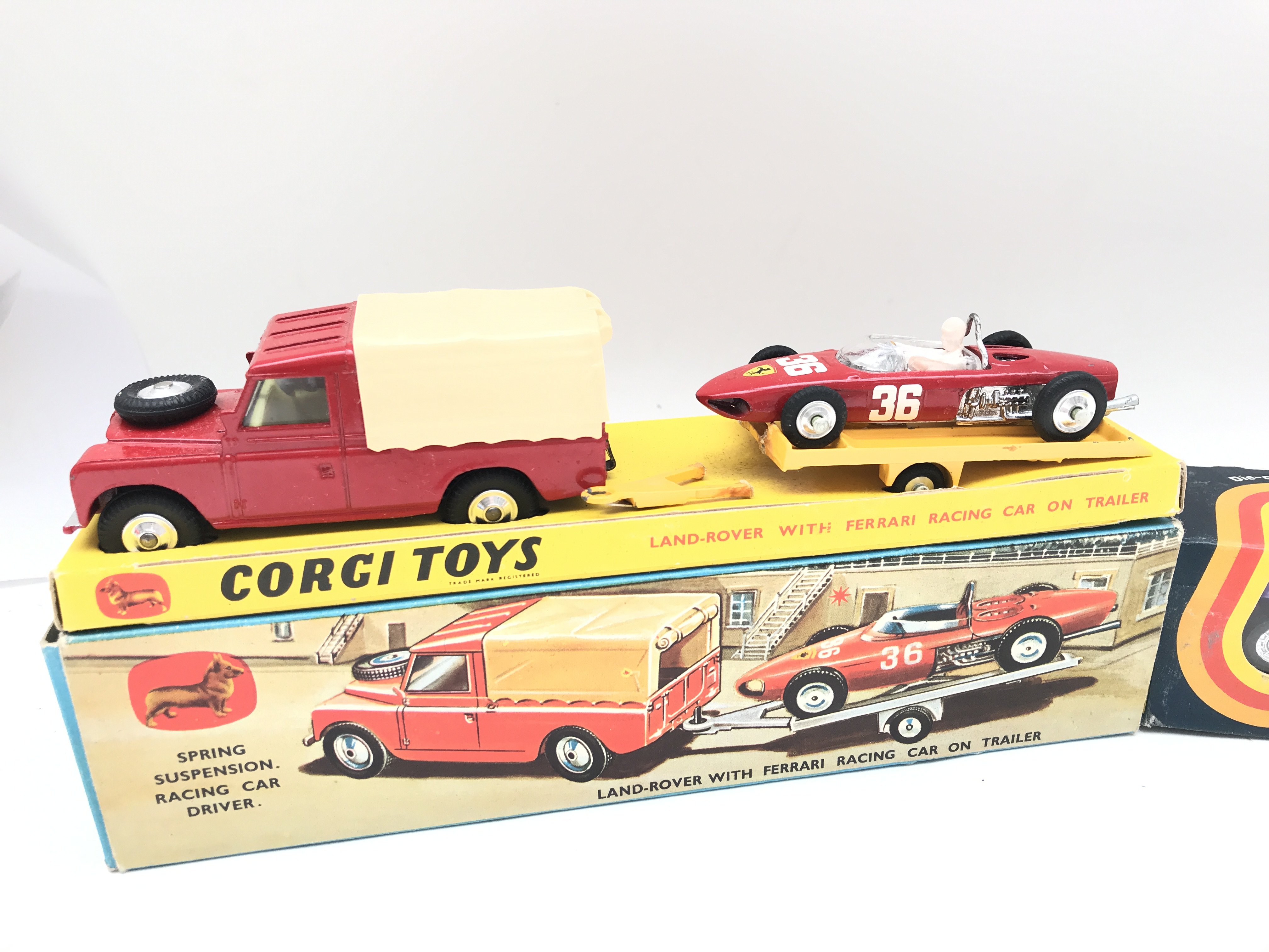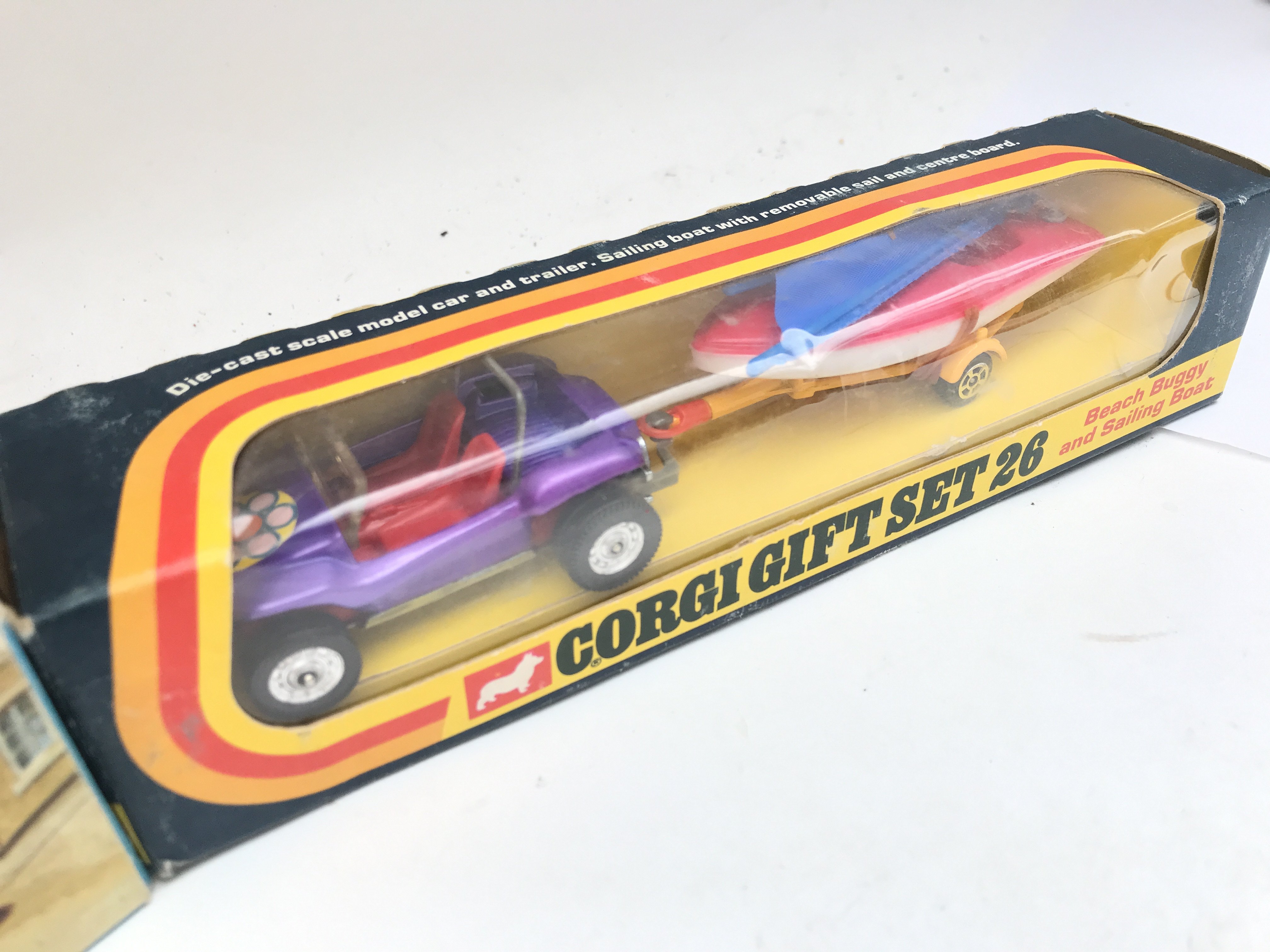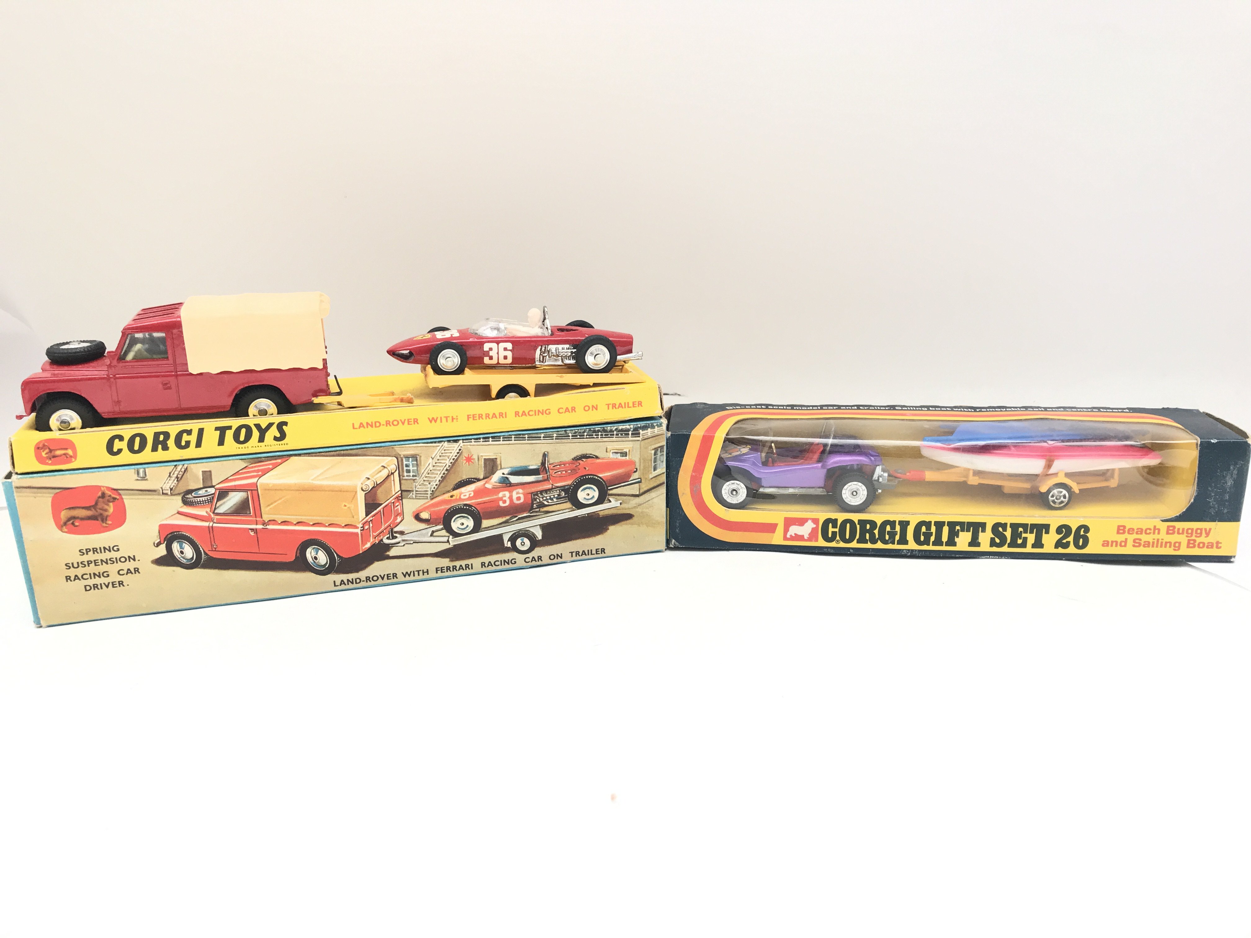 A Boxed Corgi Gift Set #17 Land-Rover With Ferrari Racing Car On Trailer (Trailer is at Fault) and a Boxed Gift Set 26 Beach Buggy And Sailing Boat. No Reserve.