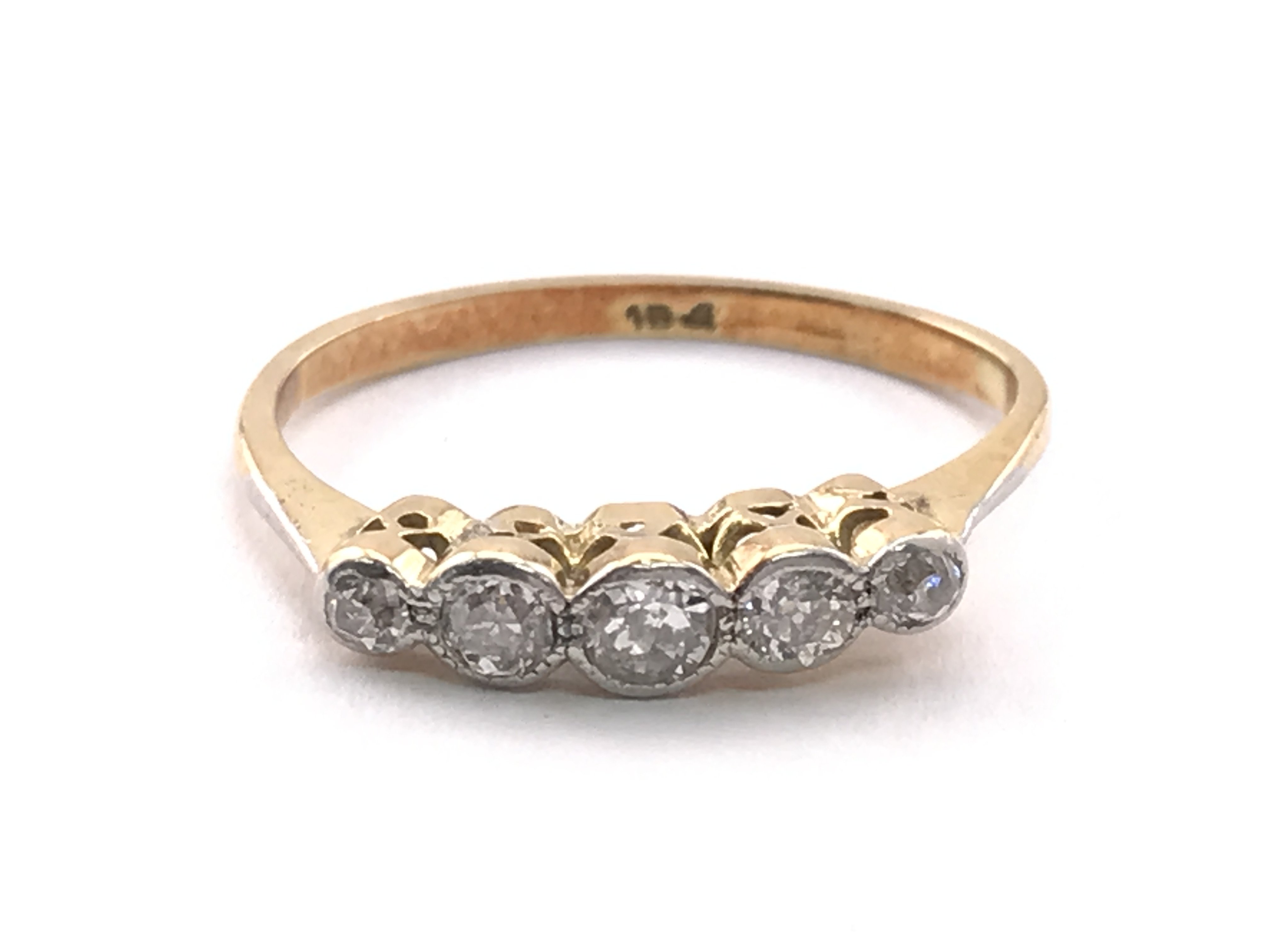 A high carat gold five diamond stone ring, total weight 2g, Ring size K/L. Postage category A
