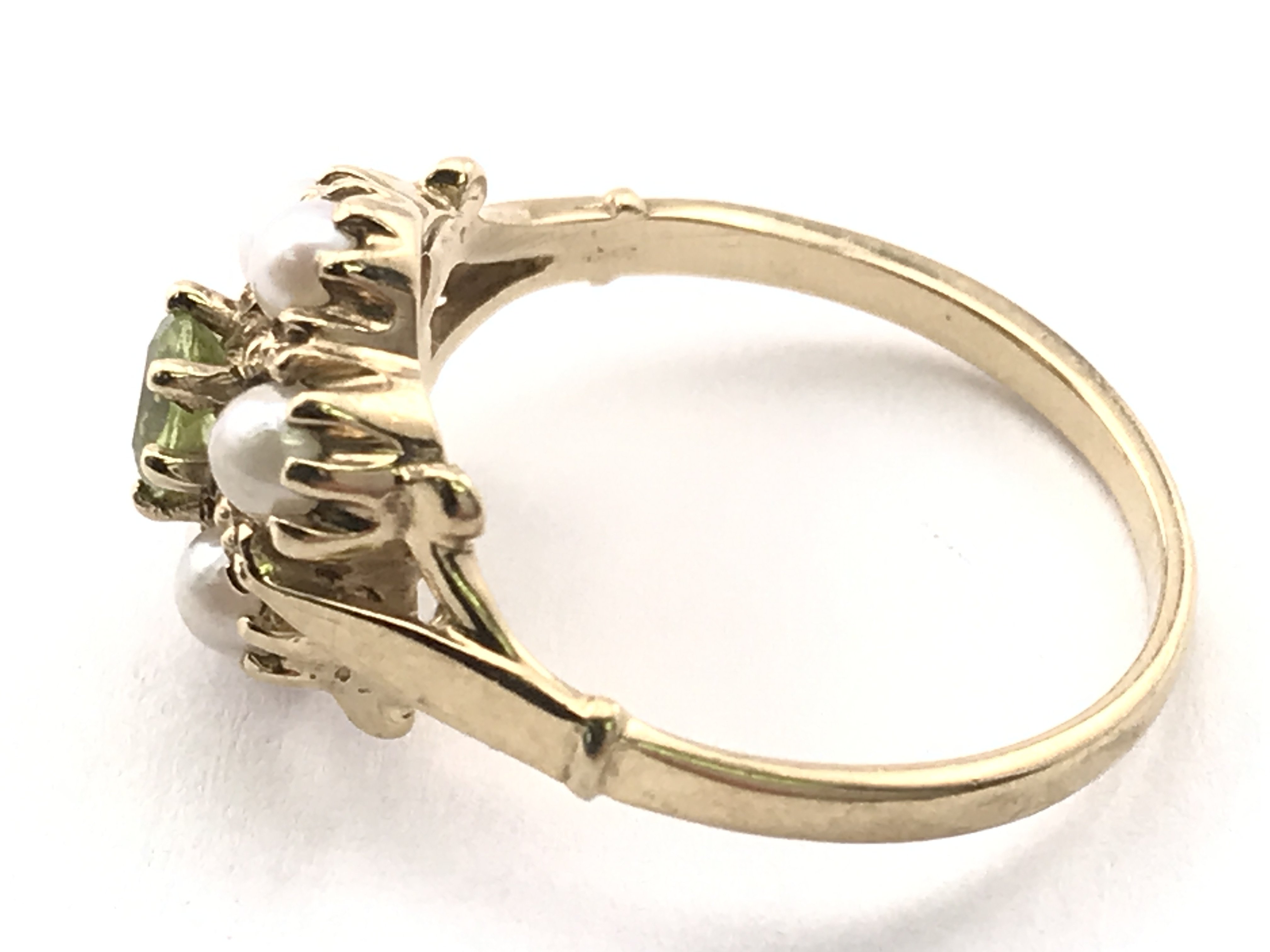A 9ct gold Pearl and peridot set ring , total weight 2.3g , ring size M/N. Postage category A