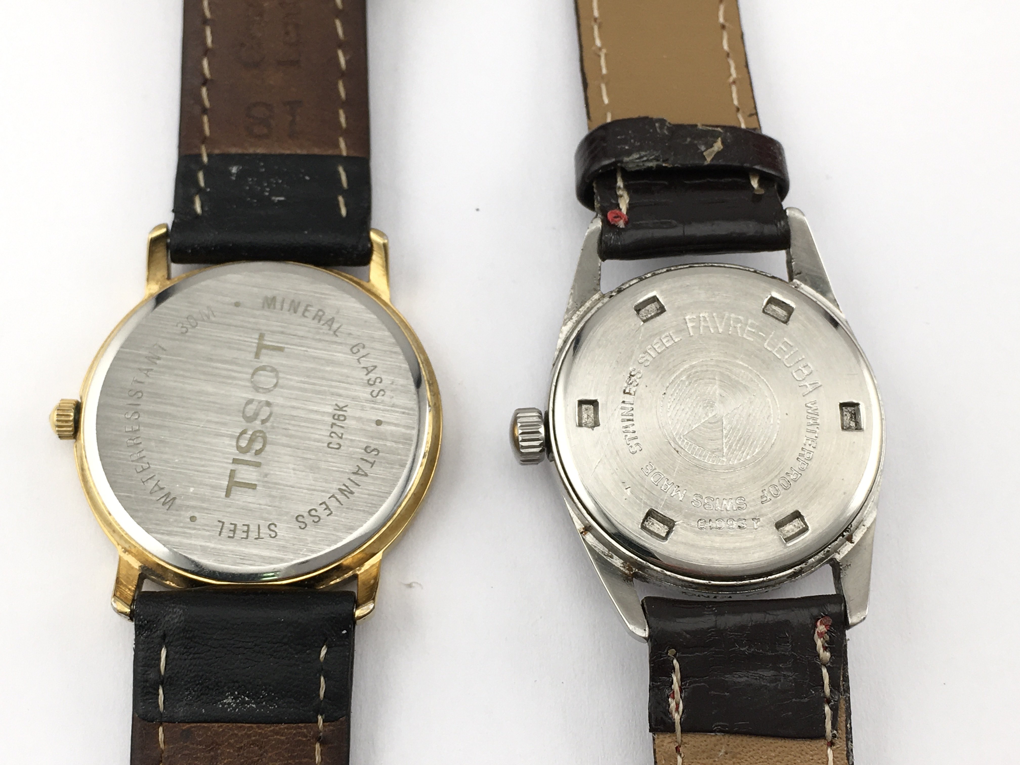 A Tissot watch with black leather strap and box and a vintage Favre Leuba sea king watch. Neither need running. Postage B