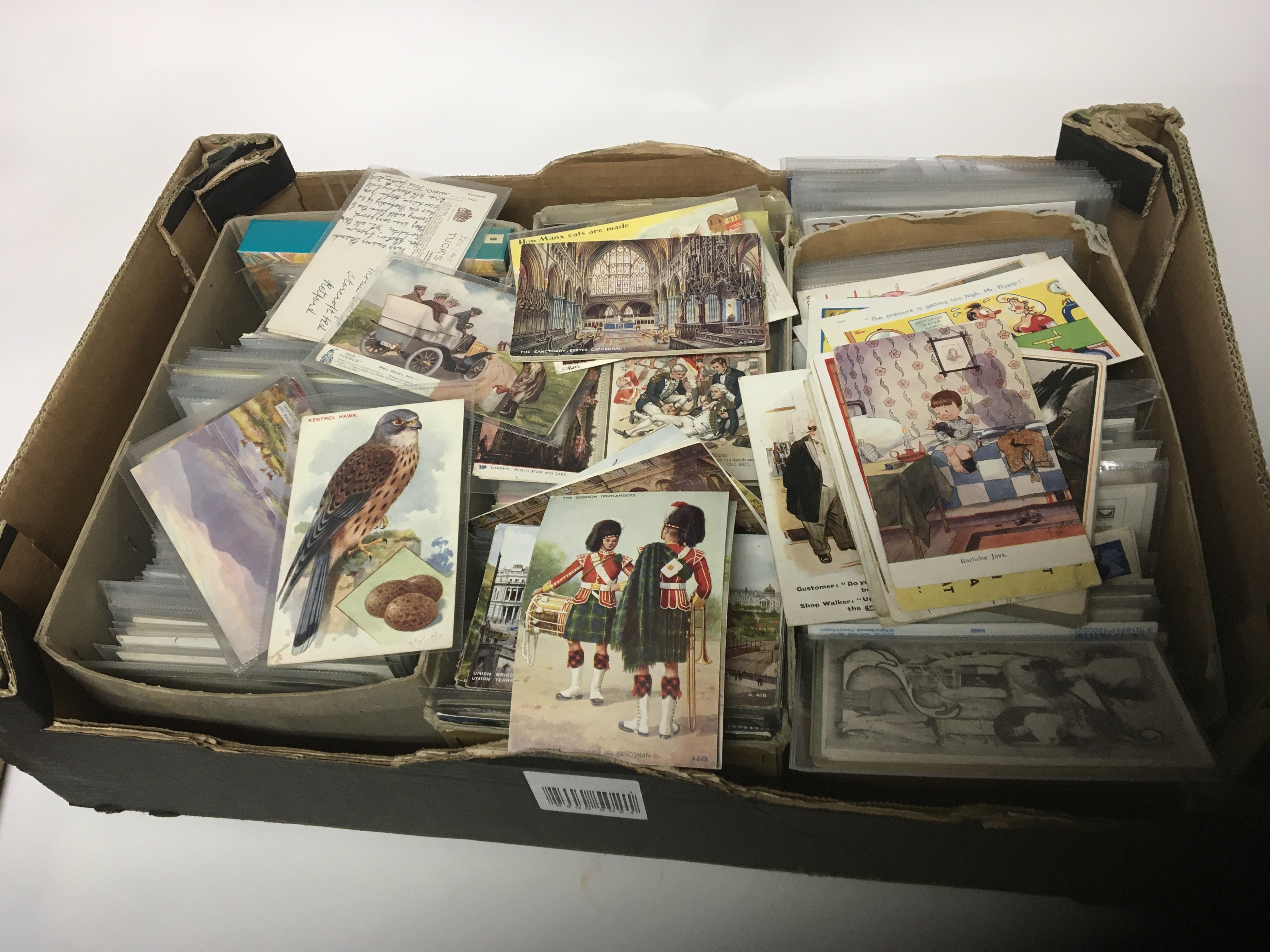 A box containing a good selection of Postcards Including vintage commercial cards Celesque cards Tuck and lots of George V stamped used postcards landscapes monuments some in plastic sleeves.