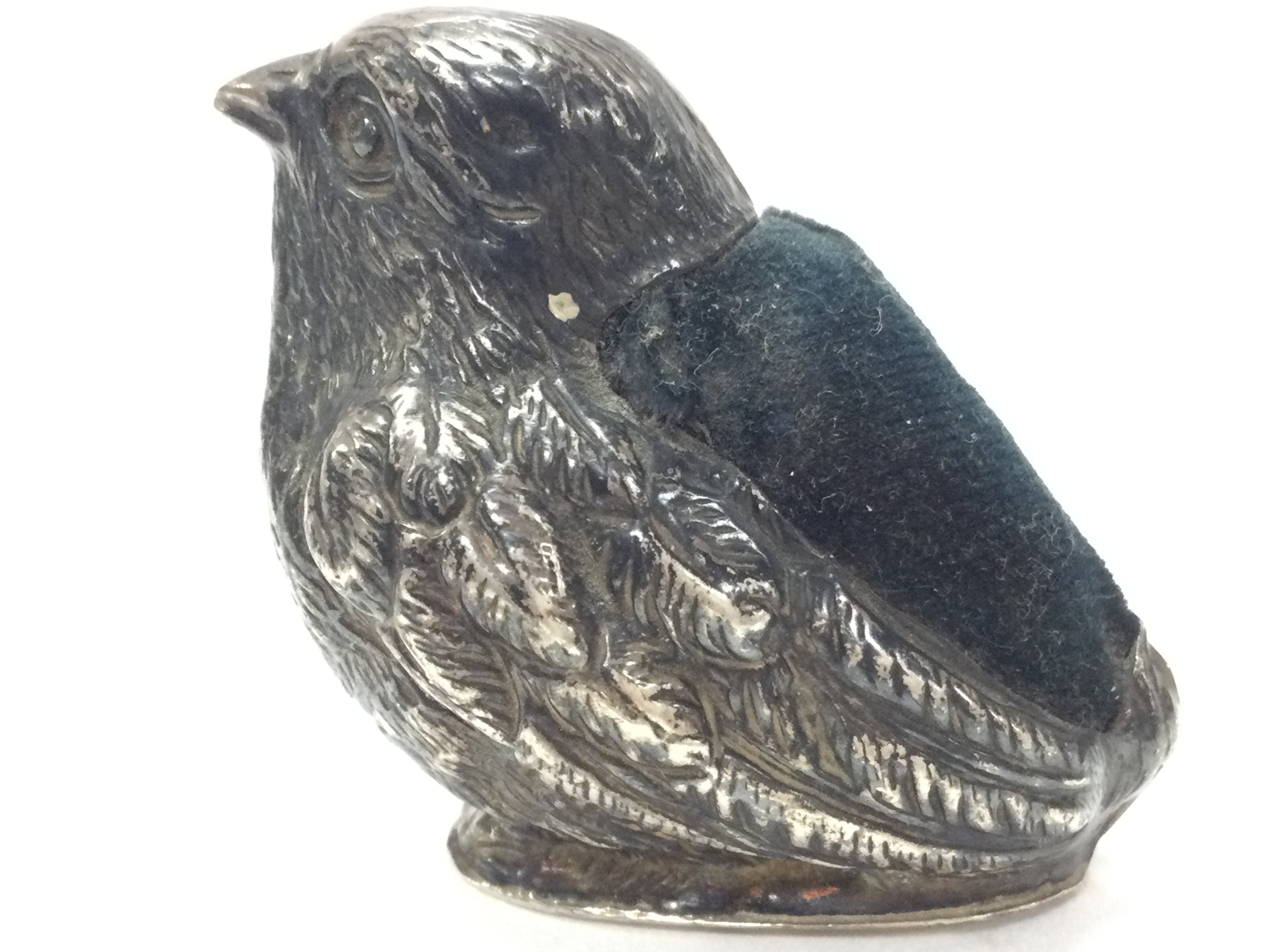 A 1906 silver Chester hallmarked bird pin cushion by Sampson and Mordan. 3.5cm tall. Postage category A