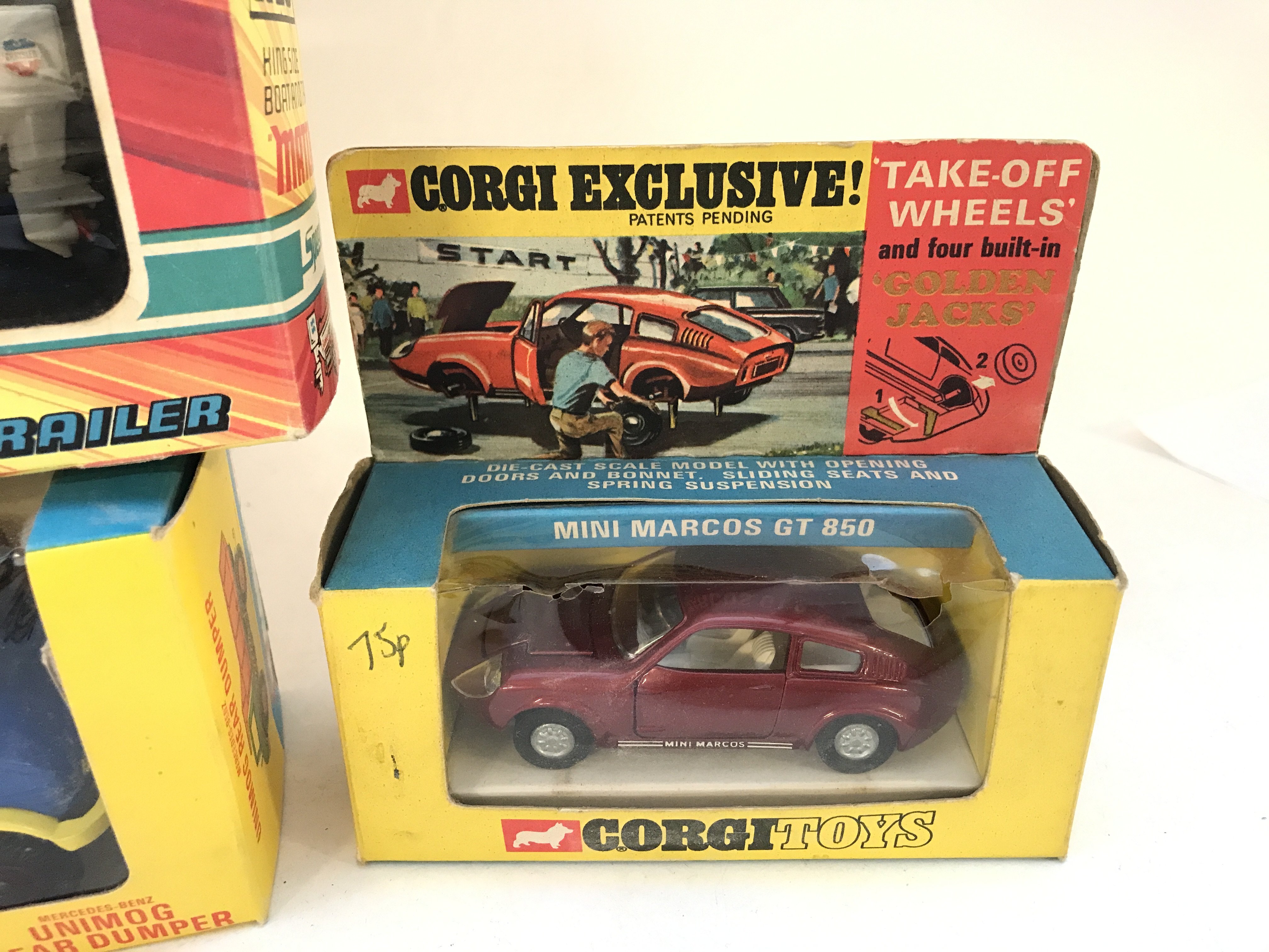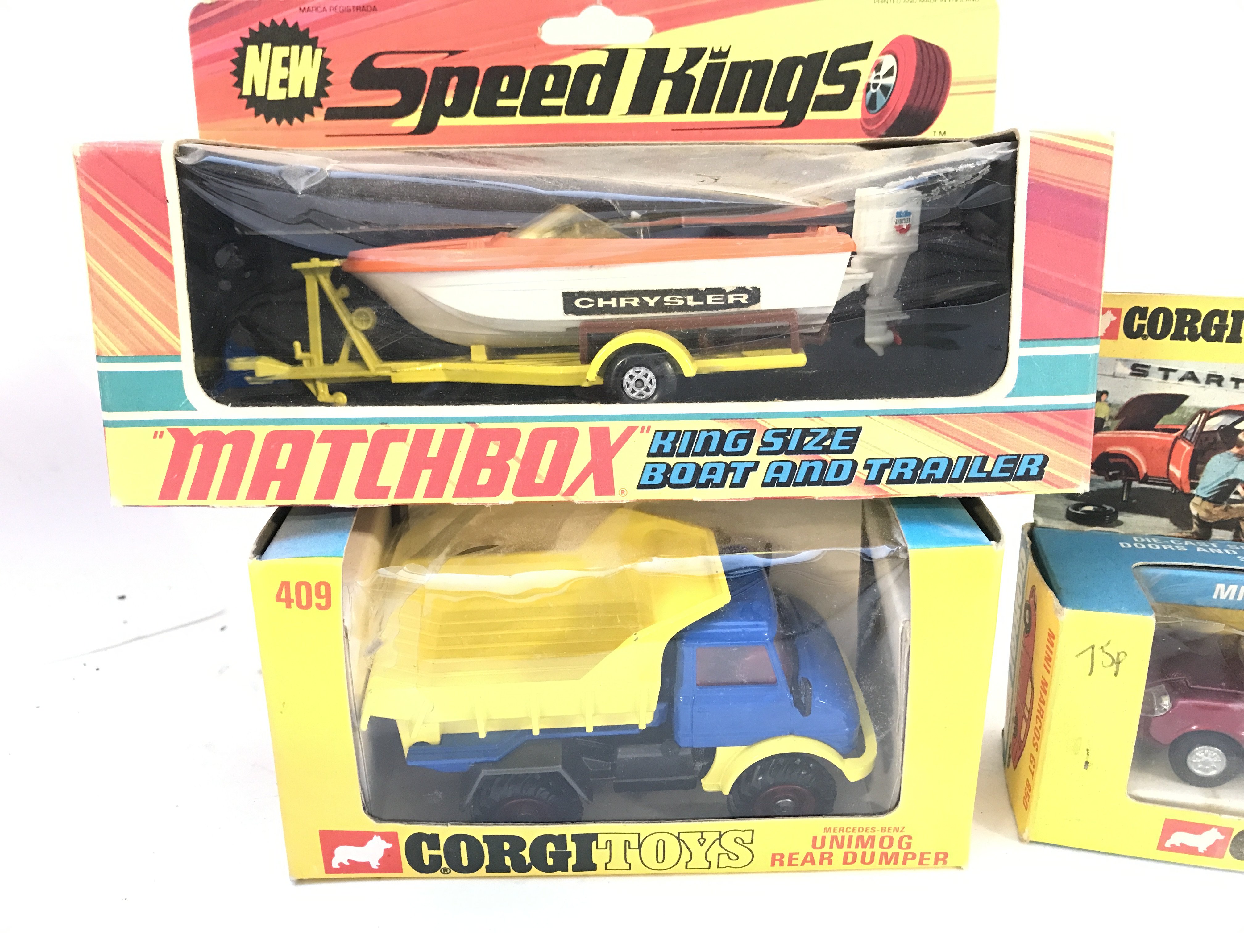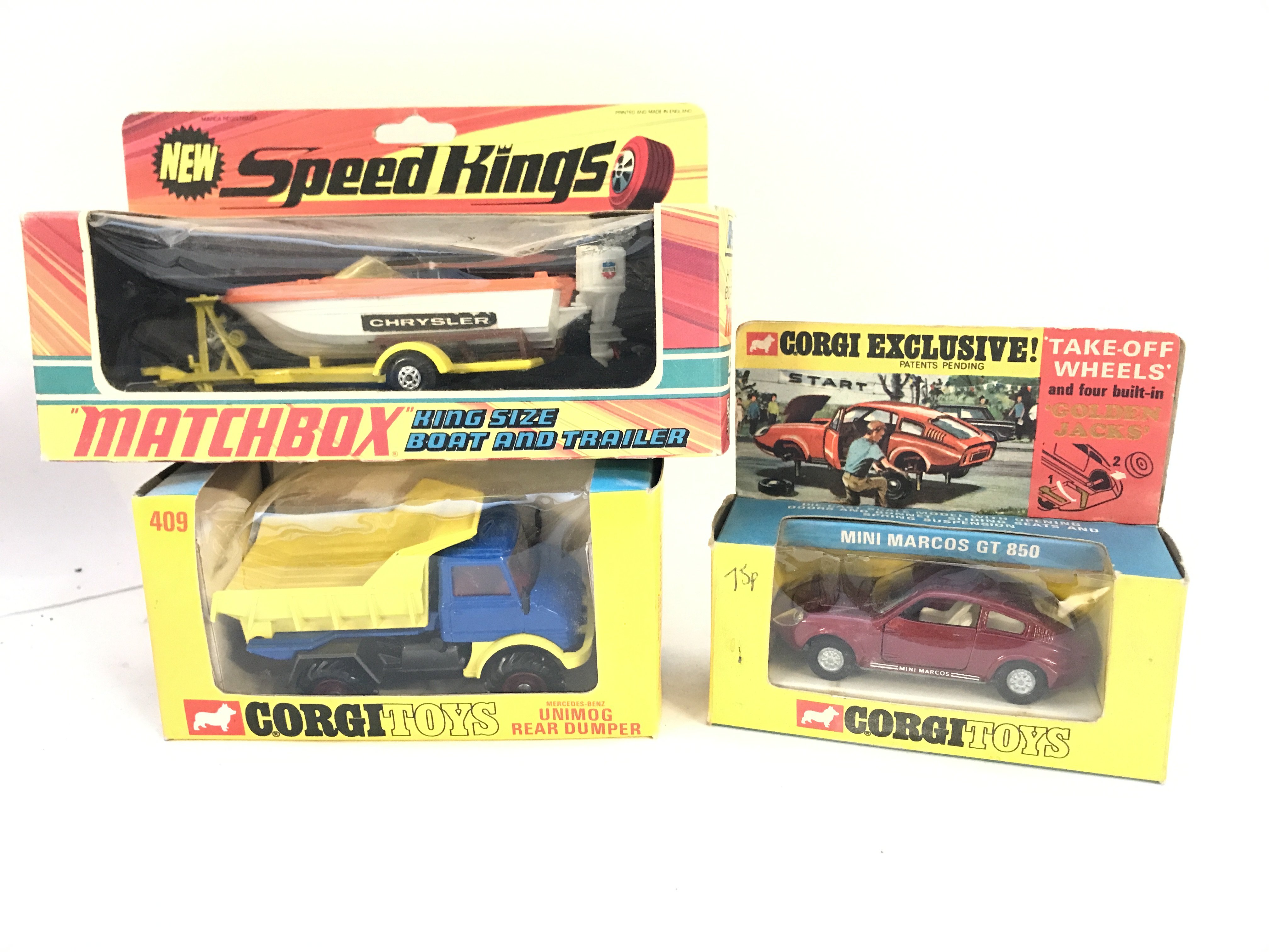 A Boxed Corgi Unimog Rear Dumper #409. A Mini Marcos GT 850 and a Matchbox King Size Boat And Trailer #K-25.