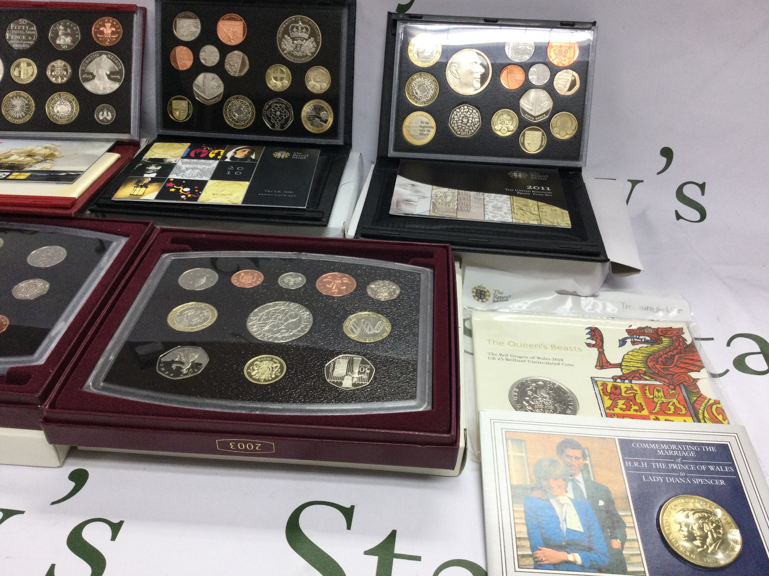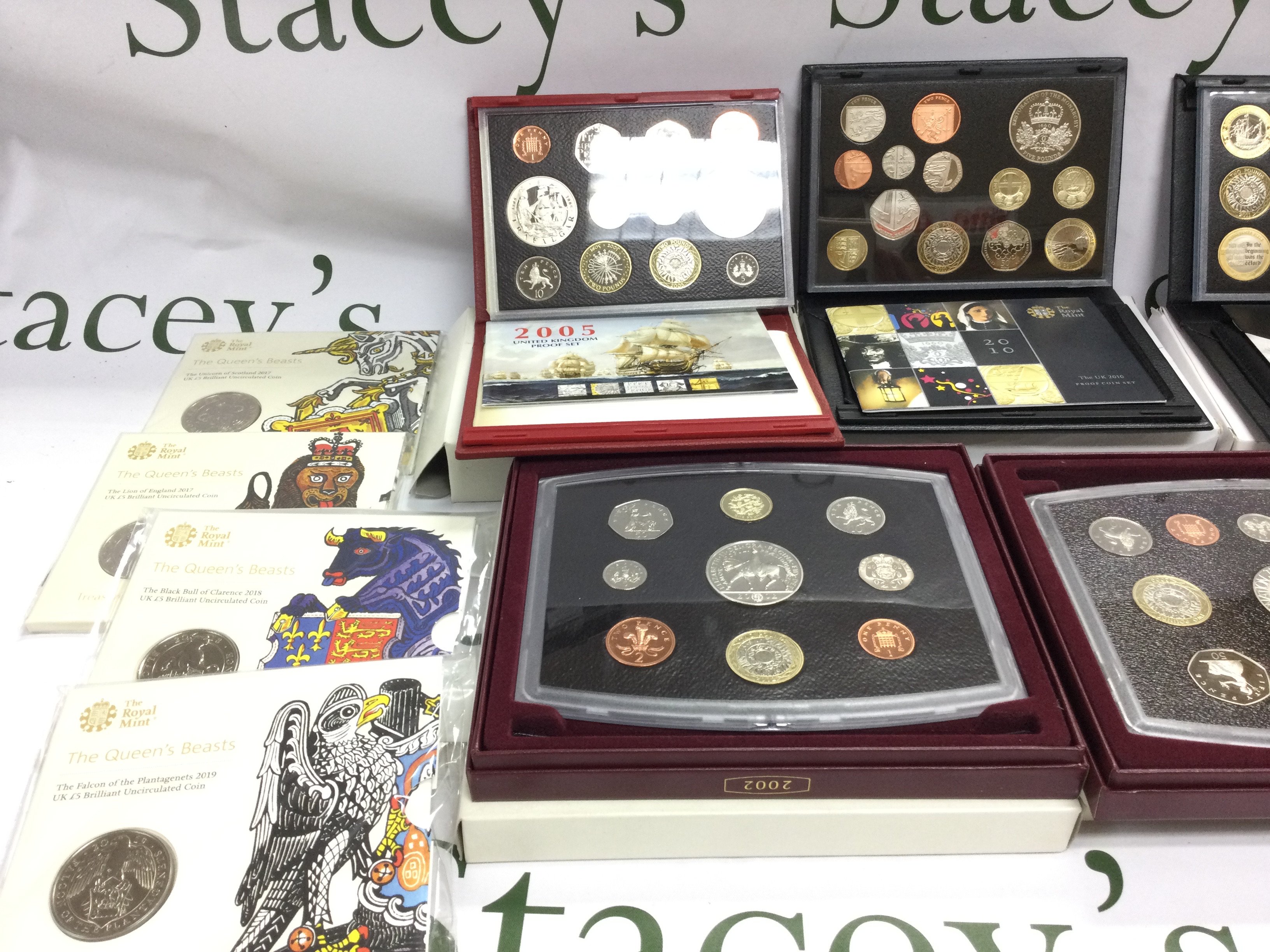 A collection of 5 United Kingdom proof coin sets and 5 queen beast £5coins etc. Postage B