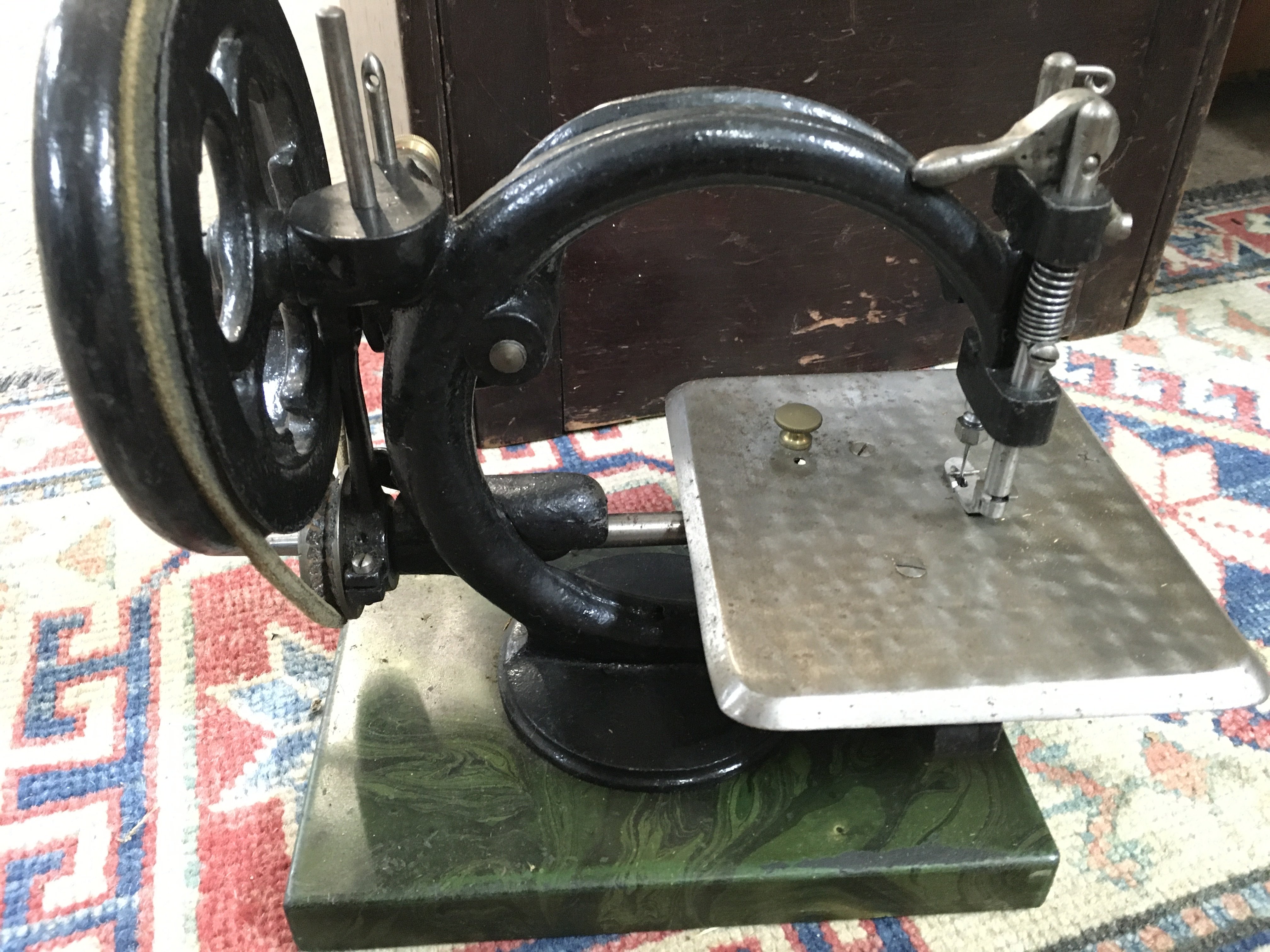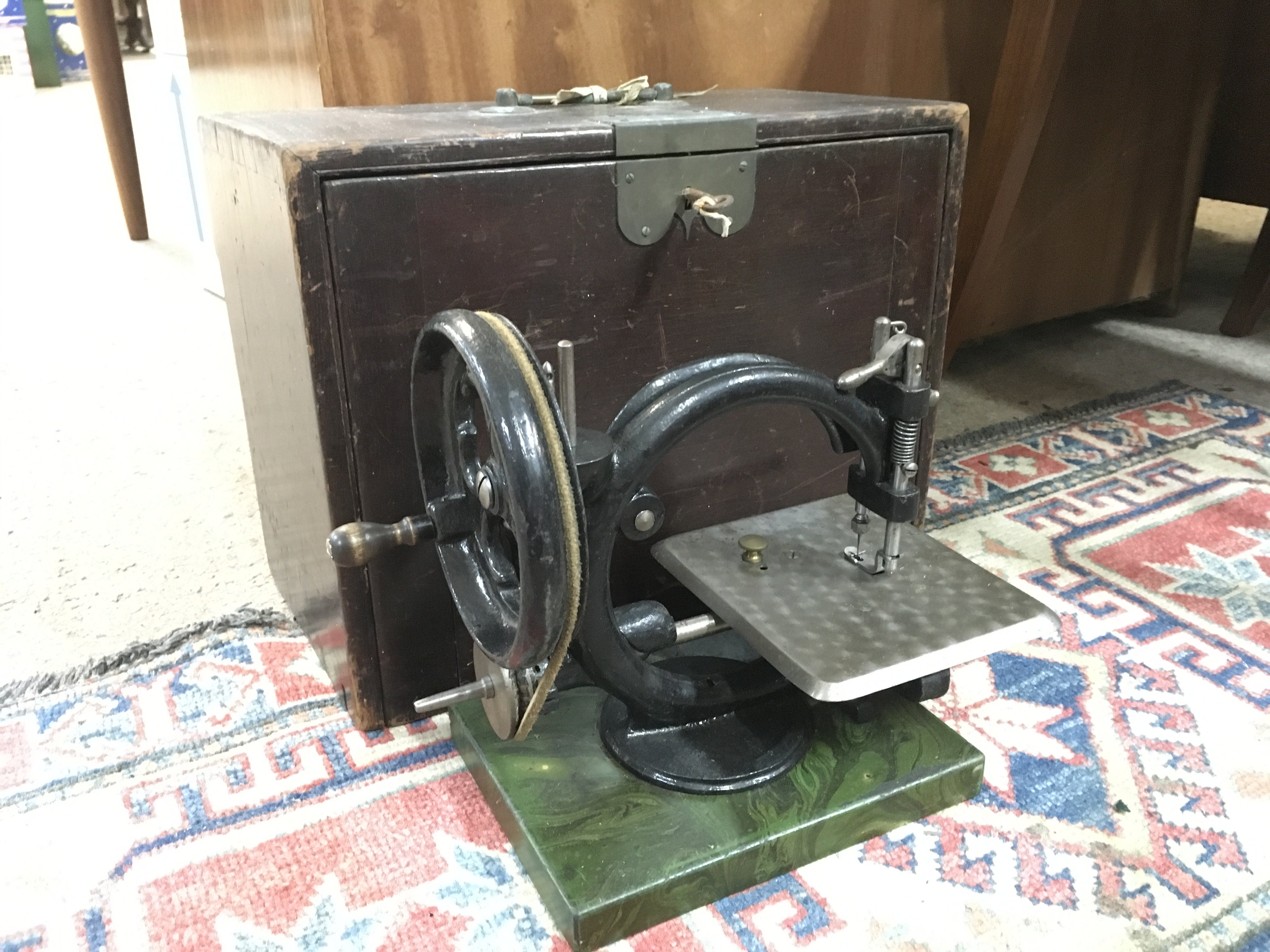 A vintage cased hand crank cast iron sewing machine. This lot cannot be posted