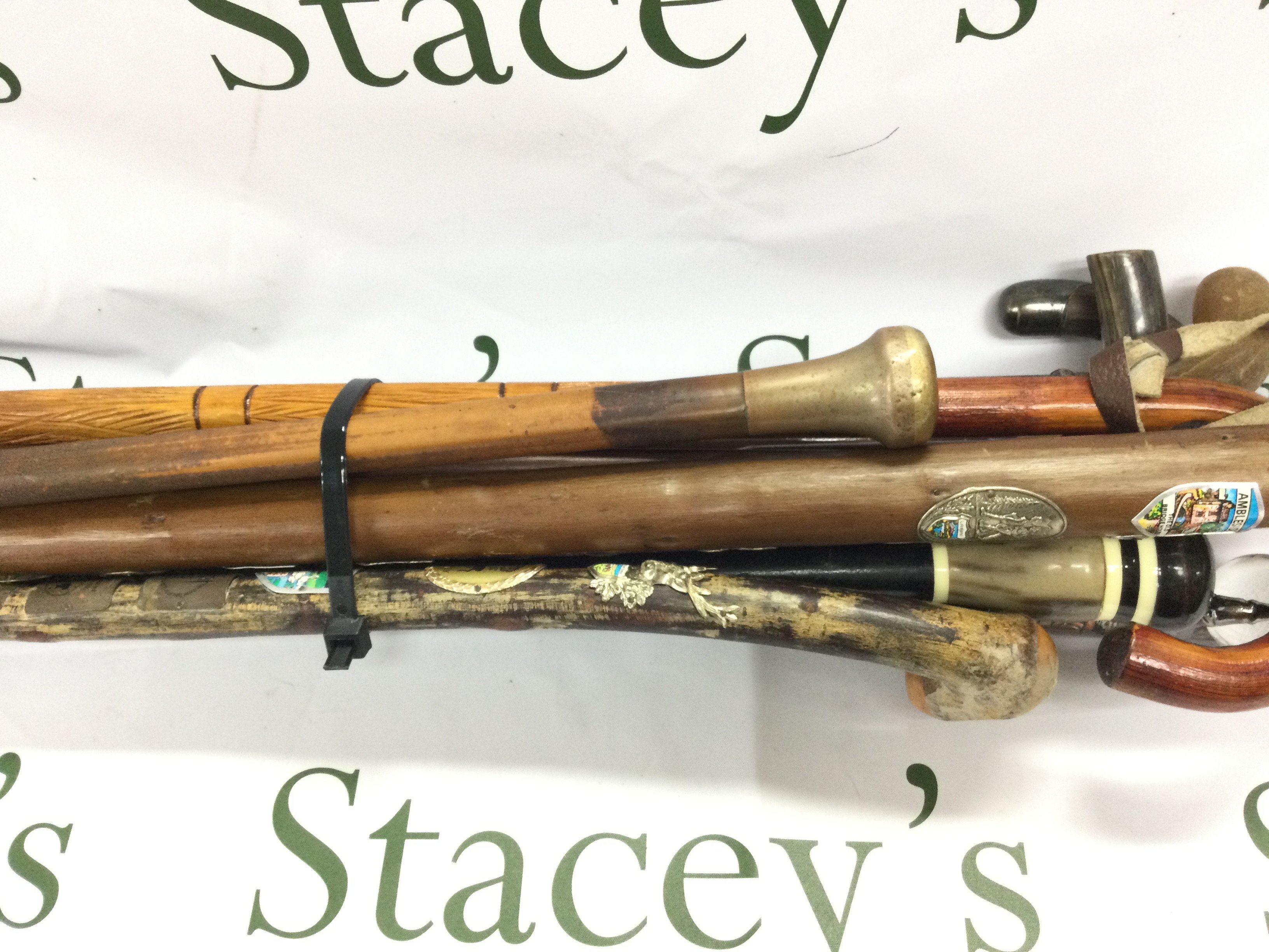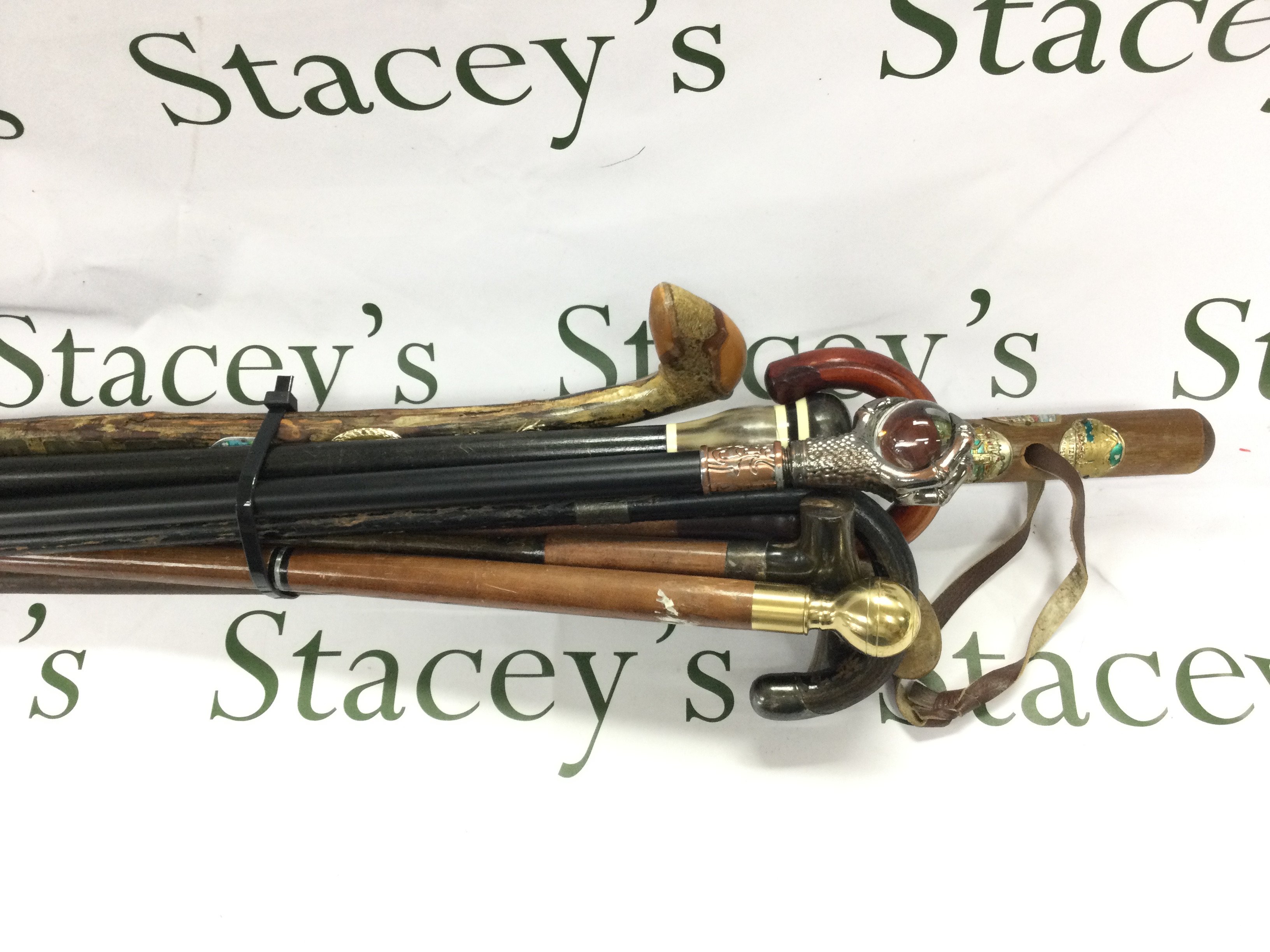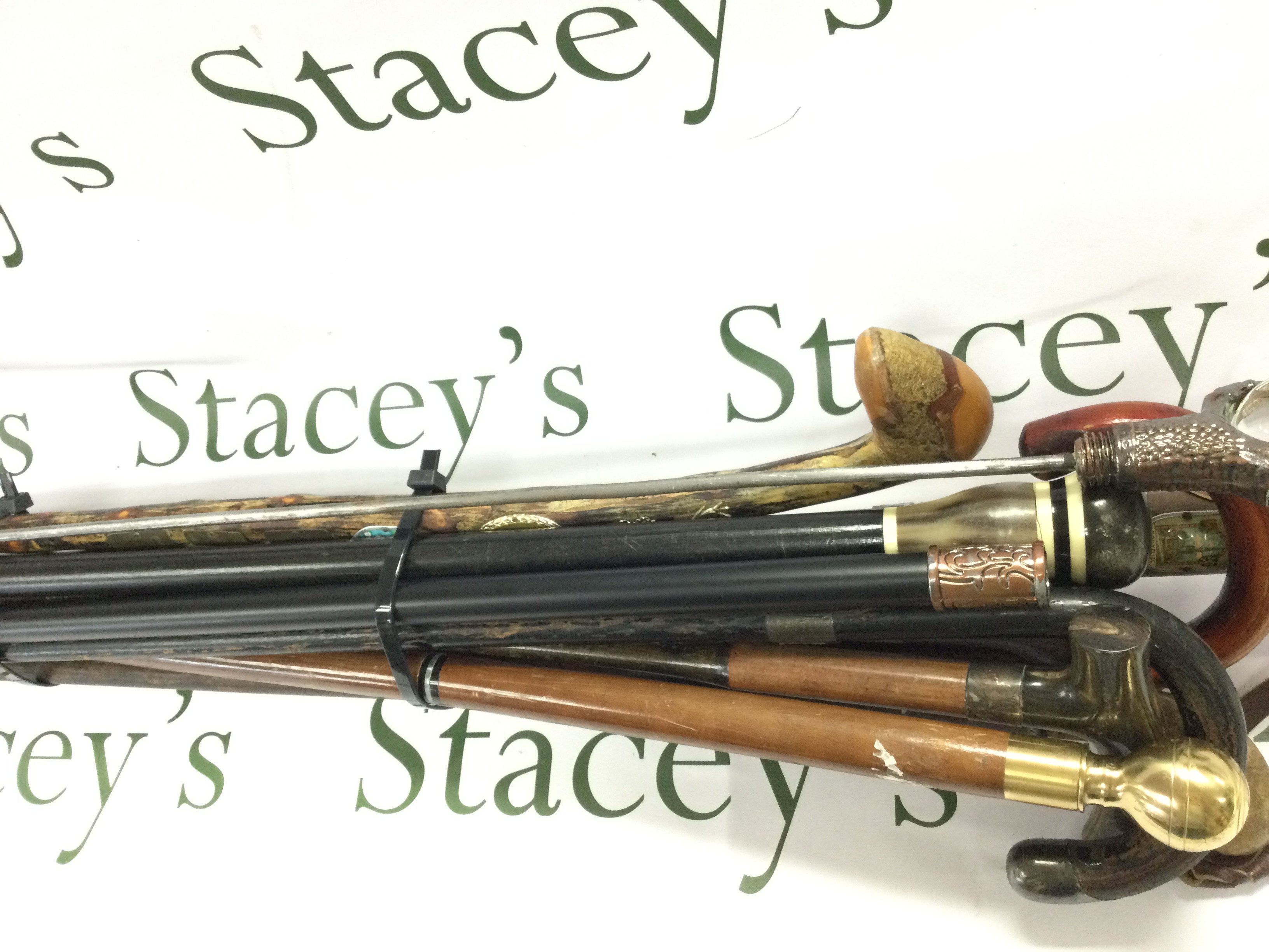A collection of various aged walking sticks including a sword stick.