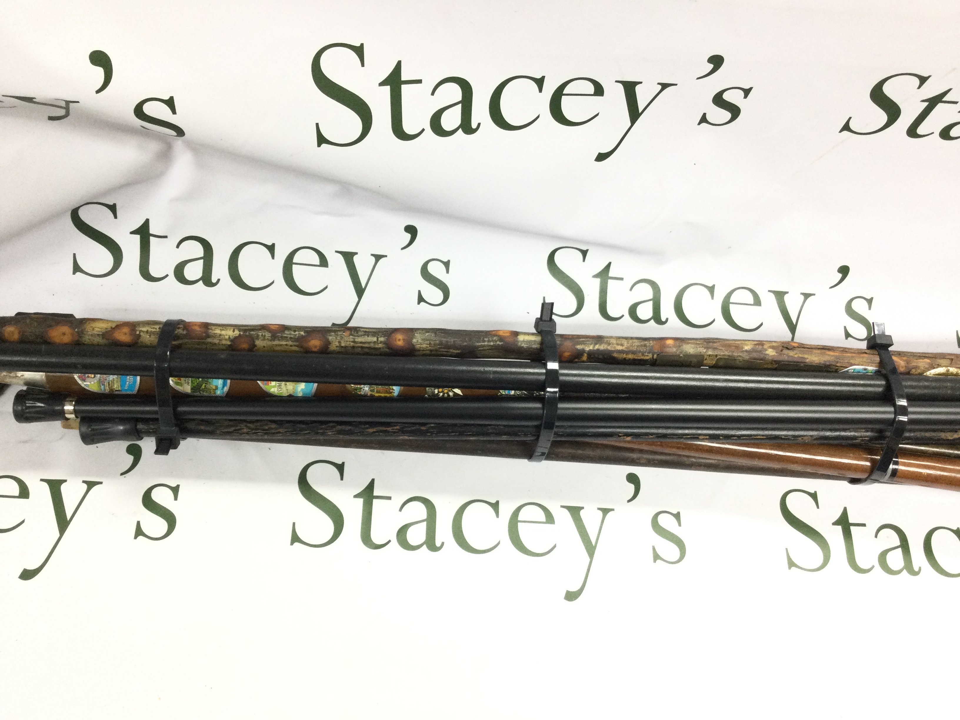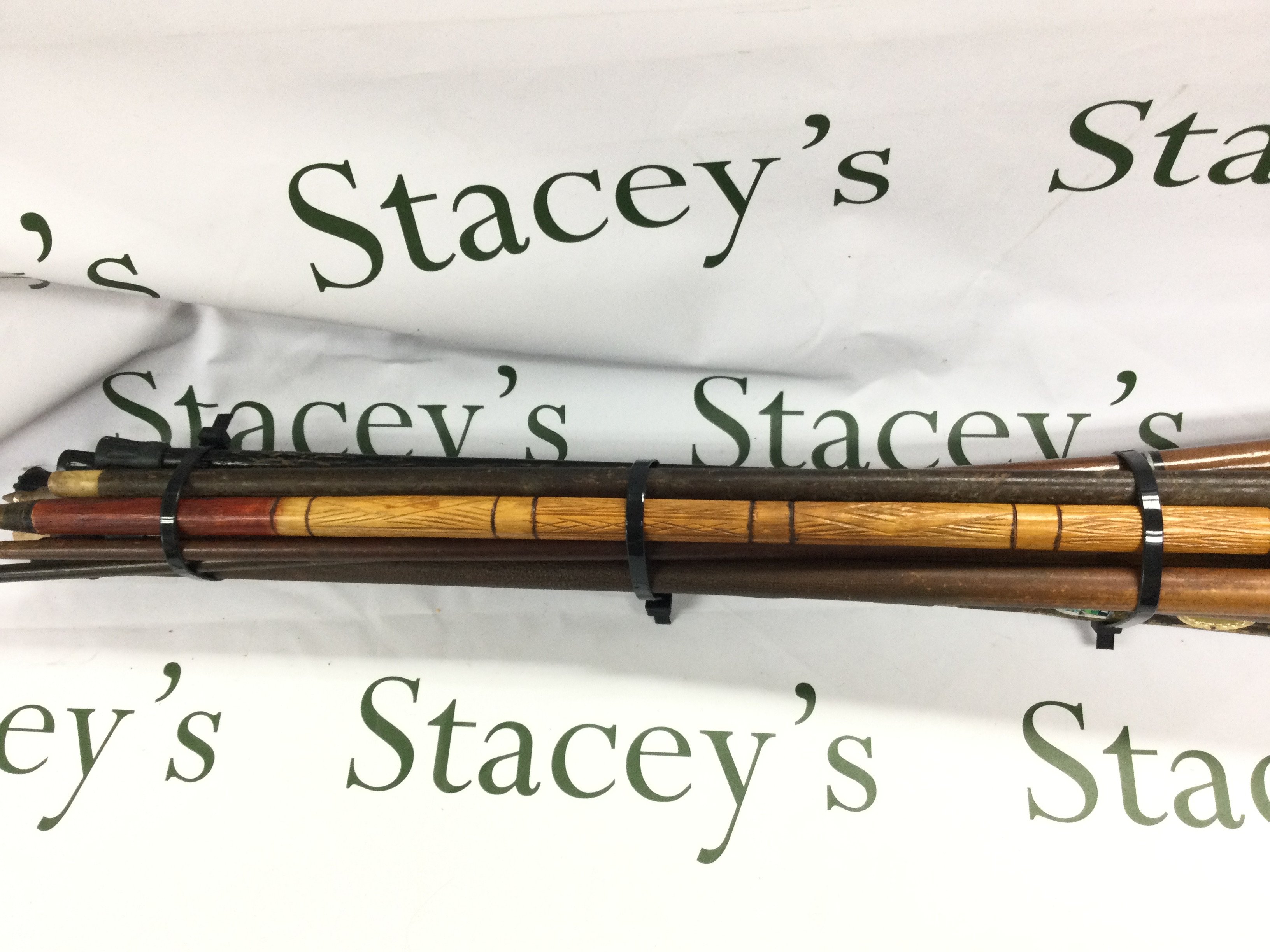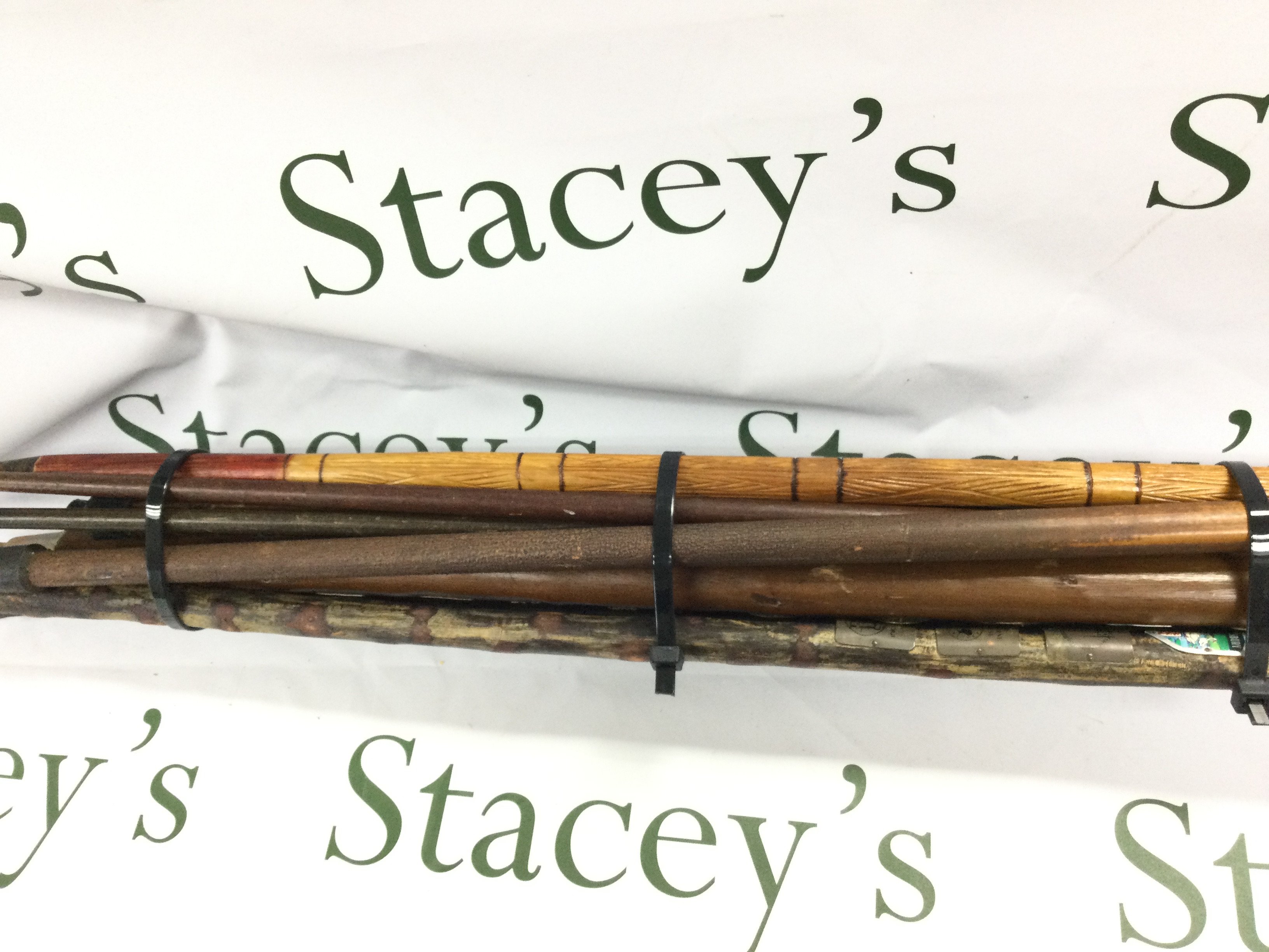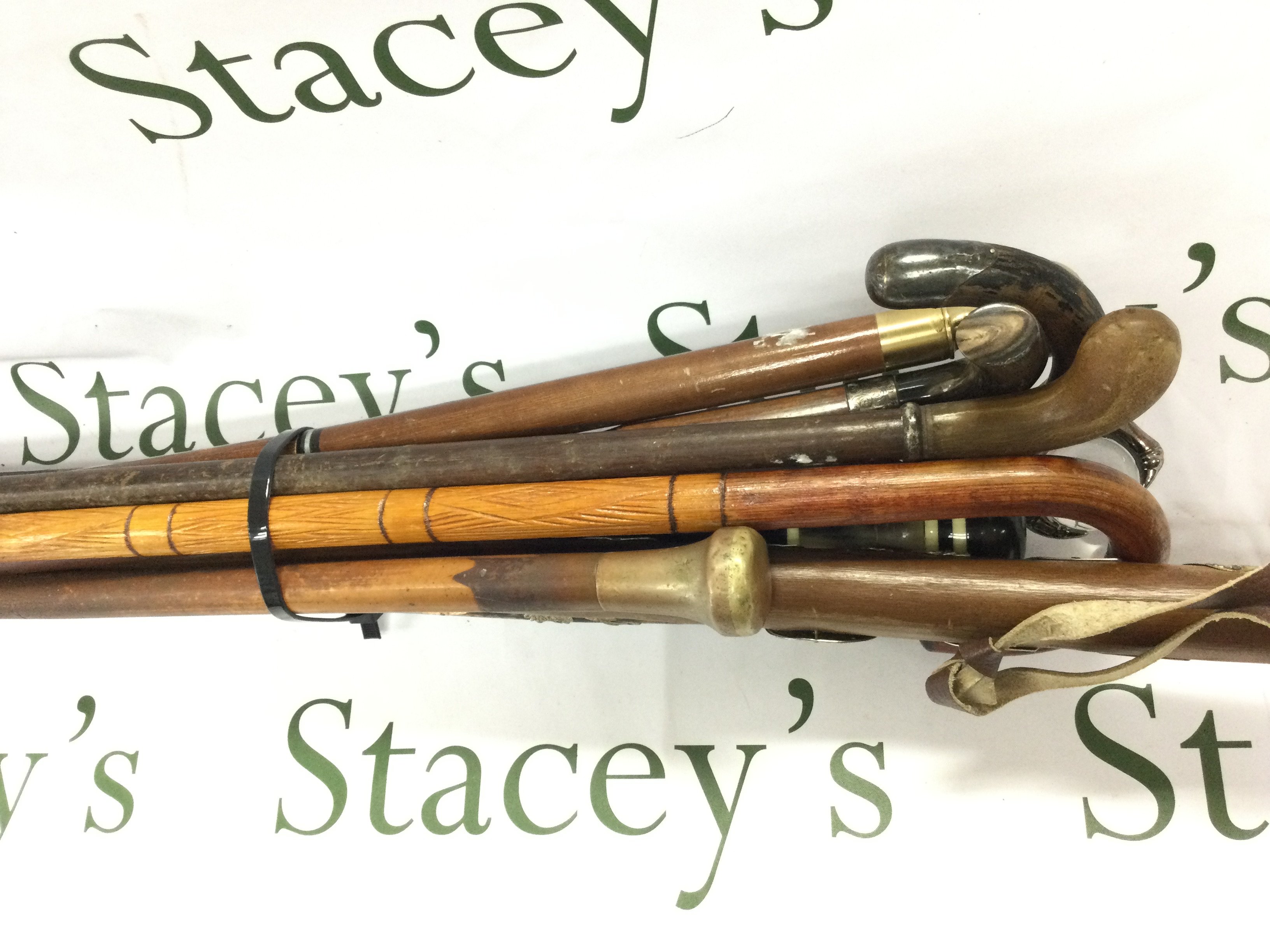 A collection of various aged walking sticks including a sword stick.