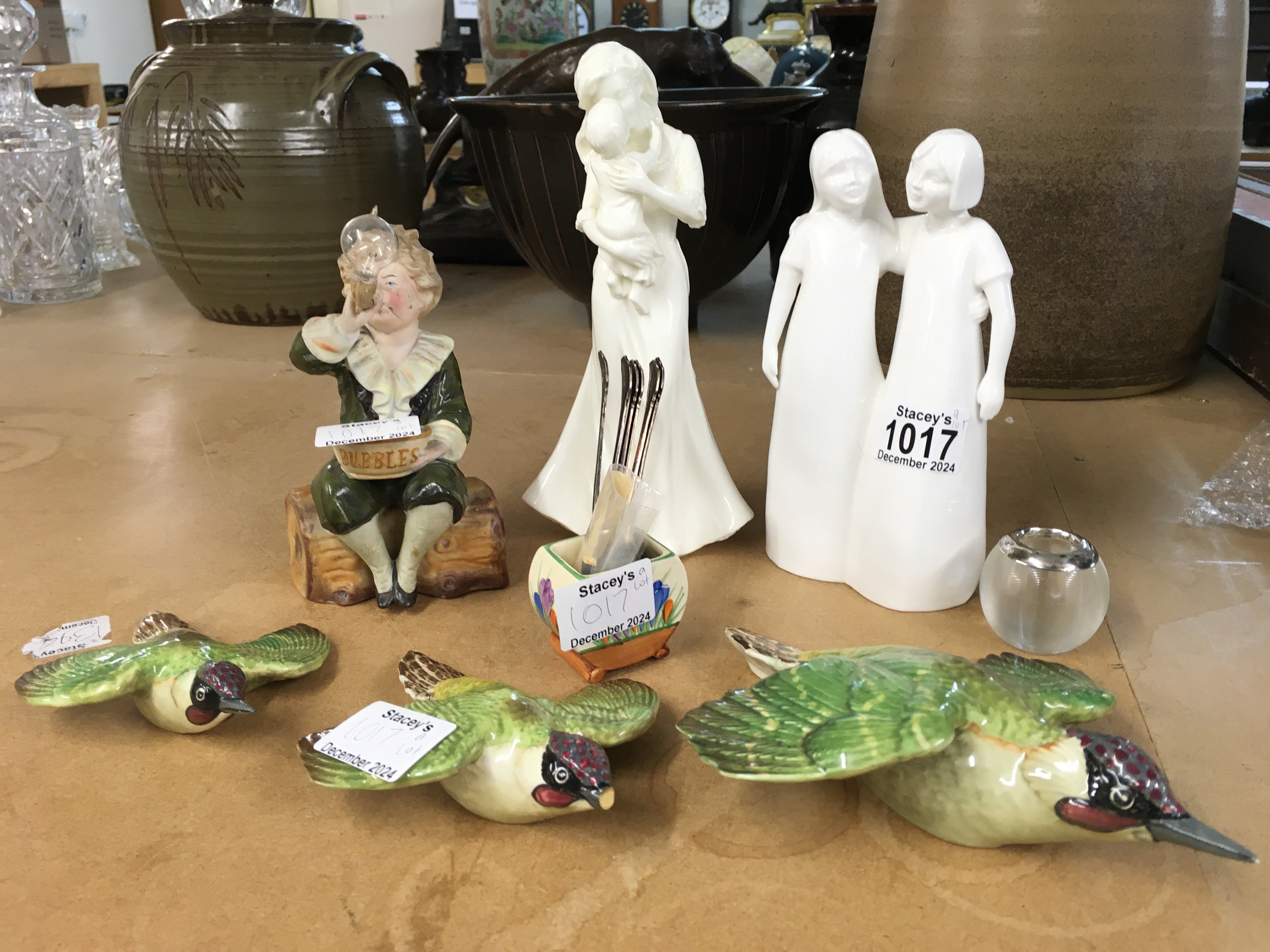 A Collection of porcelain figures including Worcester, Beswick kingfisher figures (one with damaged beak), silver hallmarked spoons, Clarice Cliff salt pot etc. this lot cannot be posted