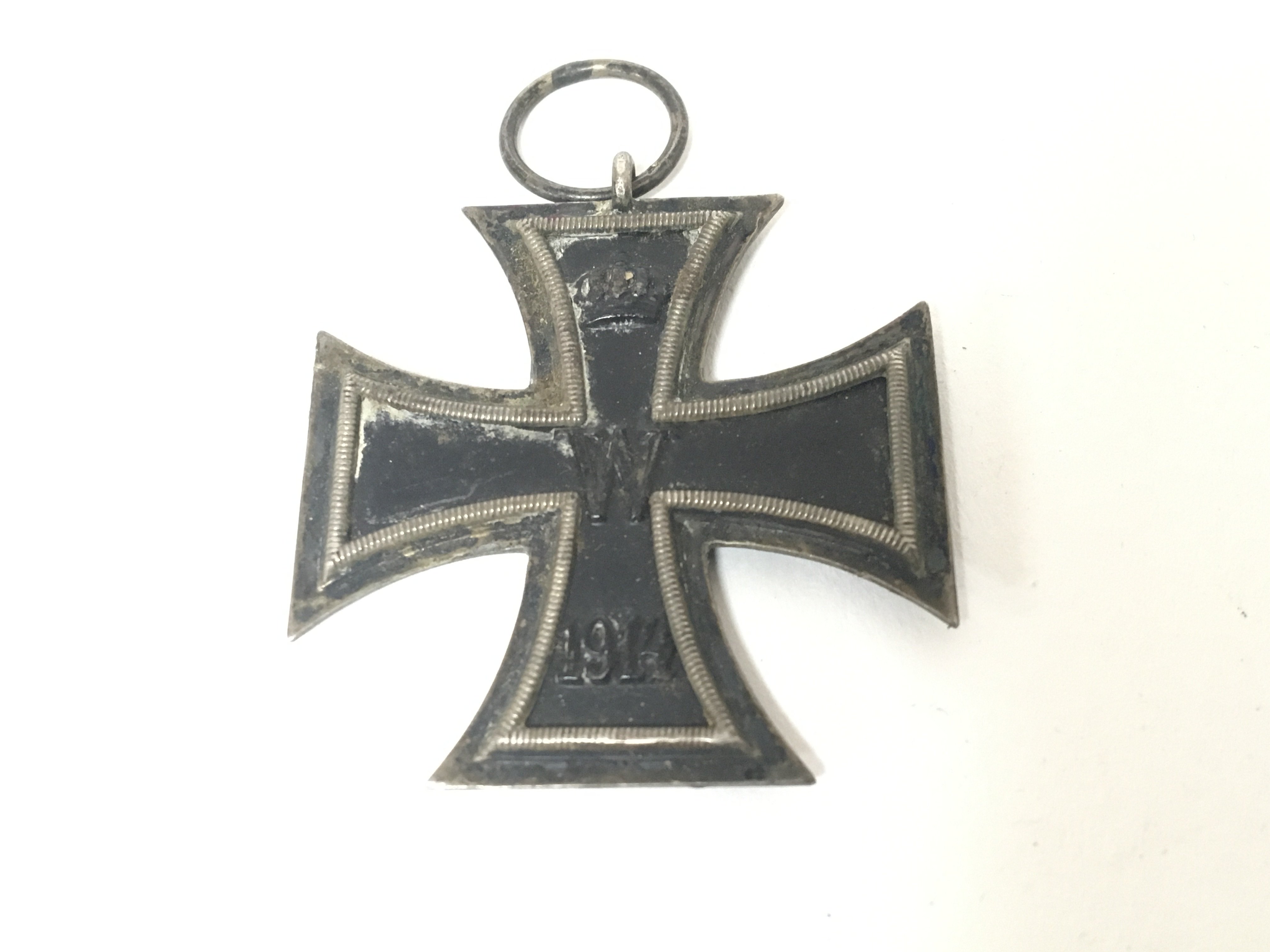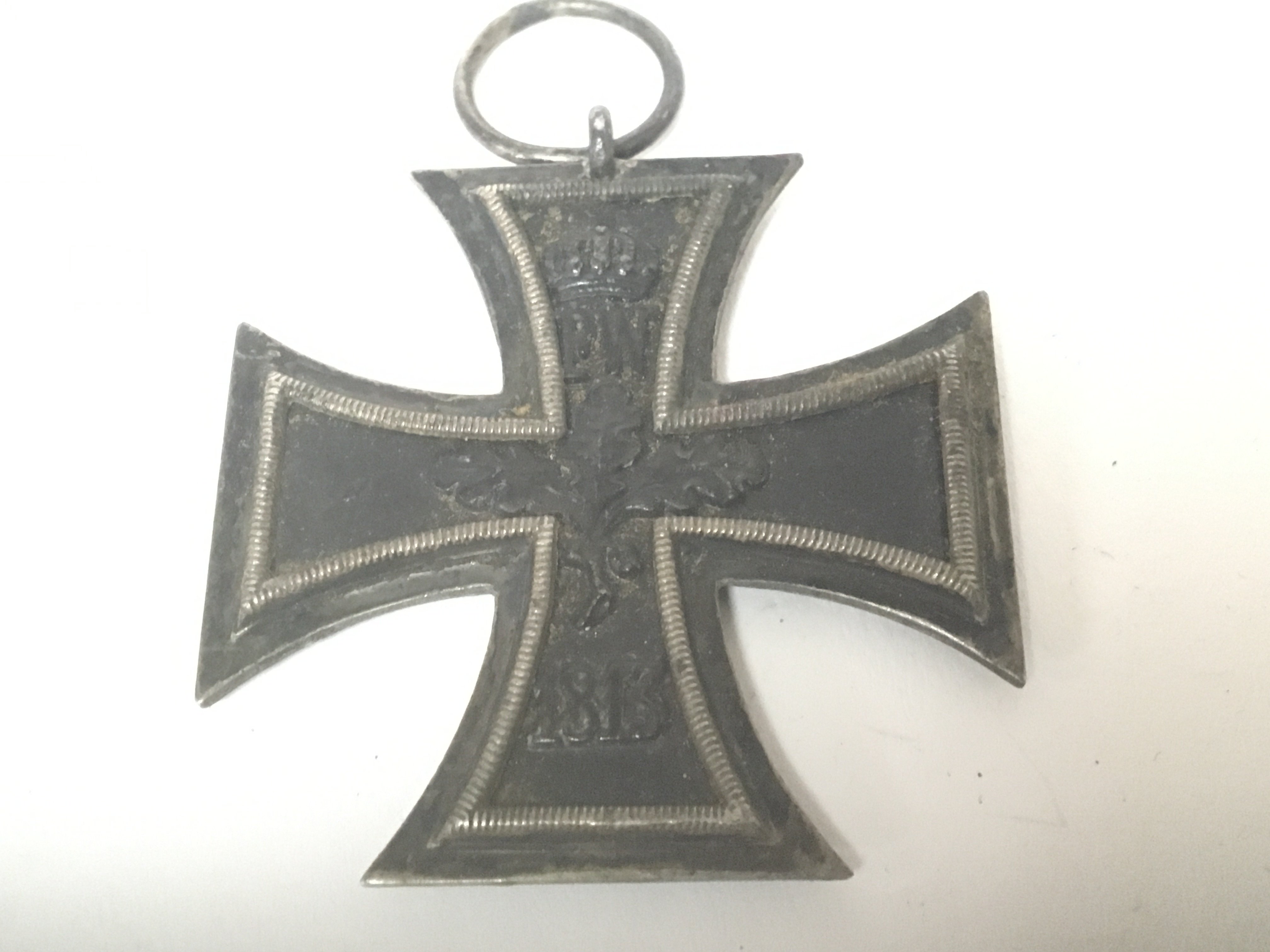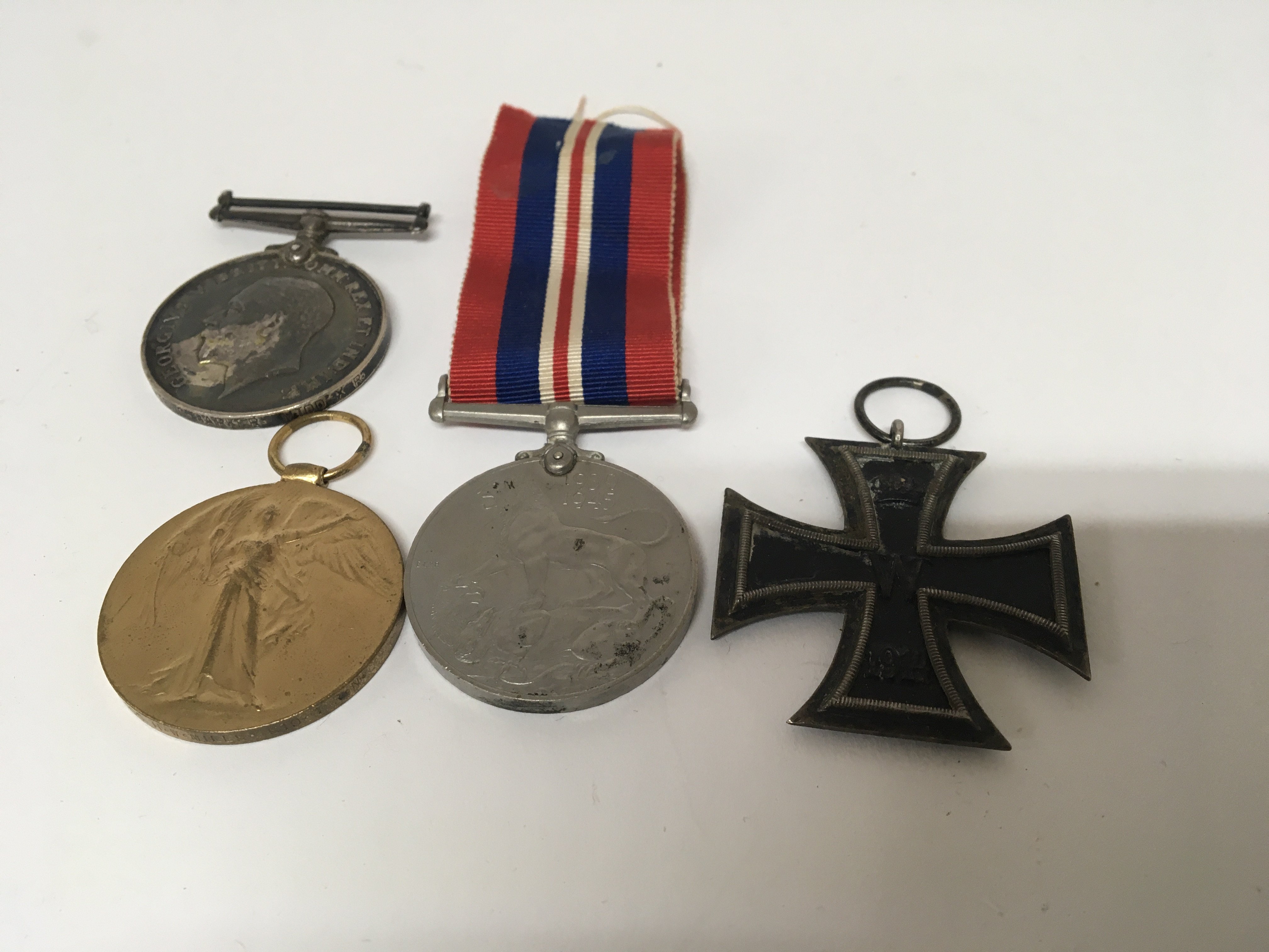 A German Imperial iron Cross 1813/1914. Two First World War medals awarded to 427 Pte G Barker midd x R also one other awarded to SS.100105 HW Mills STO 1 RN and a Second World War medal.