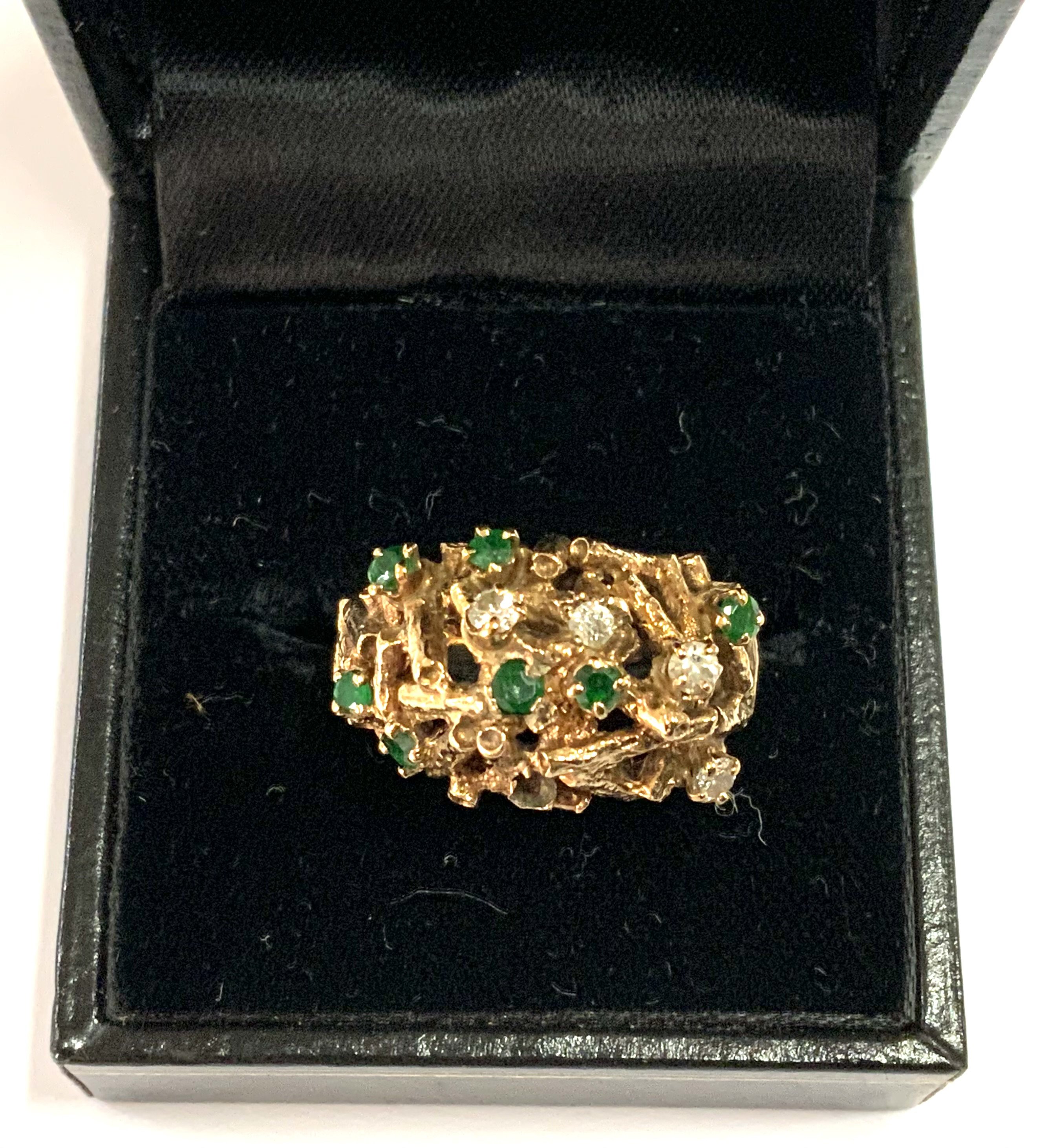 A 1970s cluster design 9ct gold emerald and diamond ring, 7.34g, Size N.5 (A) (1 stone missing).