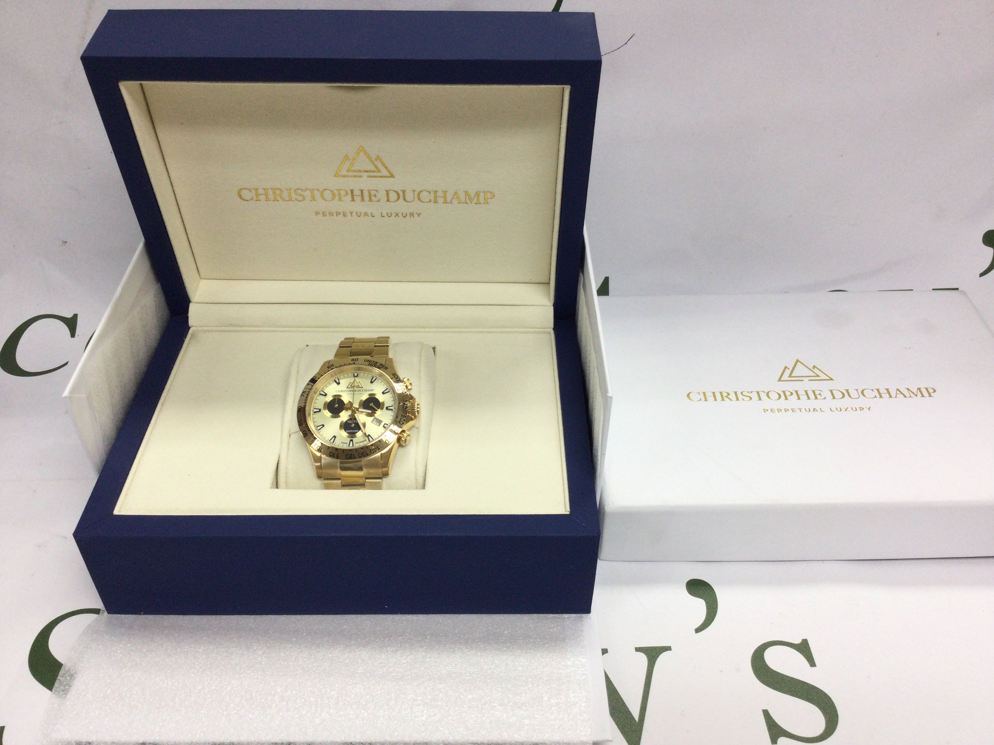 A gents Christophe Duchamp gold tone automatic wrist watch. In unworn condition and seen running. Postage B
