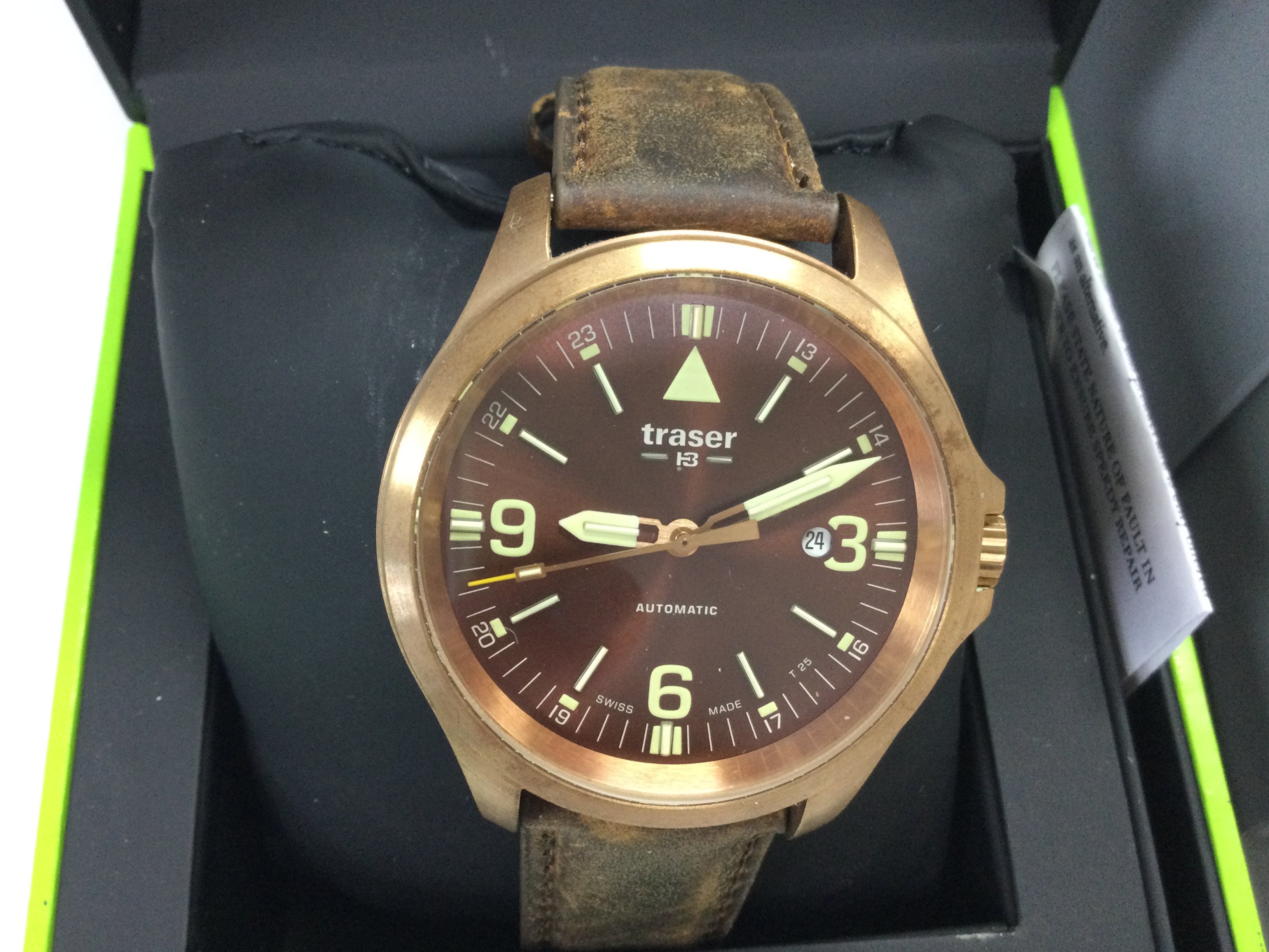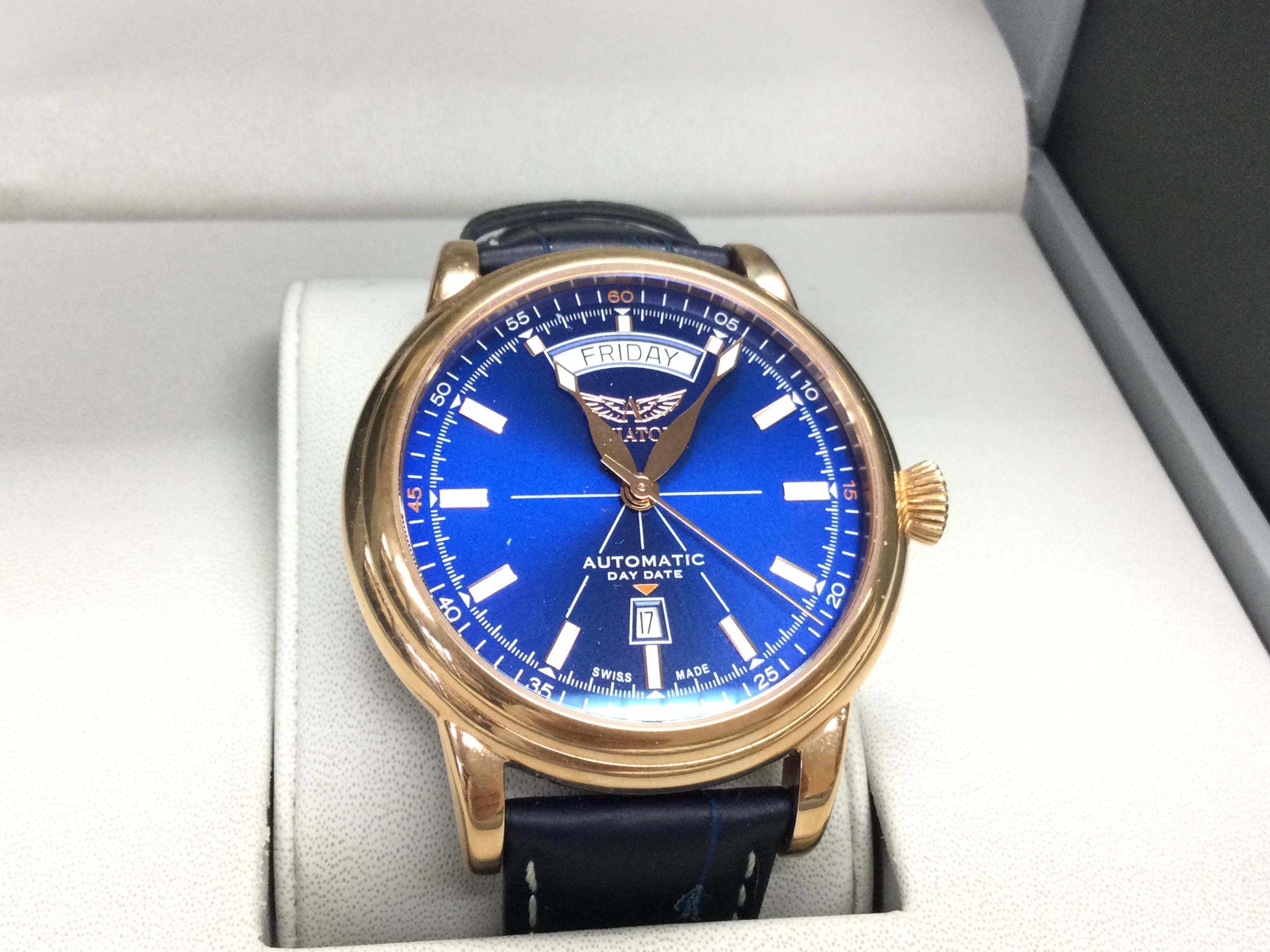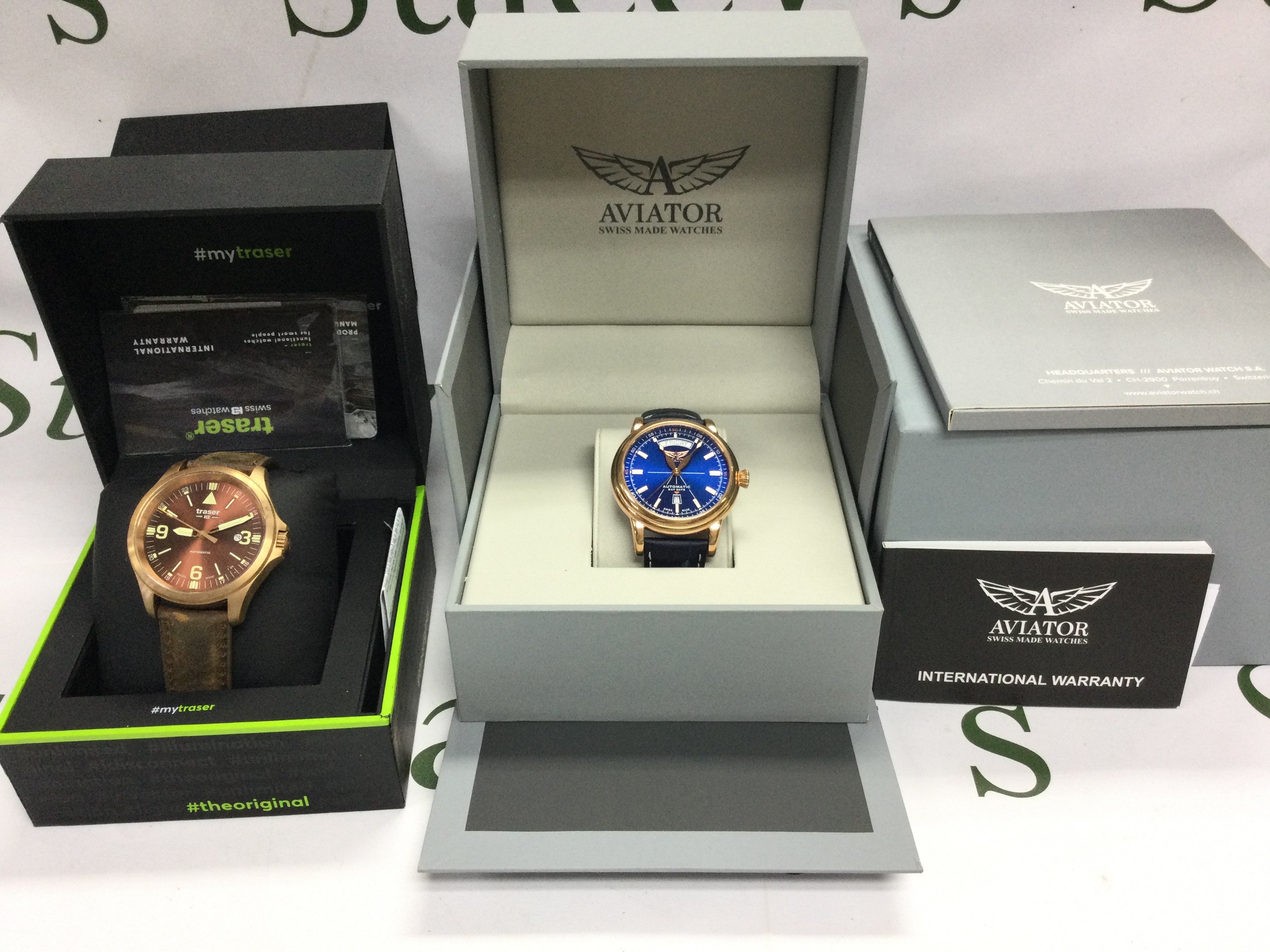 An Aviator Swiss made day date gents automatic watch and one other. Both in boxes with paperwork. Postage B