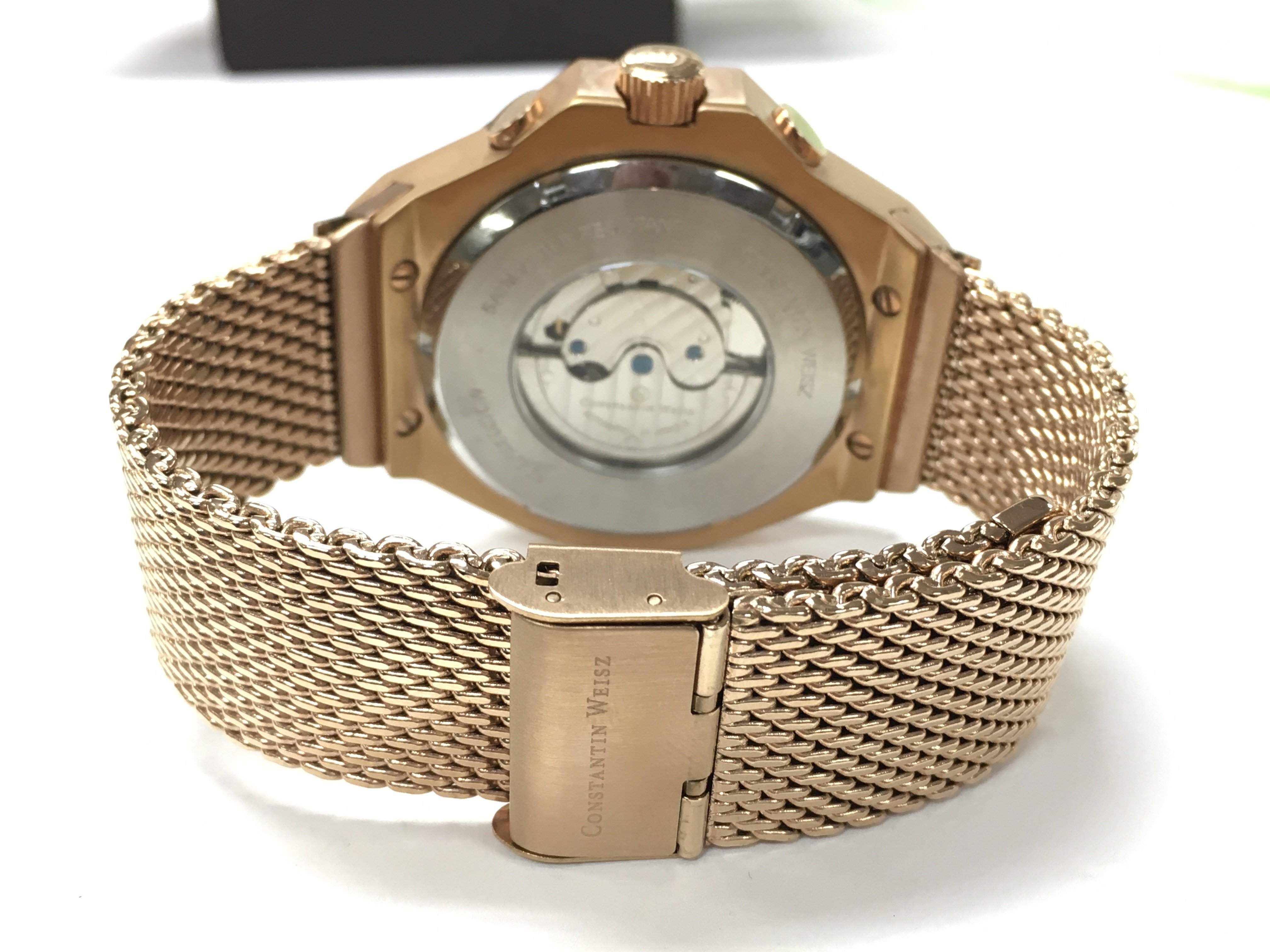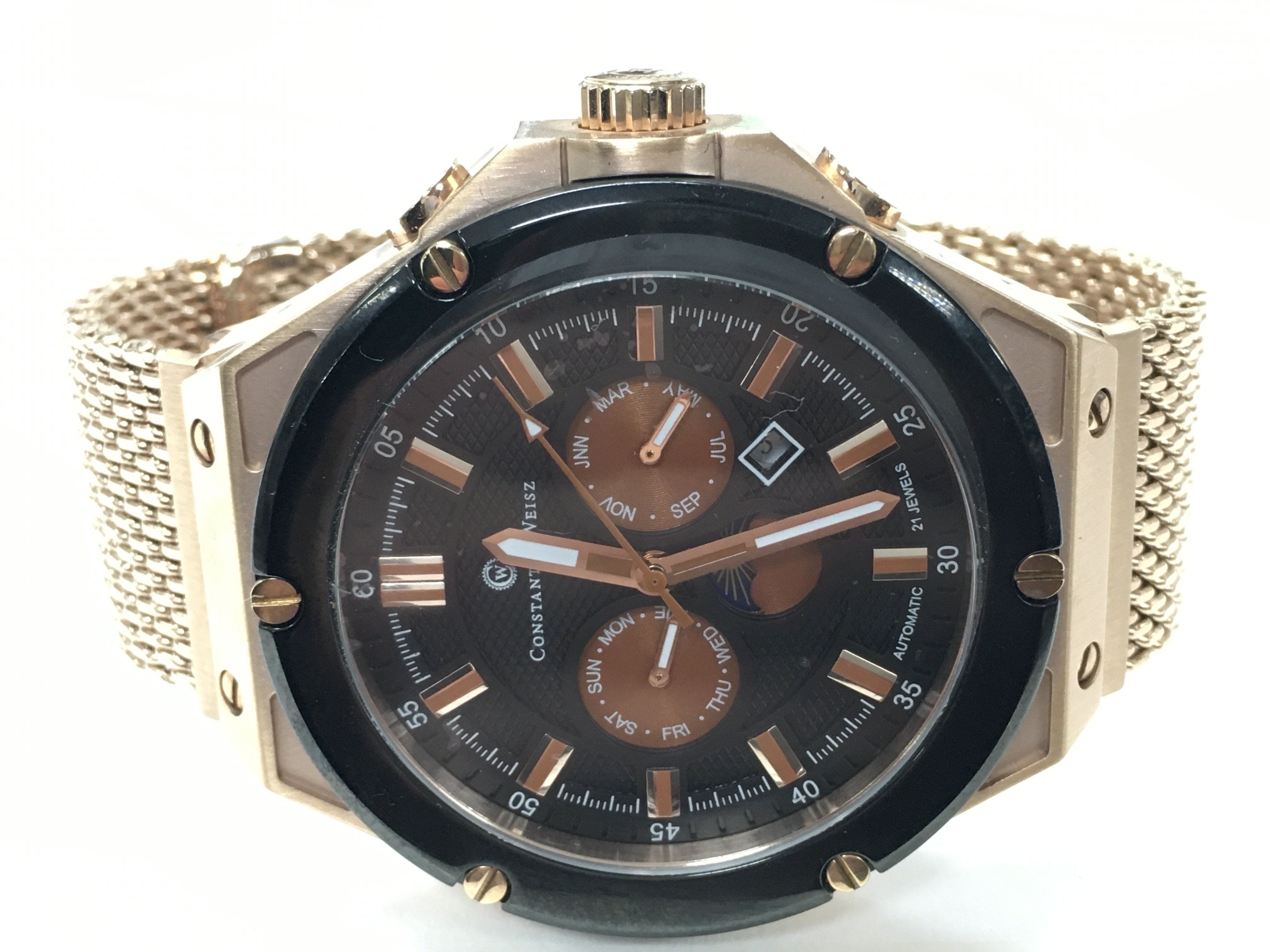 A mens gold tone Constantin Weisz automatic moon phase calendar watch, model 19s007CW-50mm case, complete with box and paperwork. Postage category B