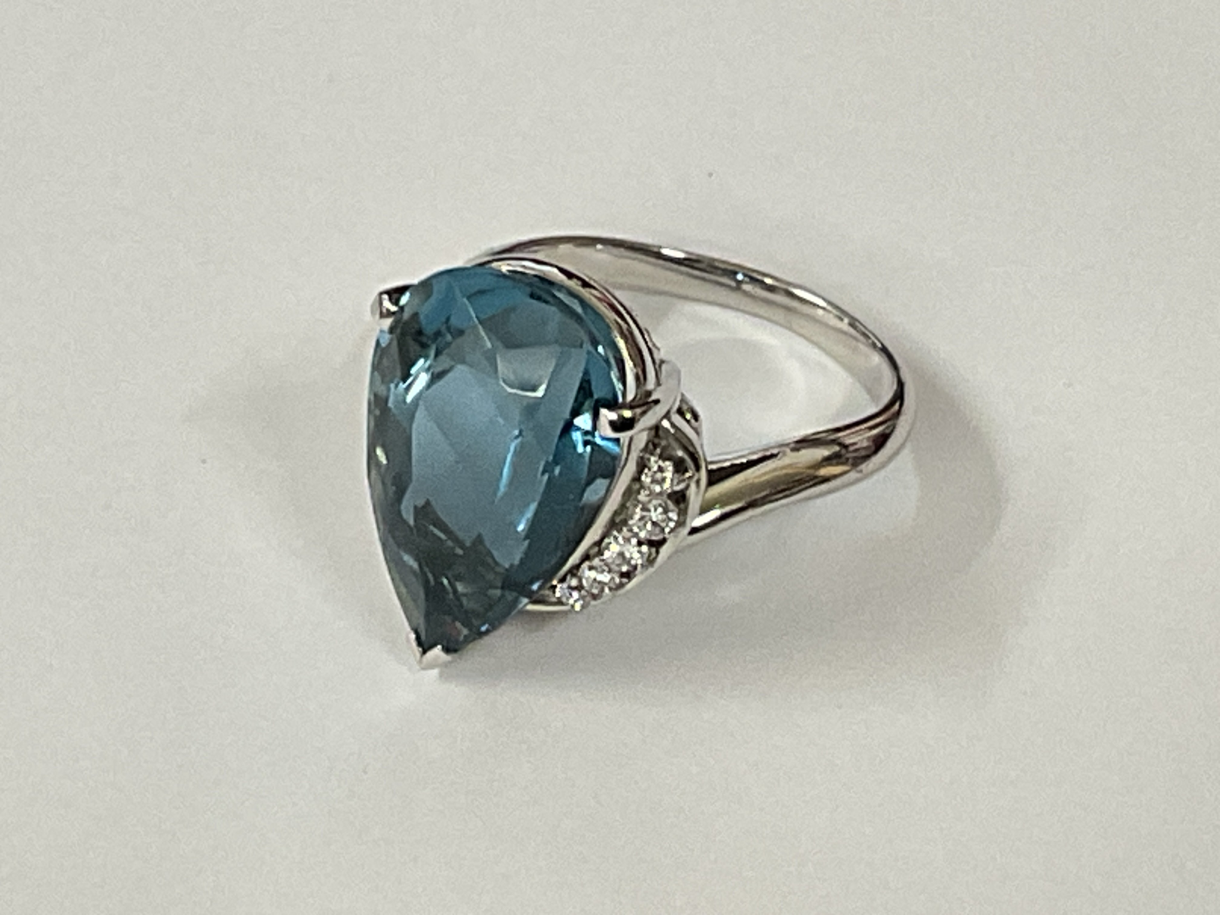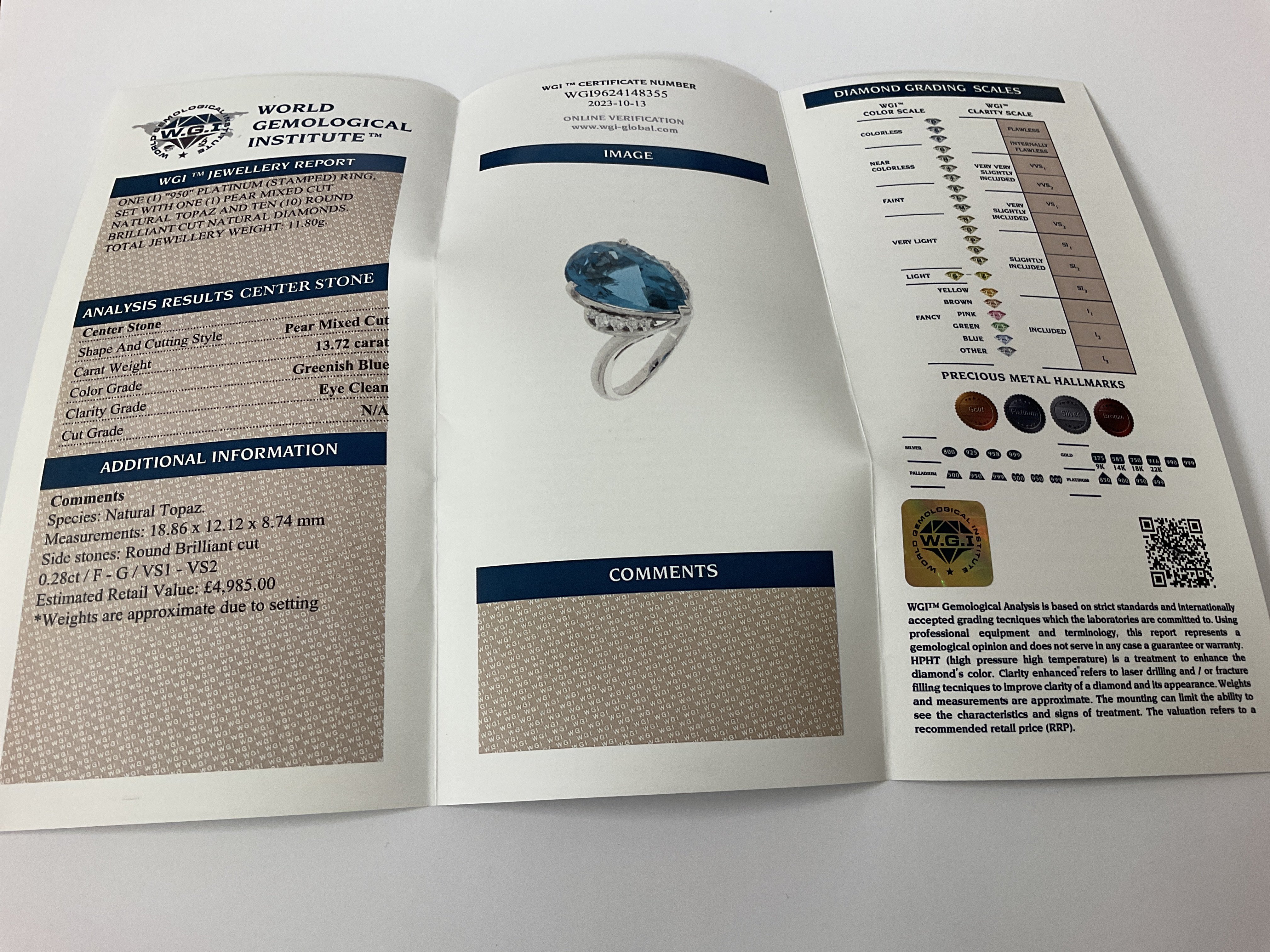 Large and weighty certificated platinum ring set with a mixed pear cut deep blue topaz and RBC diamonds. Topaz 13.72ct. Diamonds 0.28ct. Cert no. WG19624148355. Approx ring size Q/R. Postage category A.