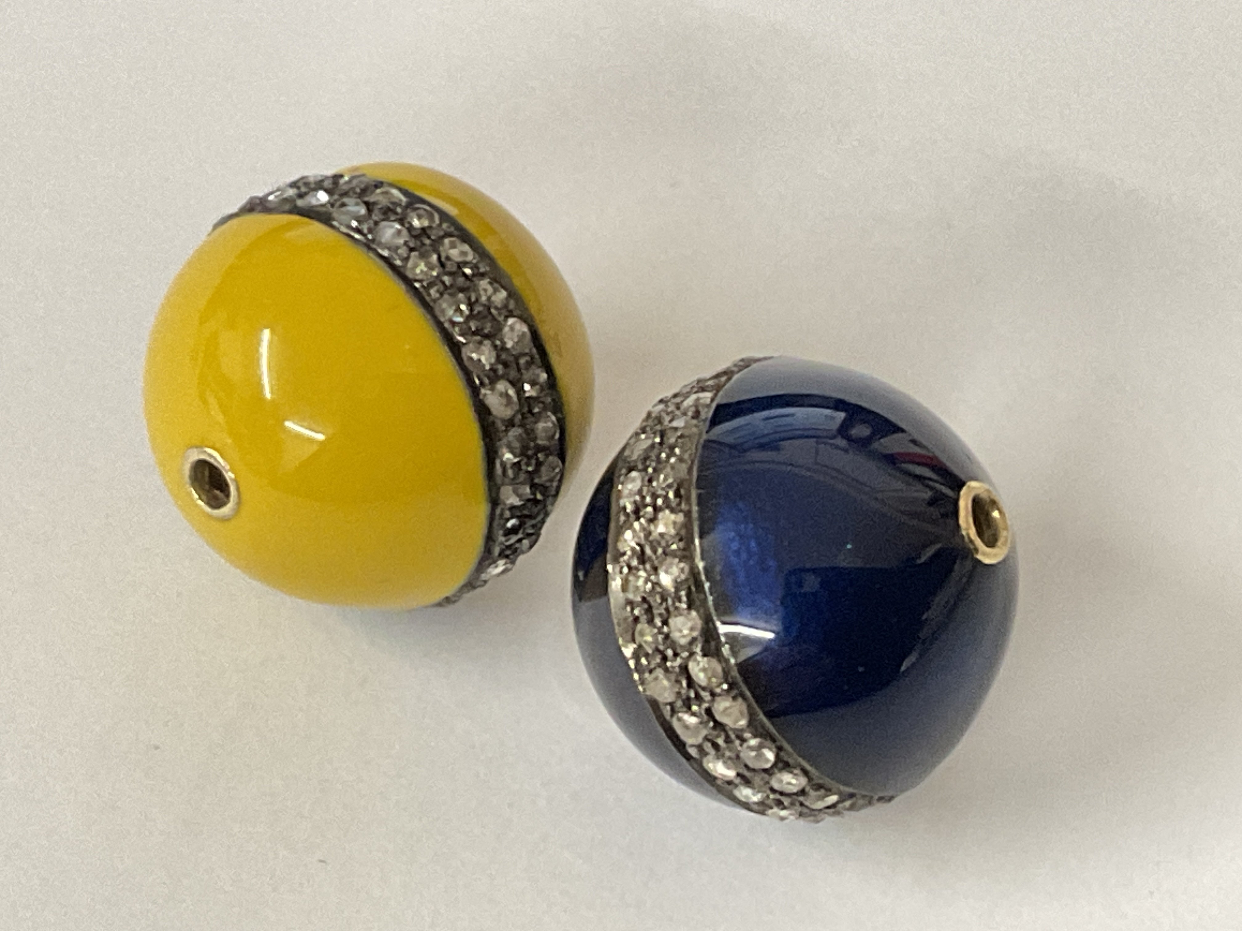 A pair of yellow and blue enamel beads set with diamonds totalling 0.50ct. Postage category A.