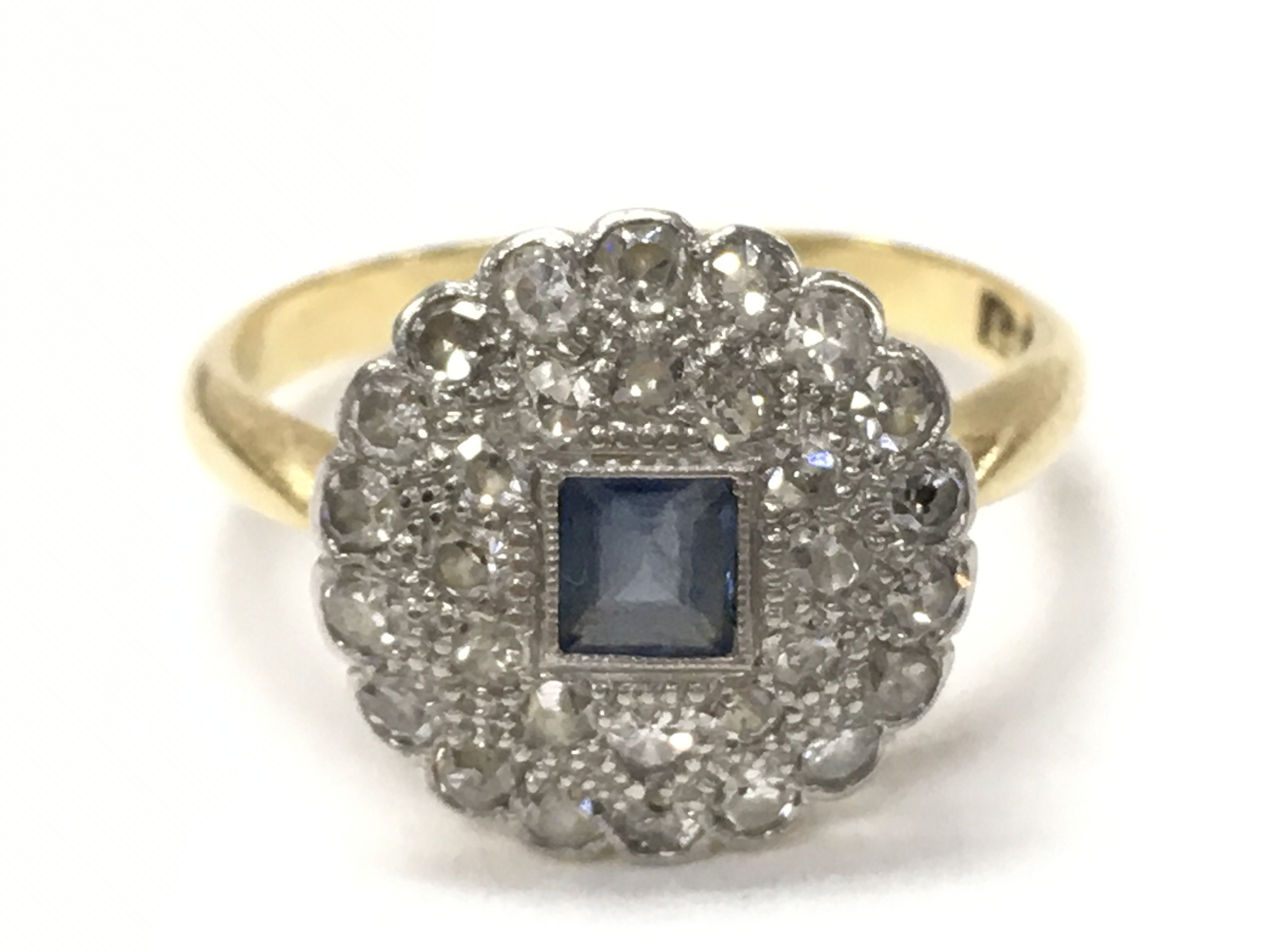An 18ct gold sapphire and diamond ring, size J/K. Total weight 3G. Postage category A