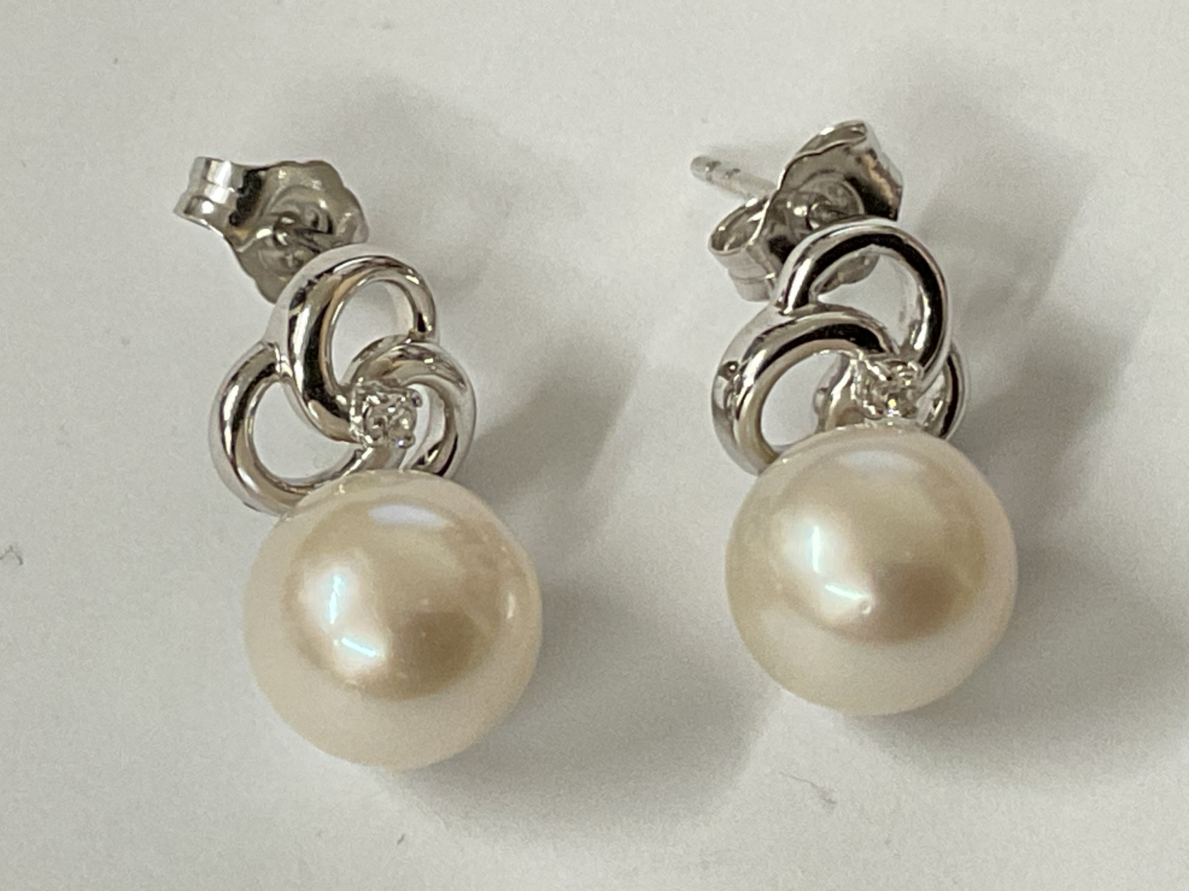 Pair of 9ct white gold round freshwater Pearl and diamond pinwheel earrings. R/C diamonds 0.05ct. Postage category A.