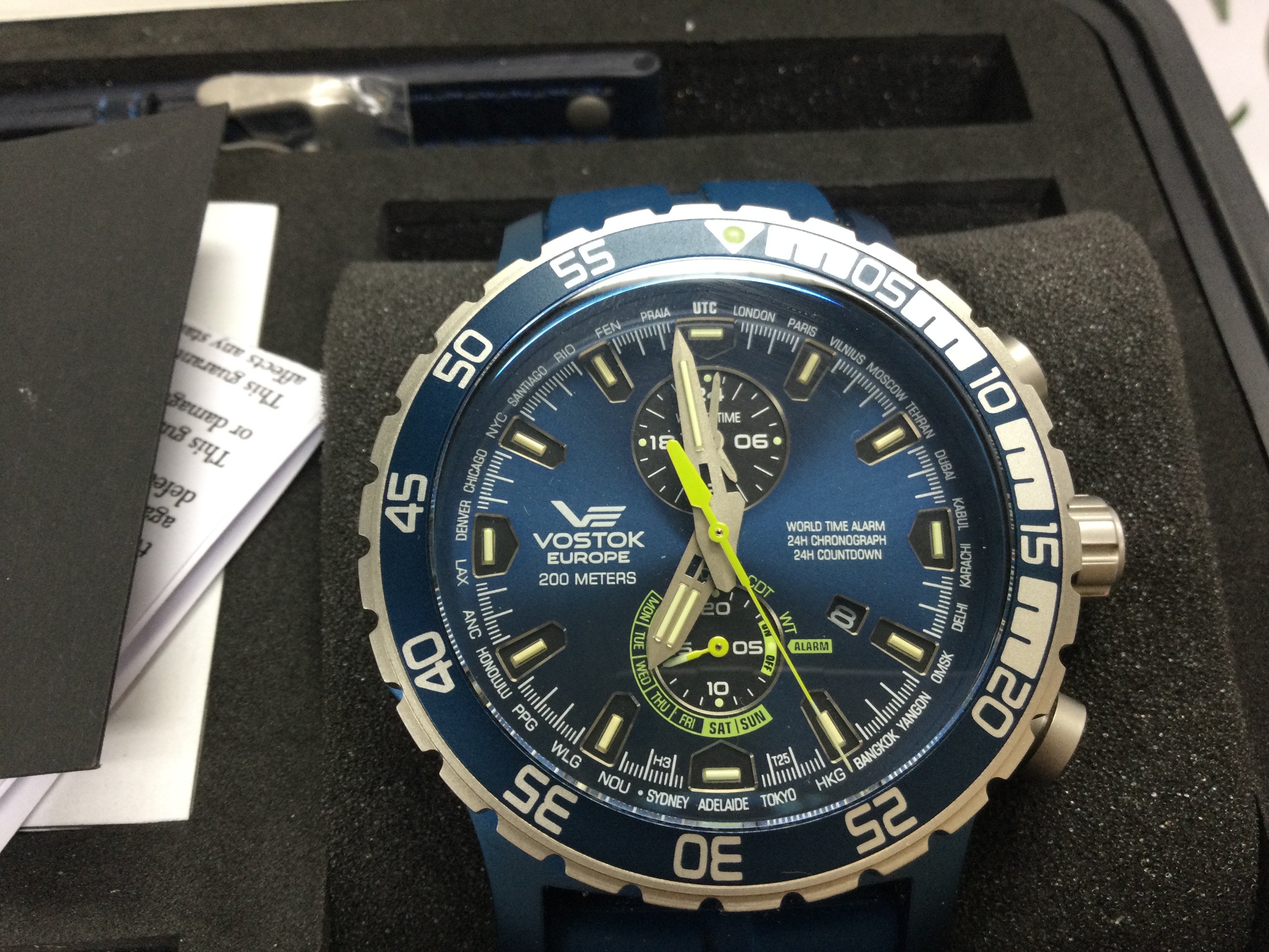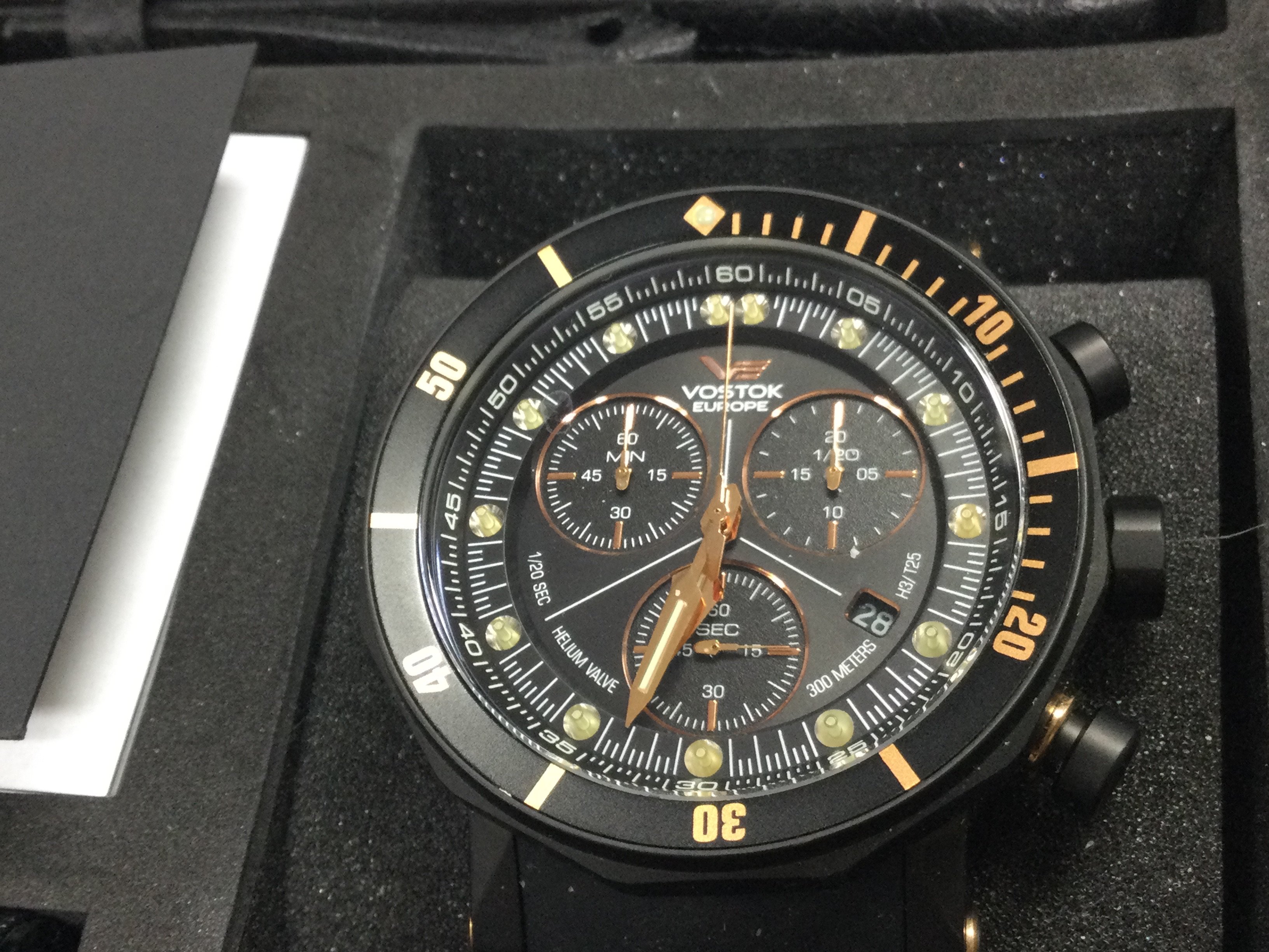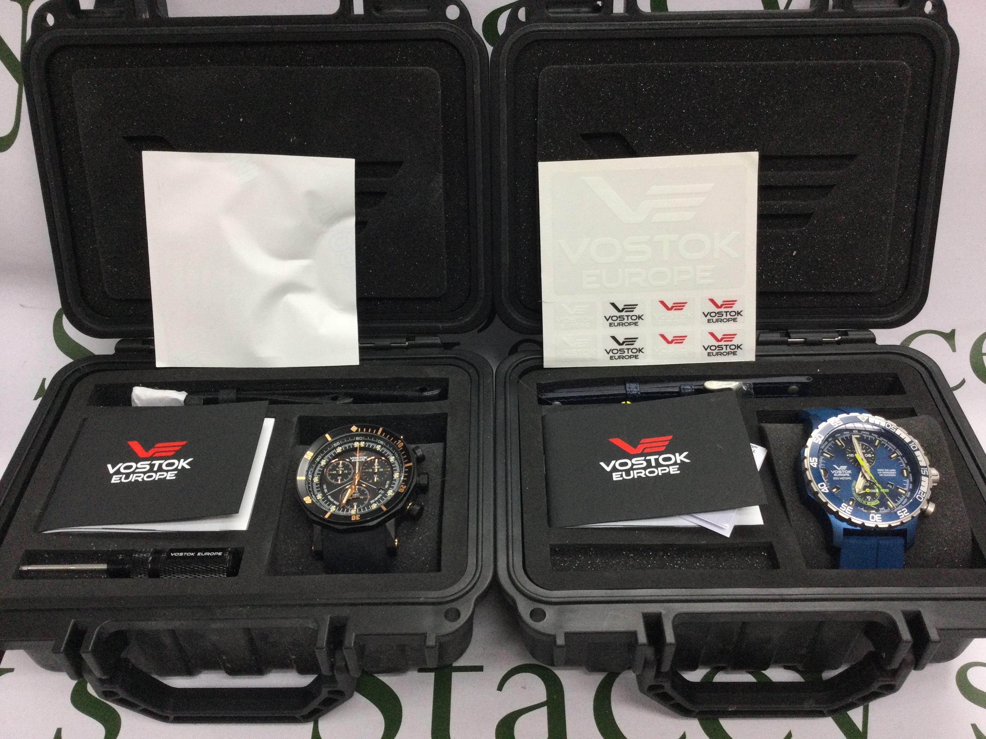 Two Vostok Europe gents wrist watches with boxes and paperwork. Not seen running. Postage B