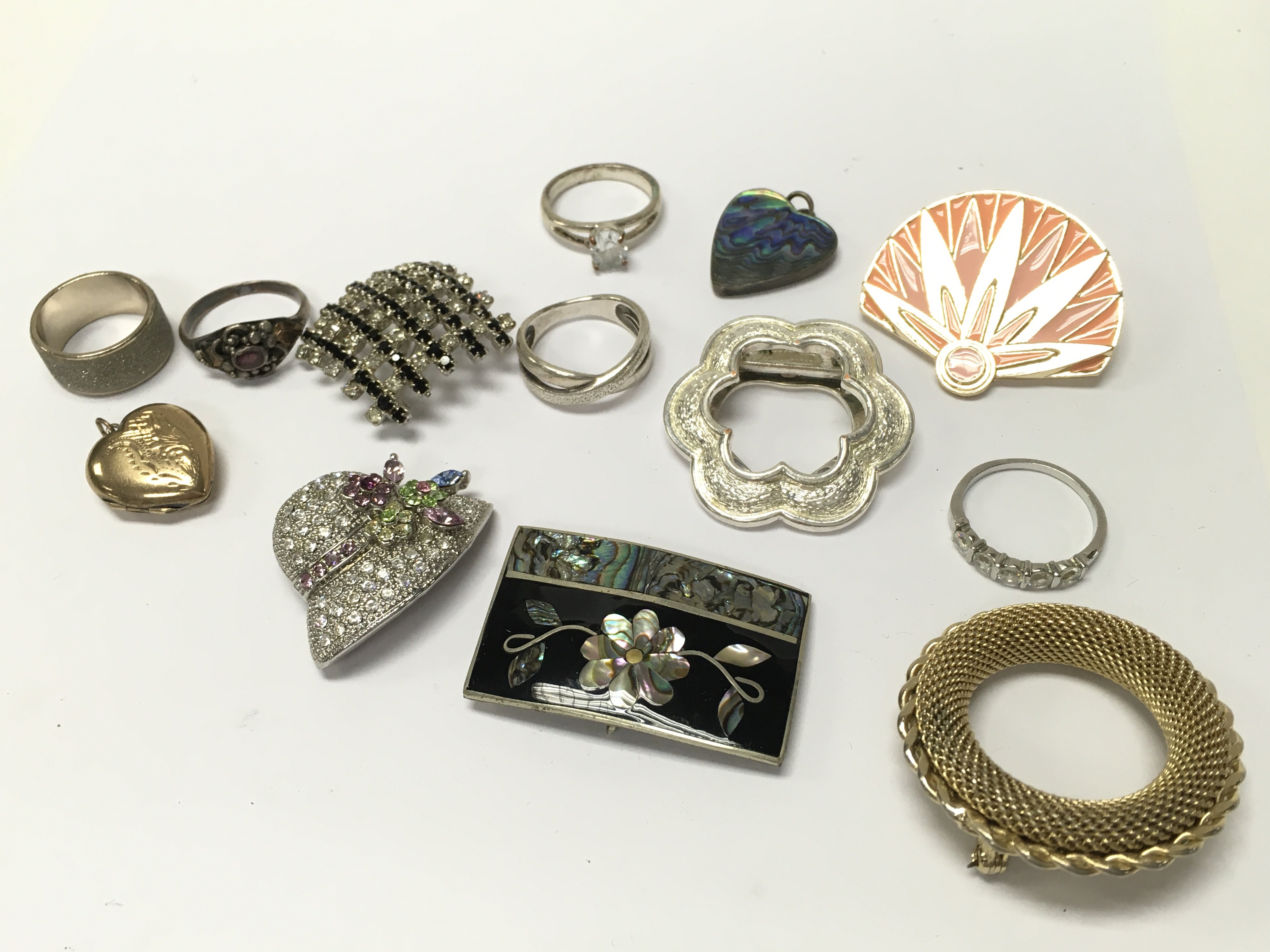 A small collection of brooches including a 9ct back and front pendant, some silver. Postage category A