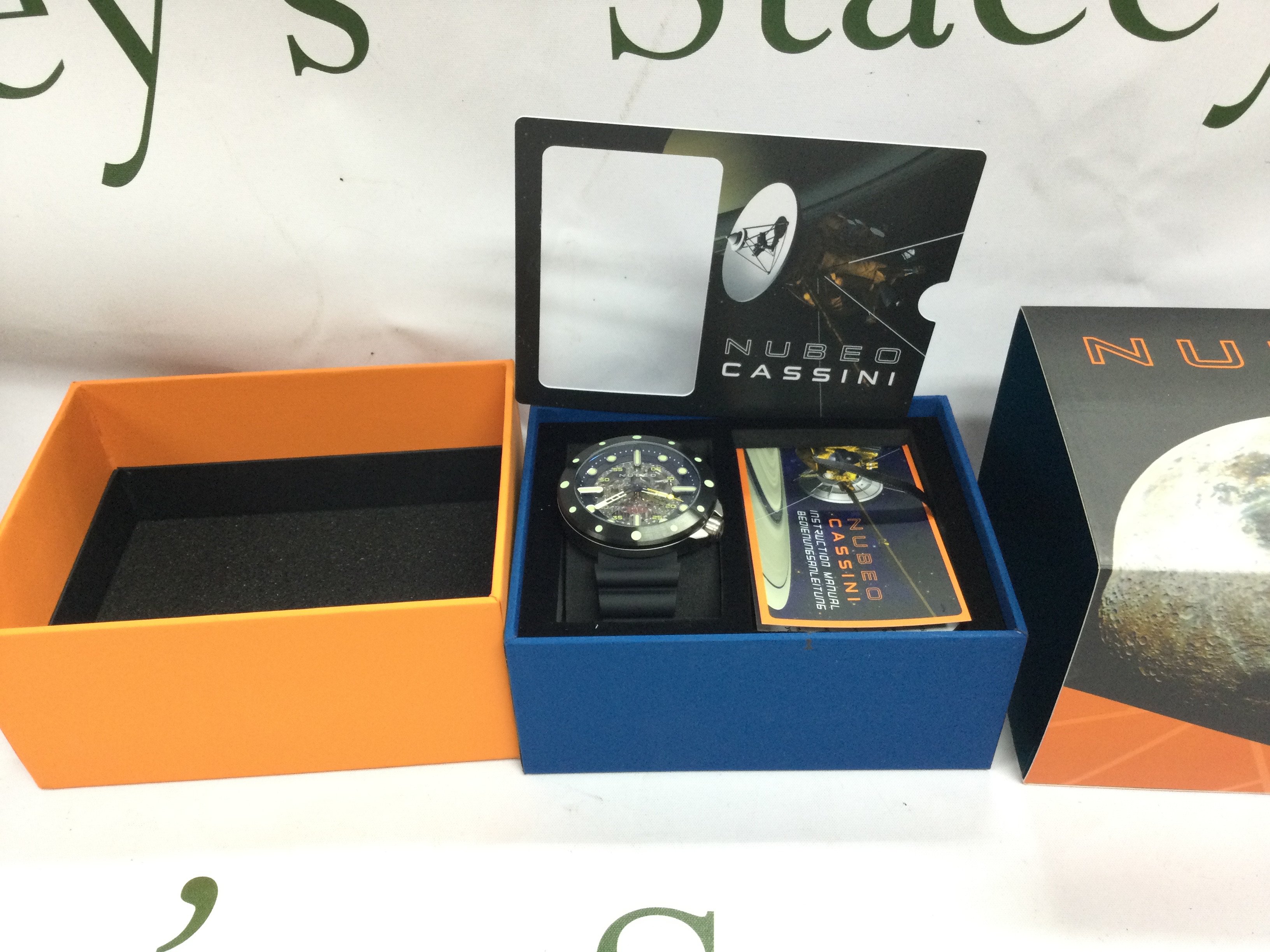 A Nubeo Cassini edition wrist watch. In as new condition with box and papers seen running. Postage B