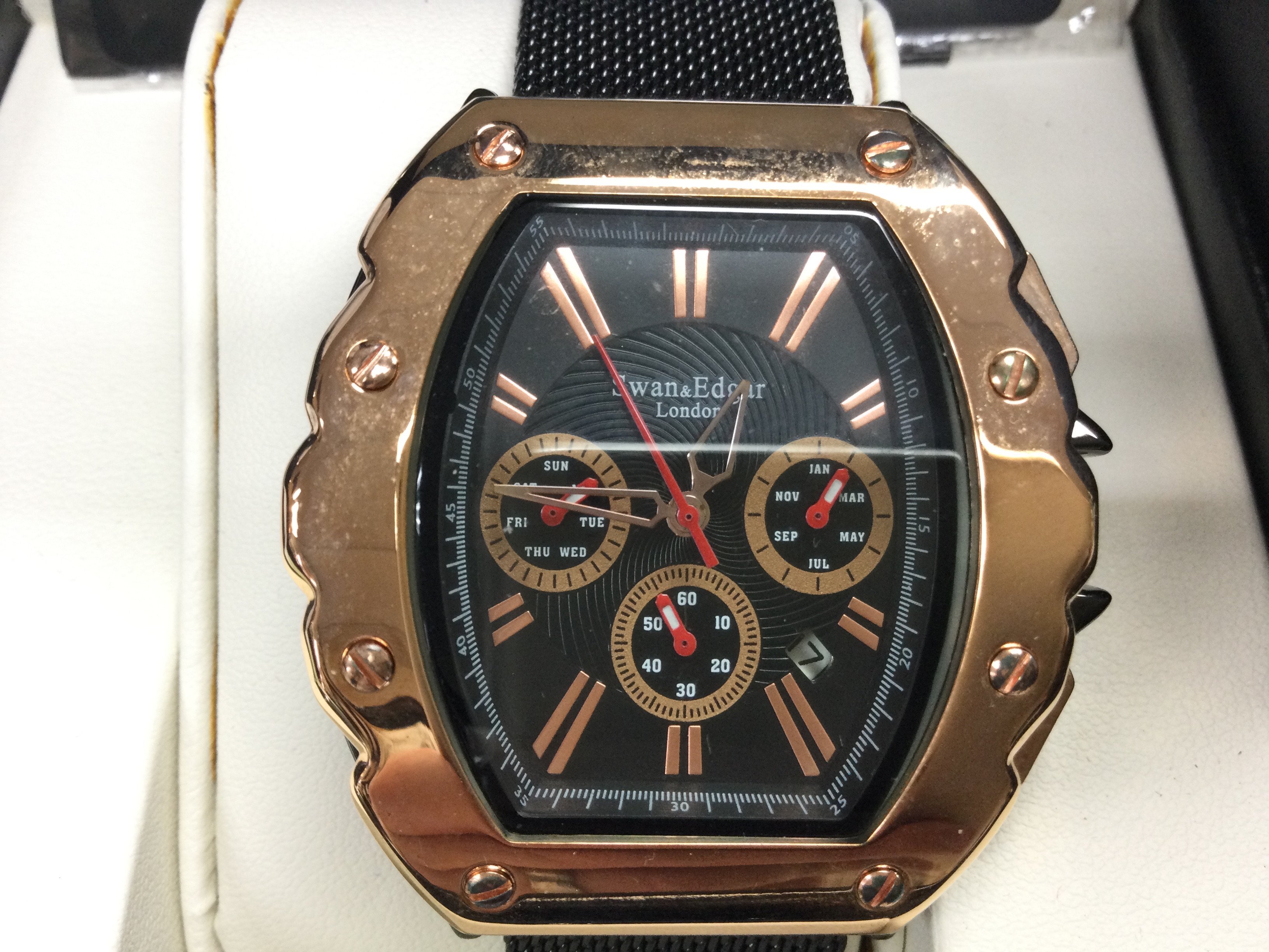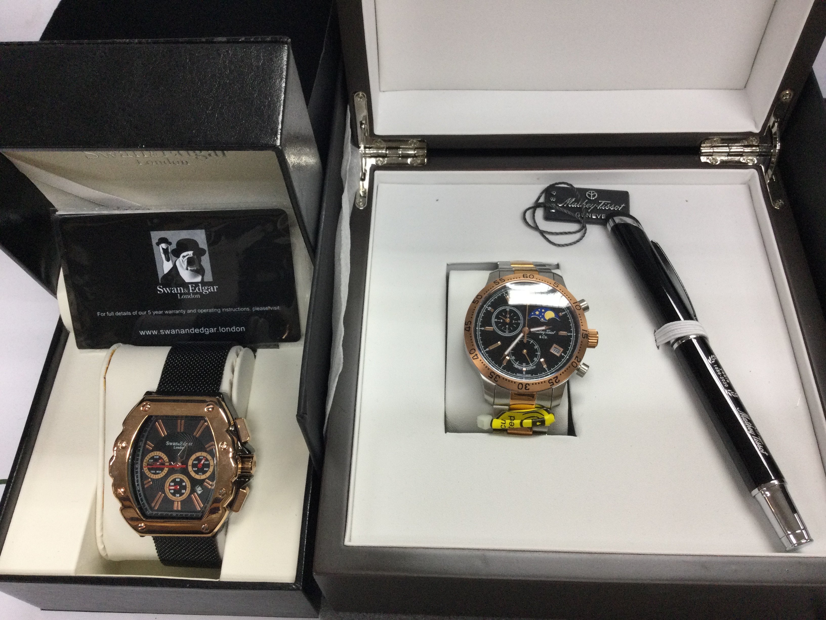 A Swan and Edgar automatic watch with box and papers seen working and a Mathew Tissot Ltd edition quartz watch with box not seen working. Postage B