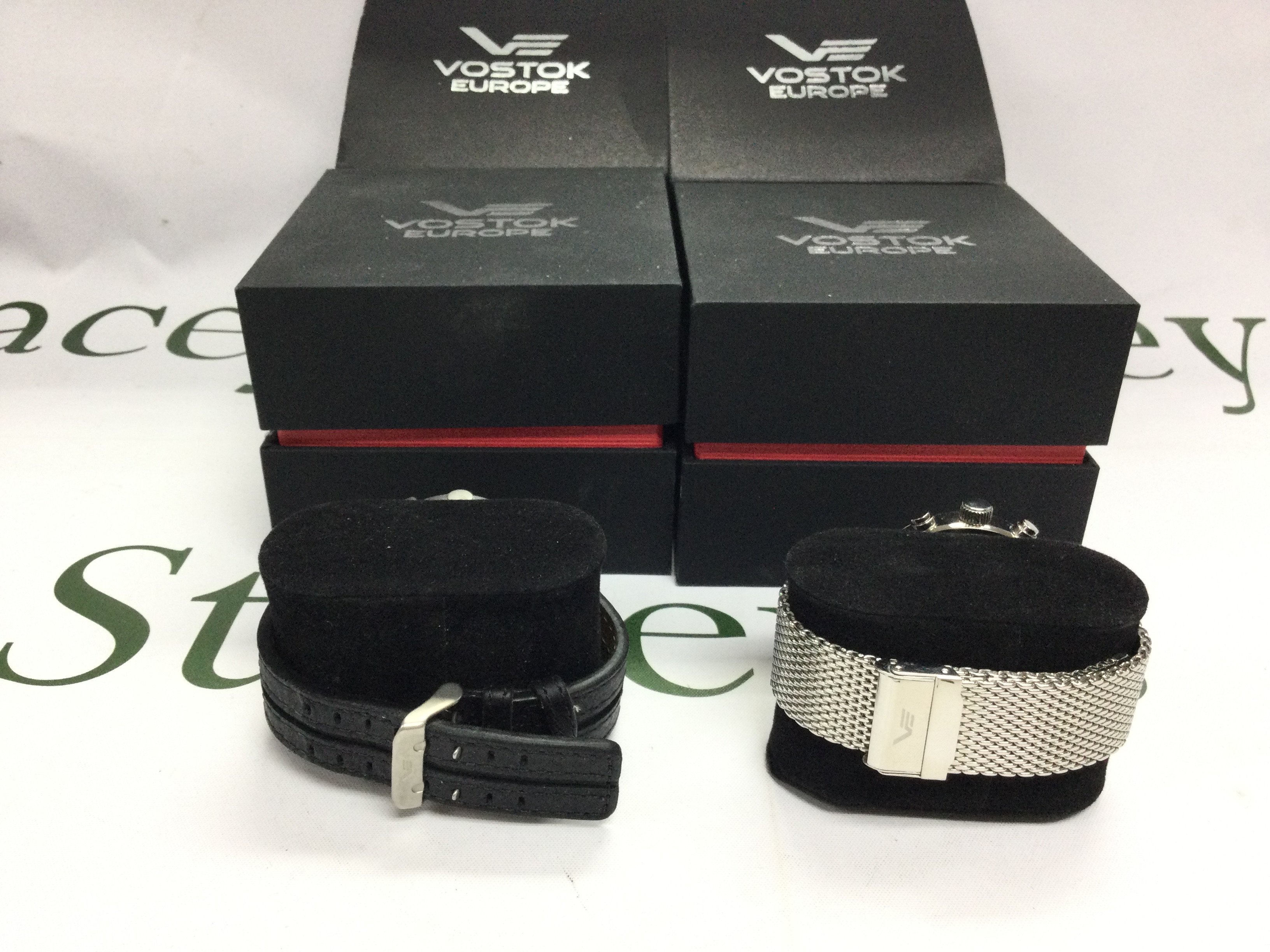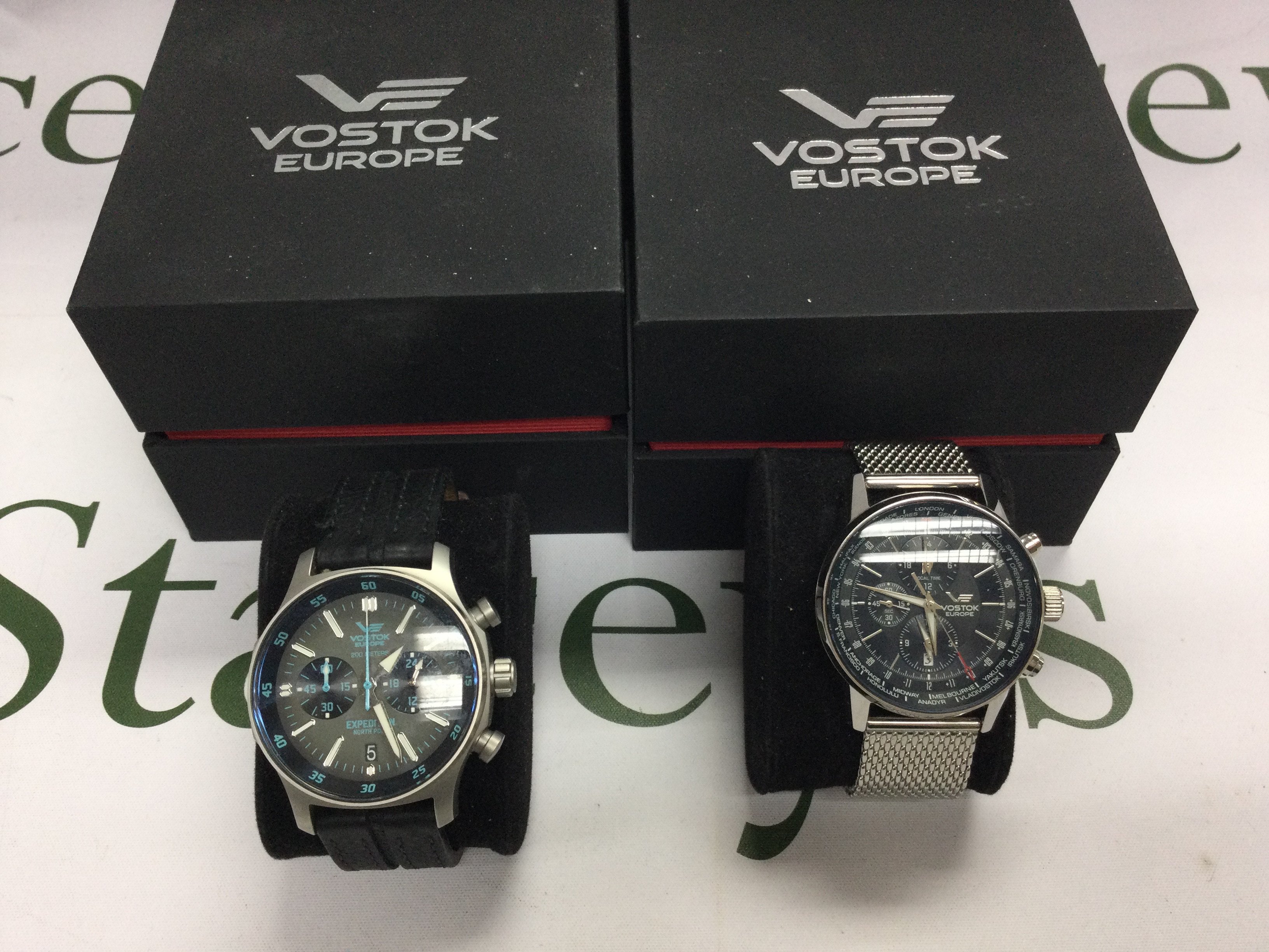Two Vostok Europe gents watches with box and papers. Postage B