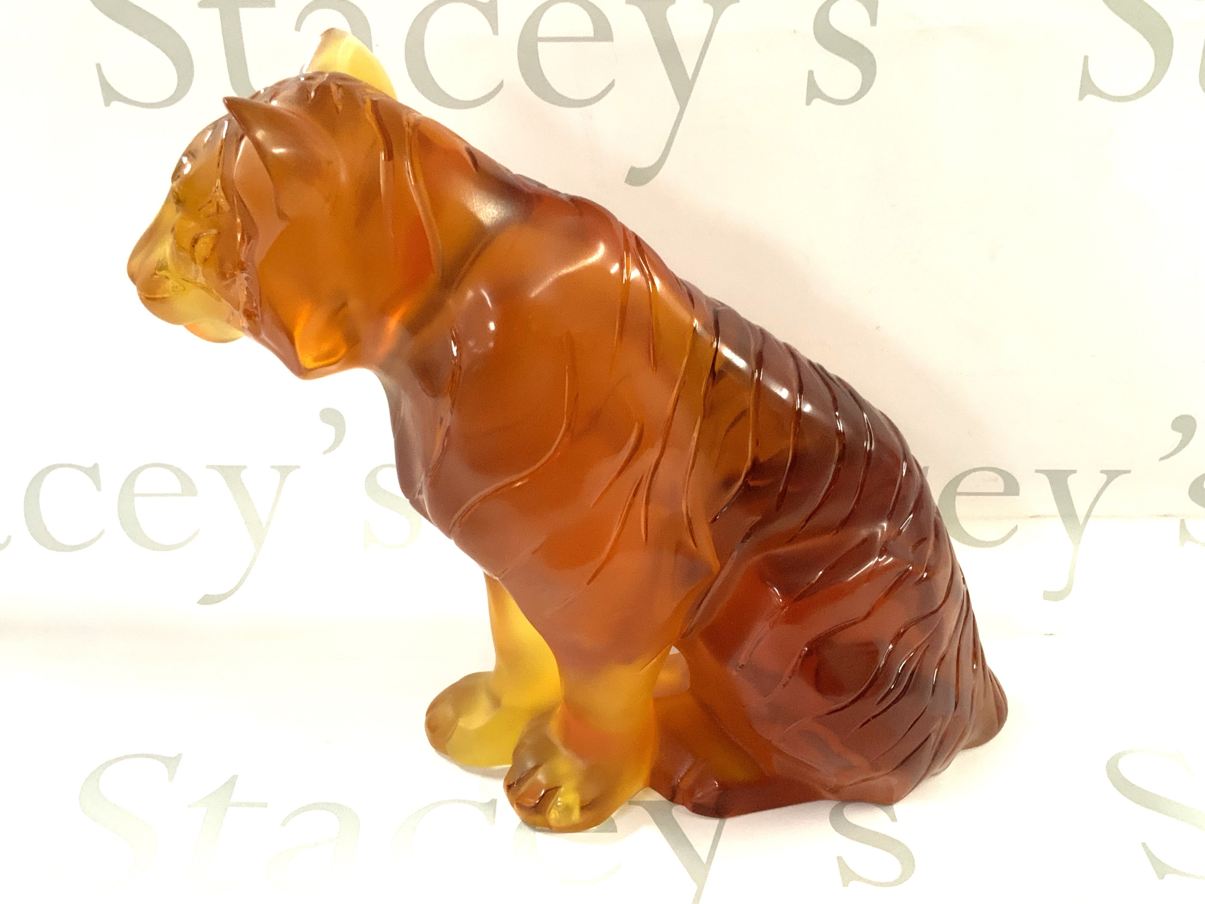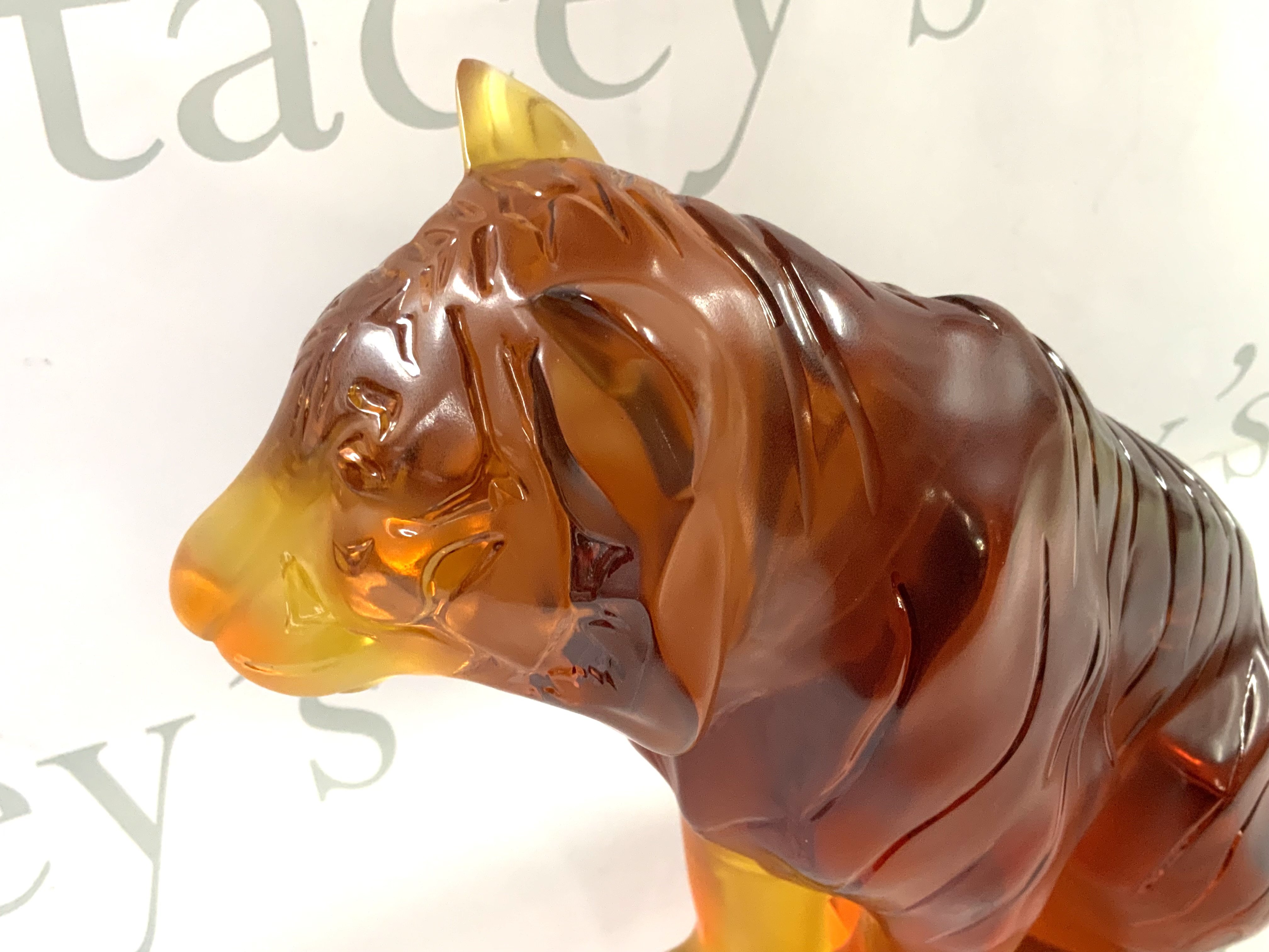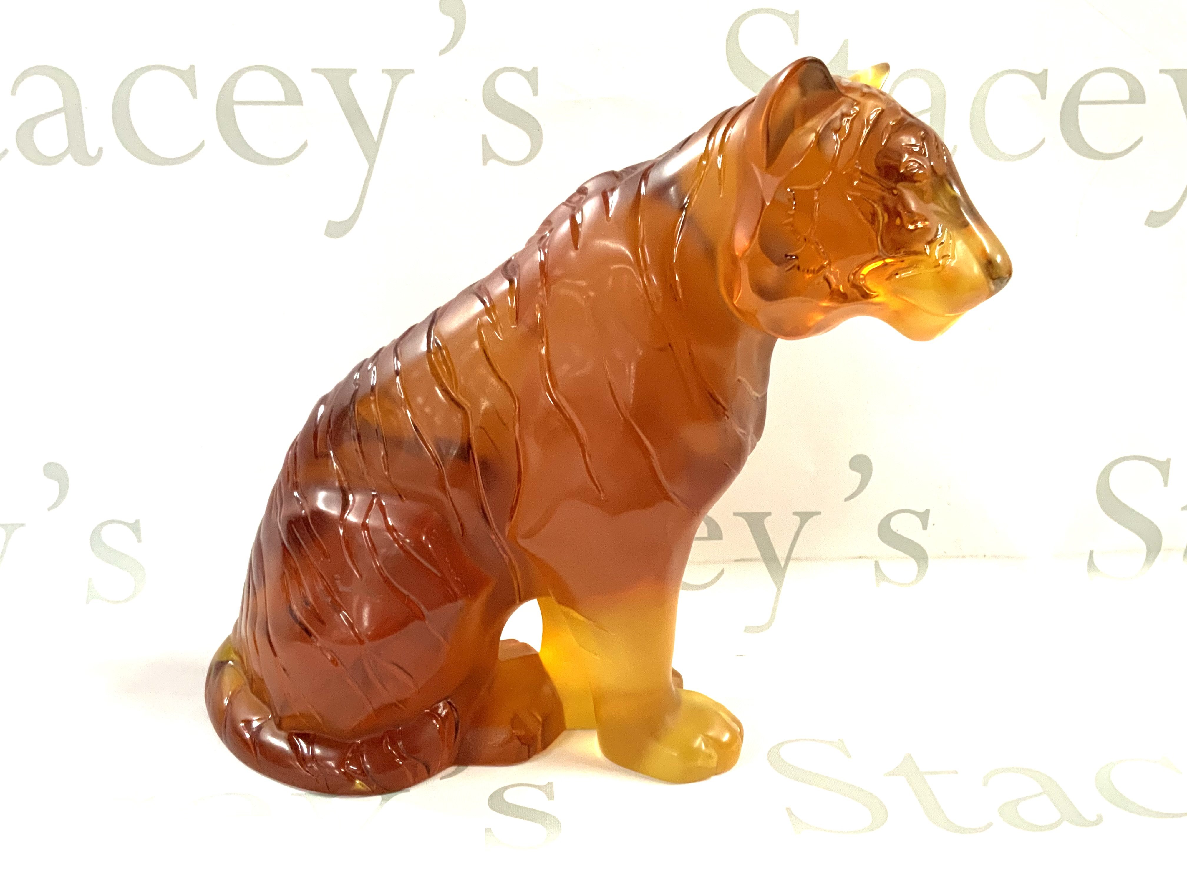 A large Lalique Amber glass tiger, 20th century, seated, overall decorated with black stripes, height 24.5cm. (D)