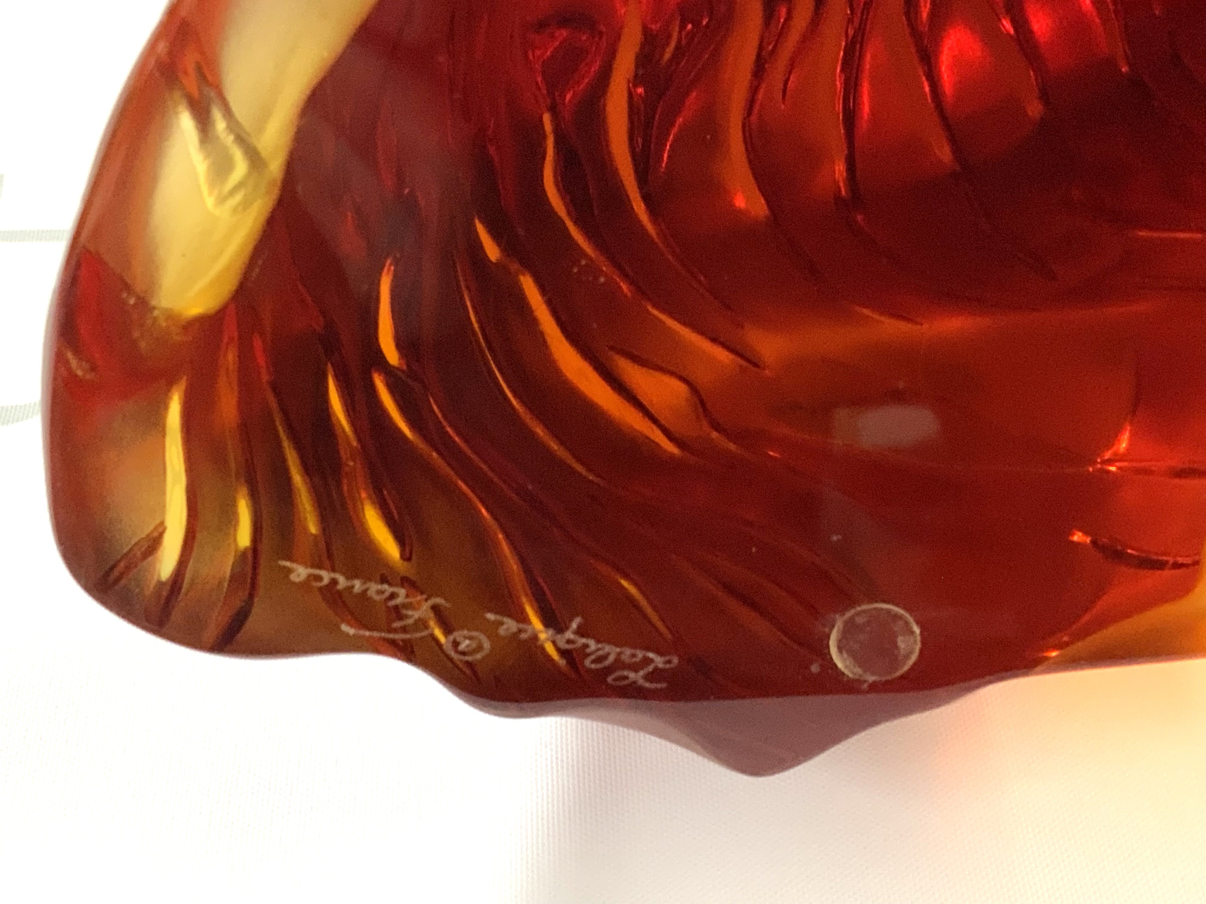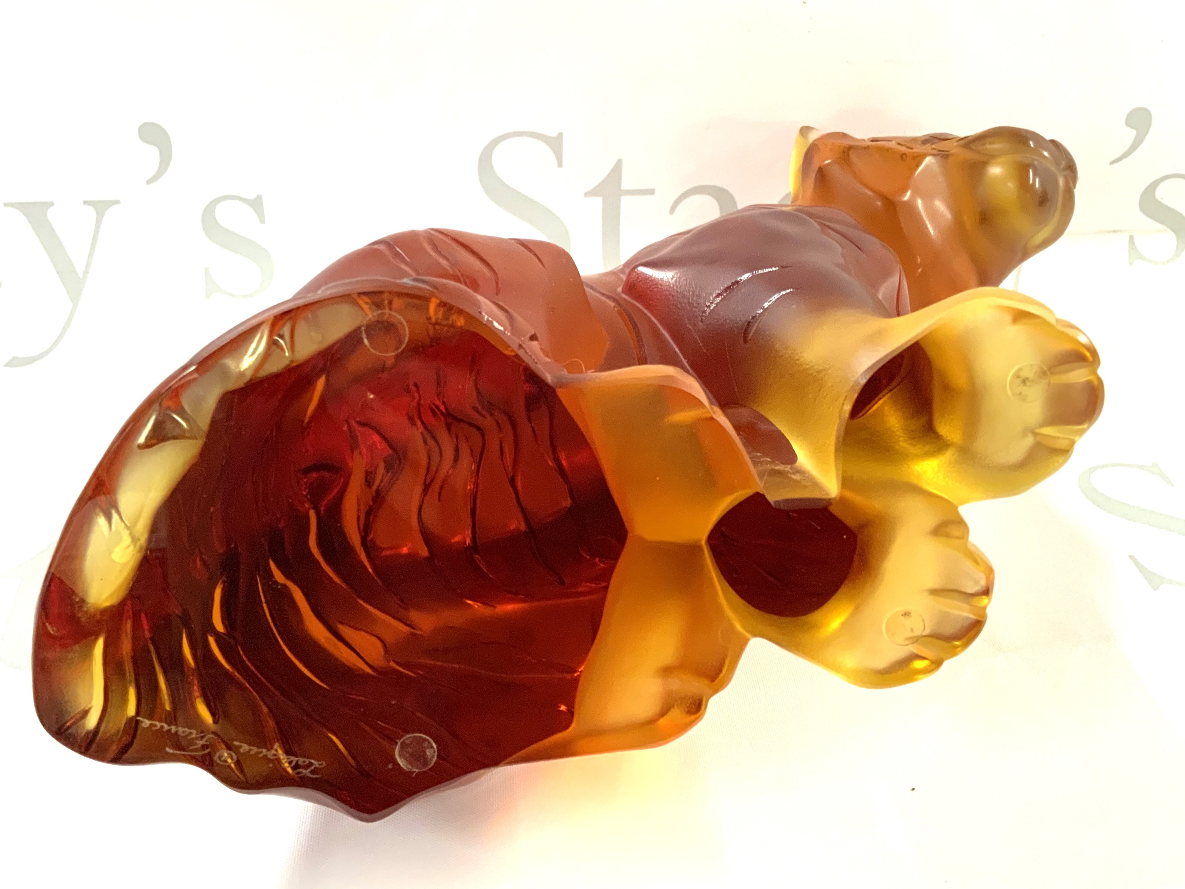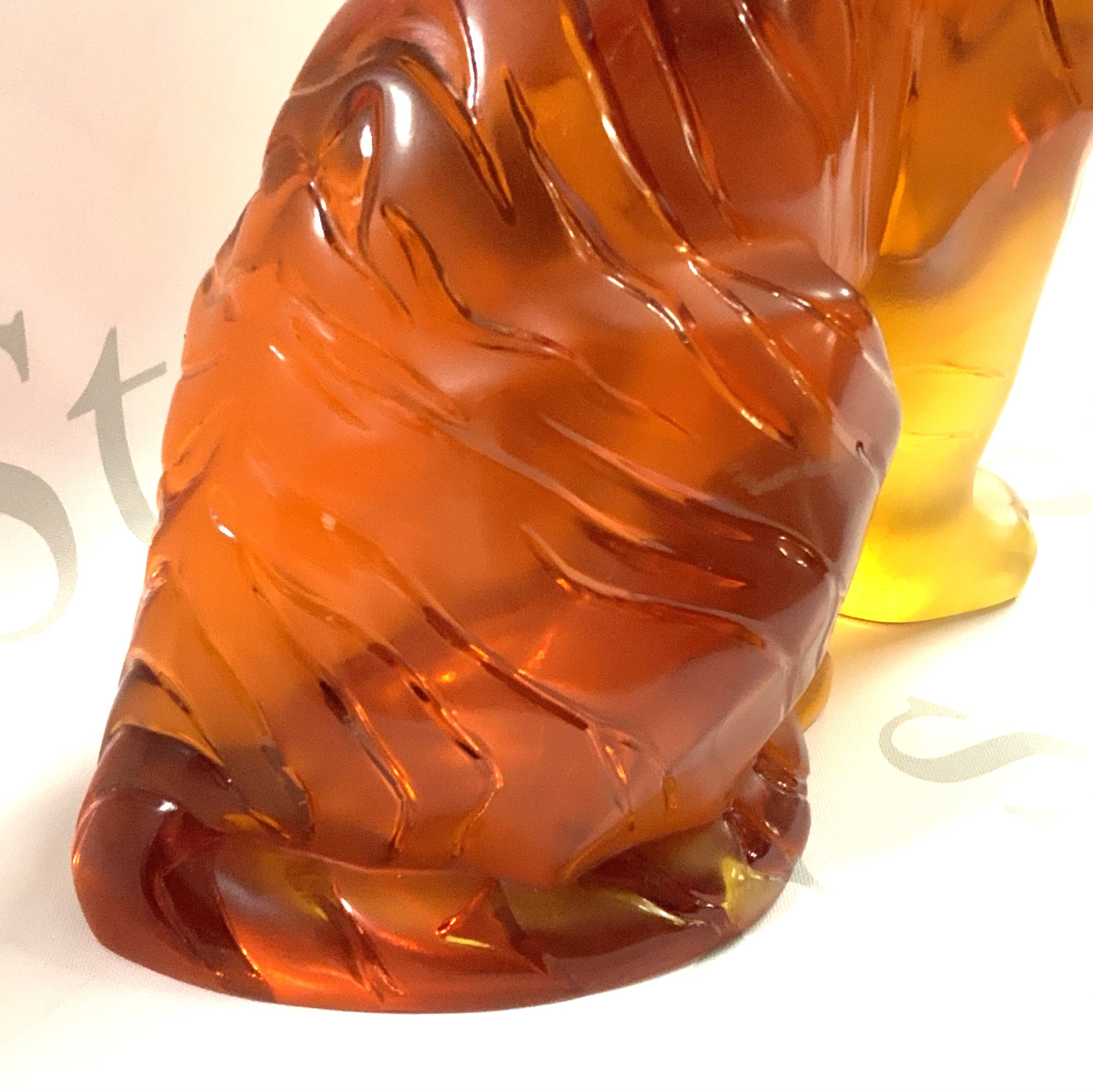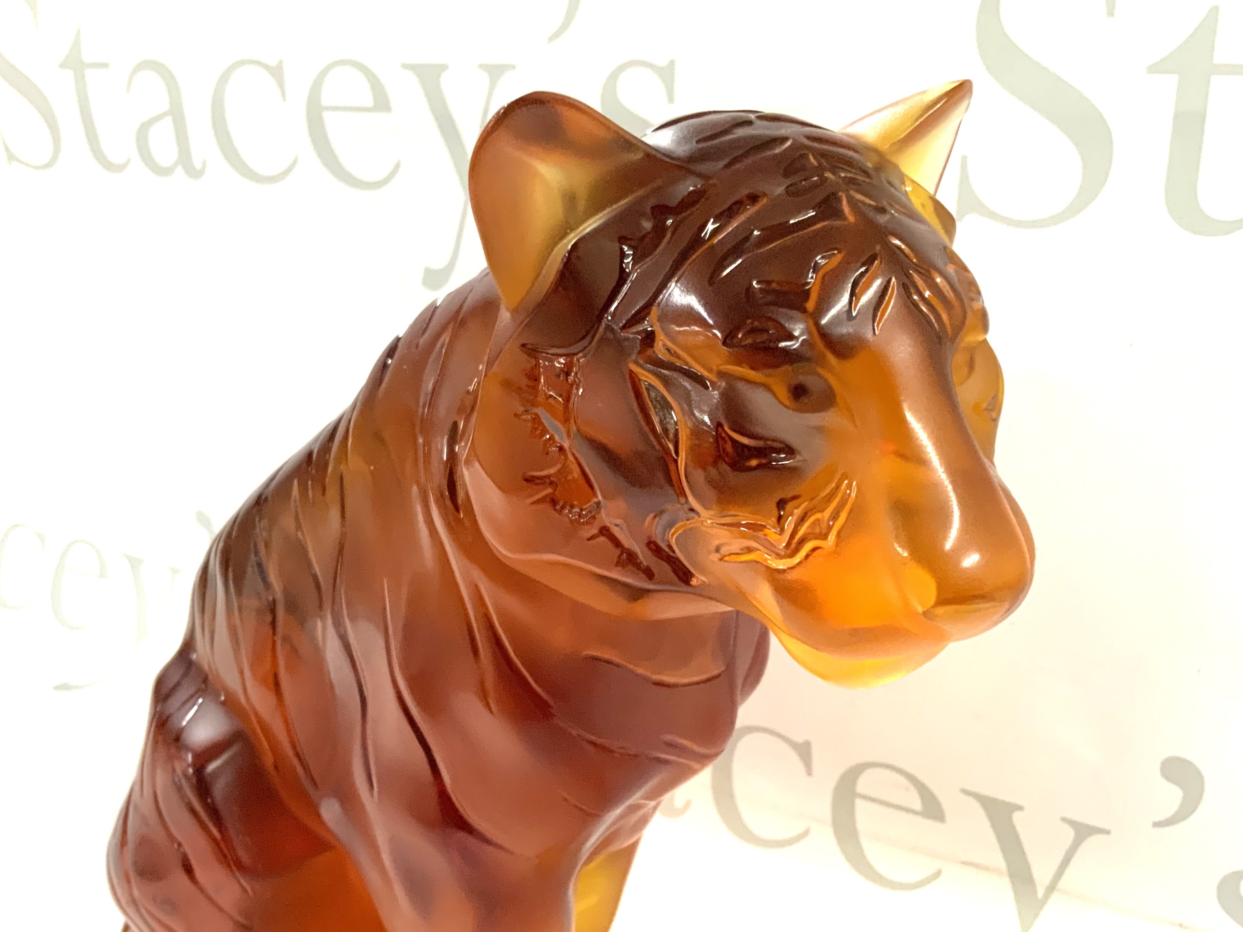A large Lalique Amber glass tiger, 20th century, seated, overall decorated with black stripes, height 24.5cm. (D)