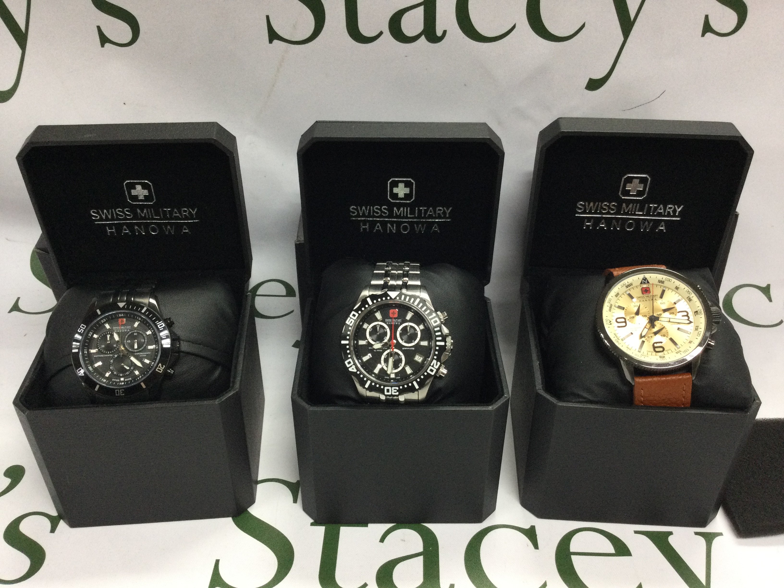 Three Swiss Military Hanowa watches with boxes. Postage B