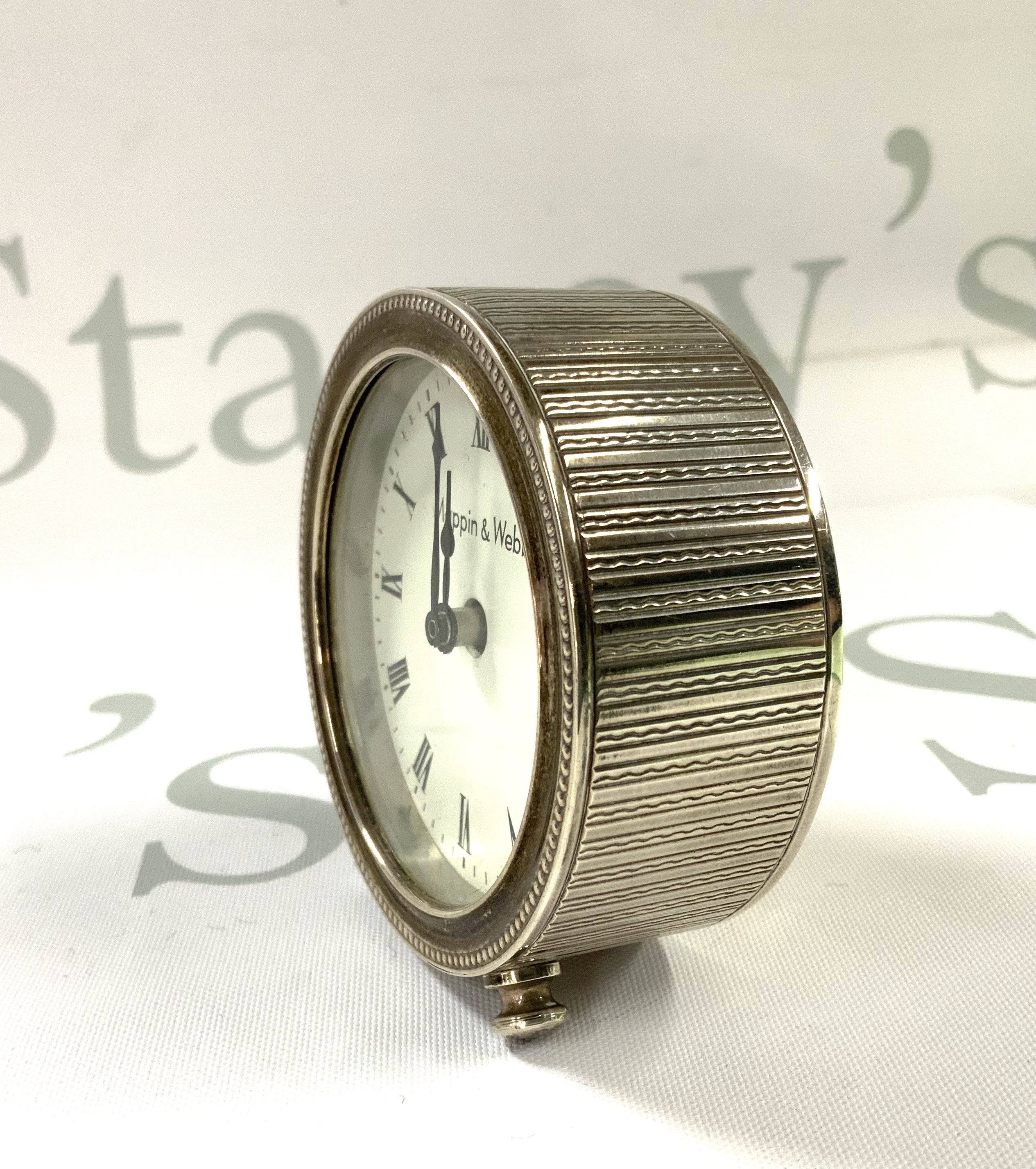 A hallmarked silver Mappin & Webb clock, 6.5cm Diameter. London 1990. (A)