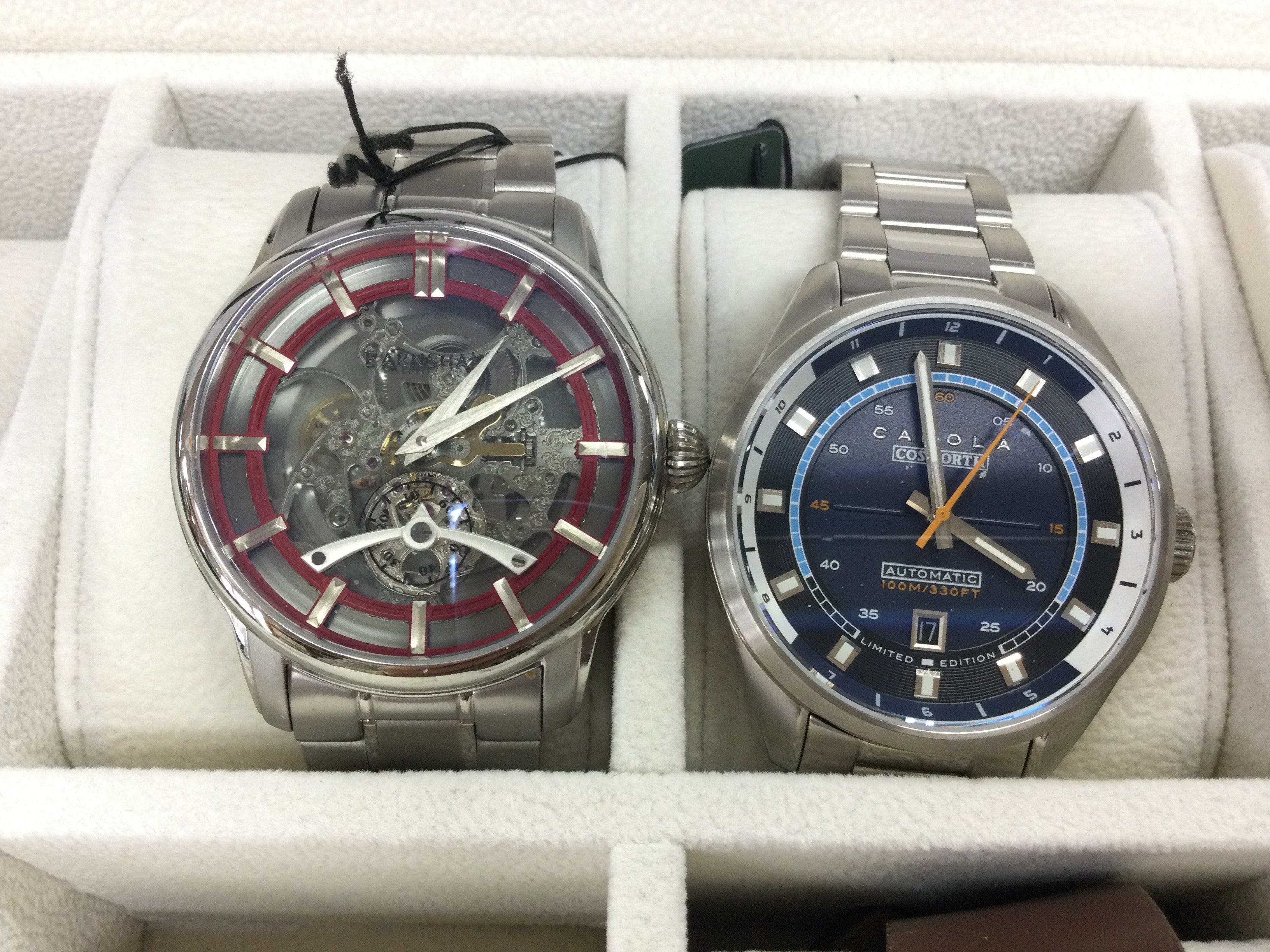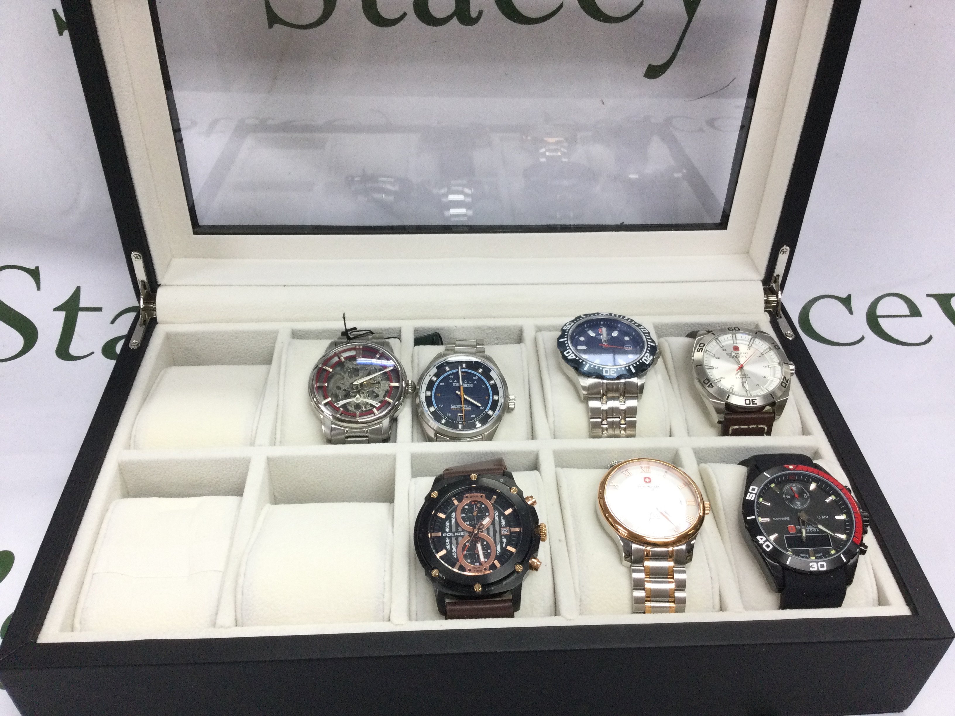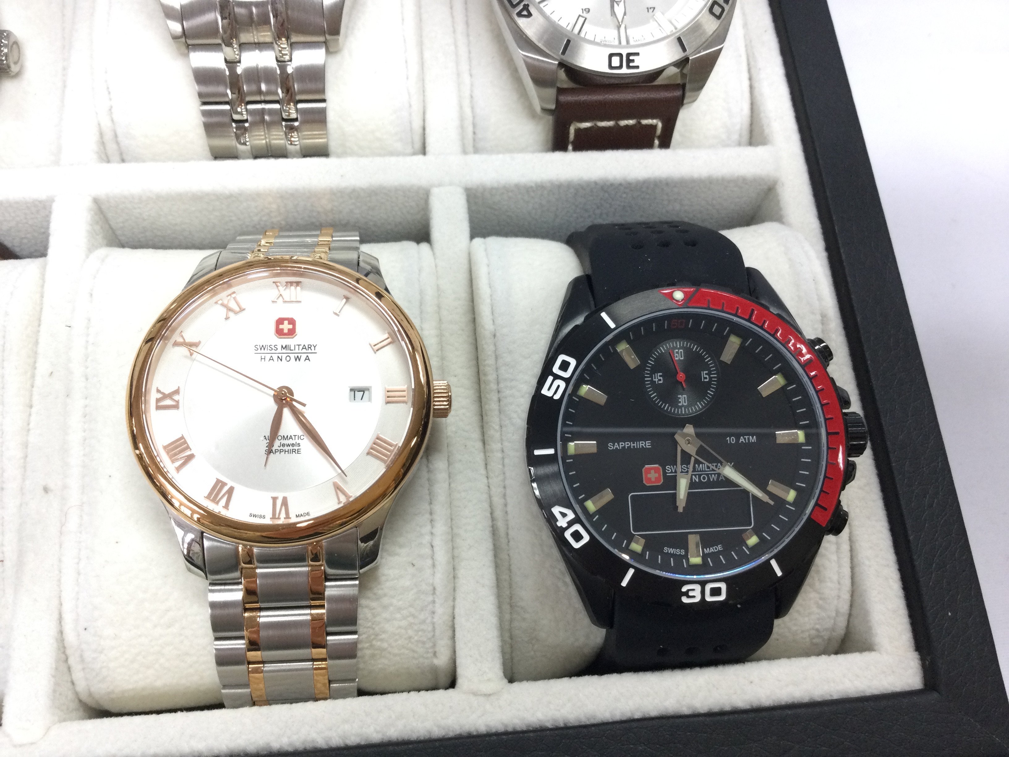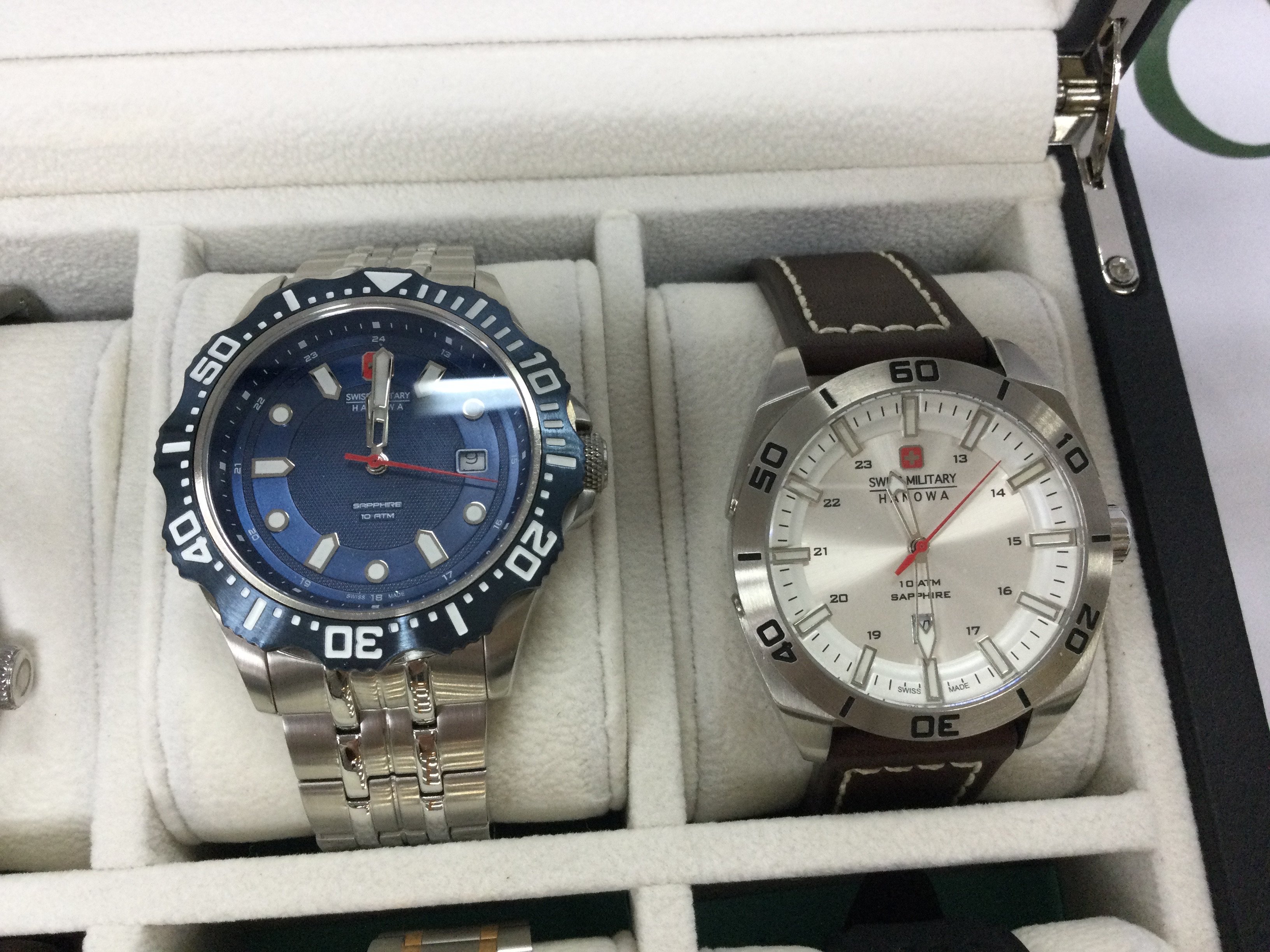 A small collection of watches including Swiss military and police etc all in a 10 watch storage box. Postage B