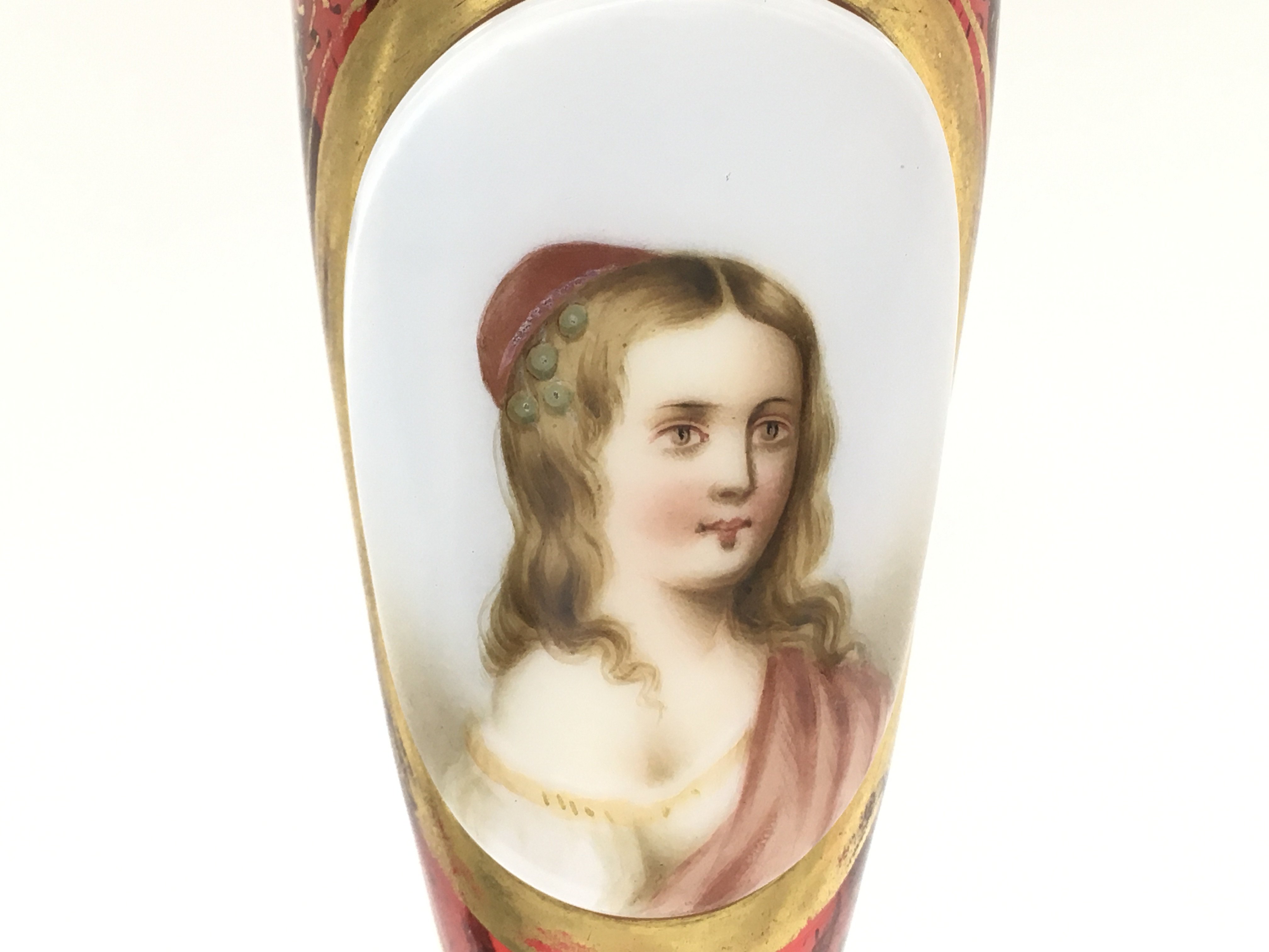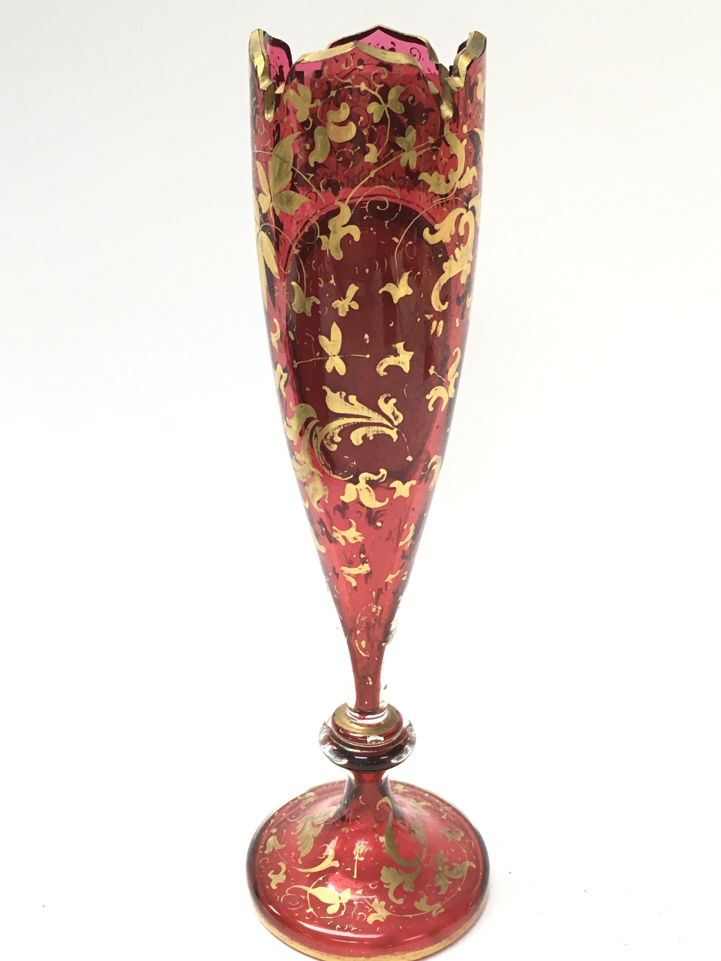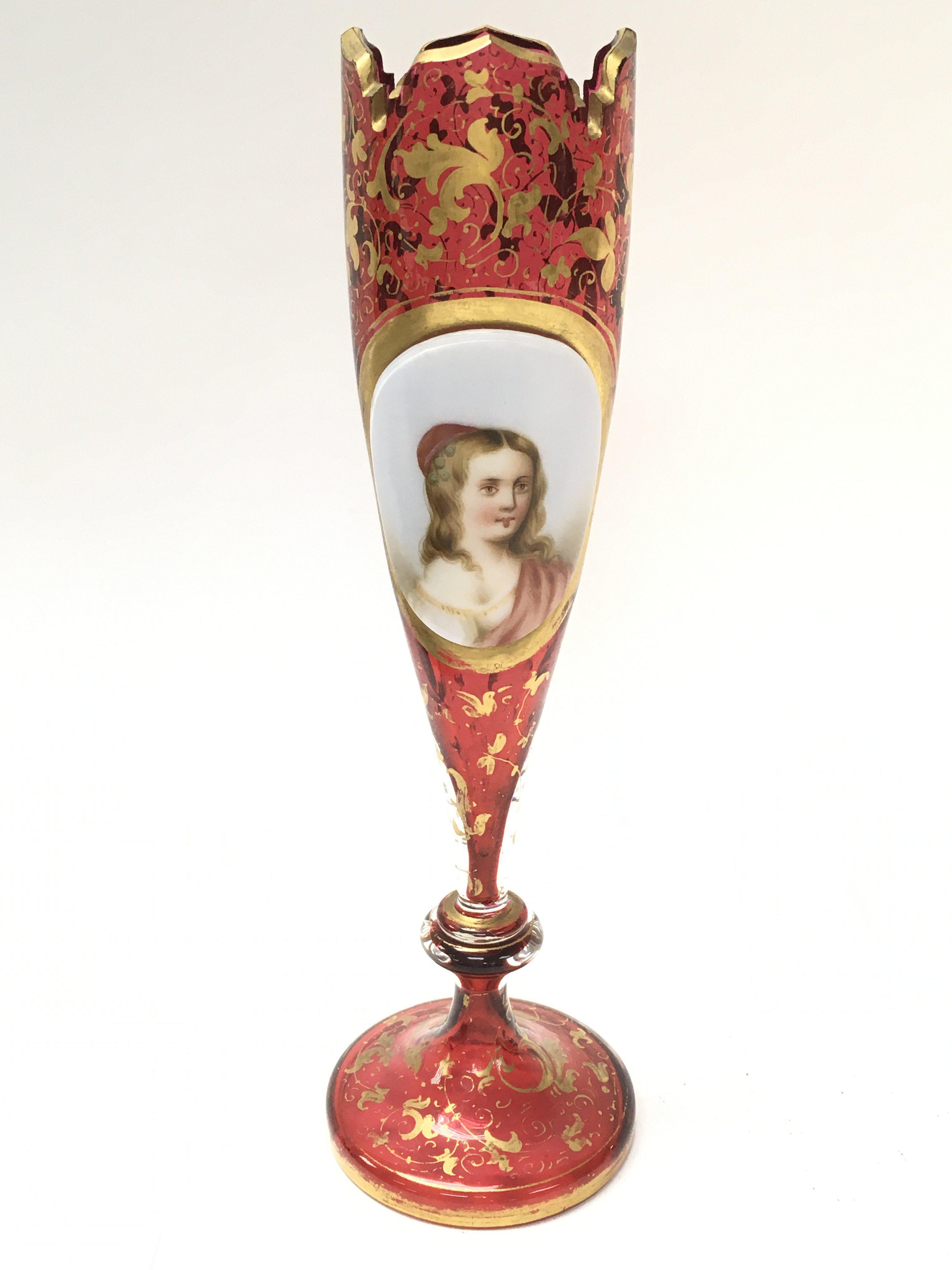 A Victorian Bohemian Cranberry portrait vase with gilt decoration , 22cm tall. This lot cannot be posted