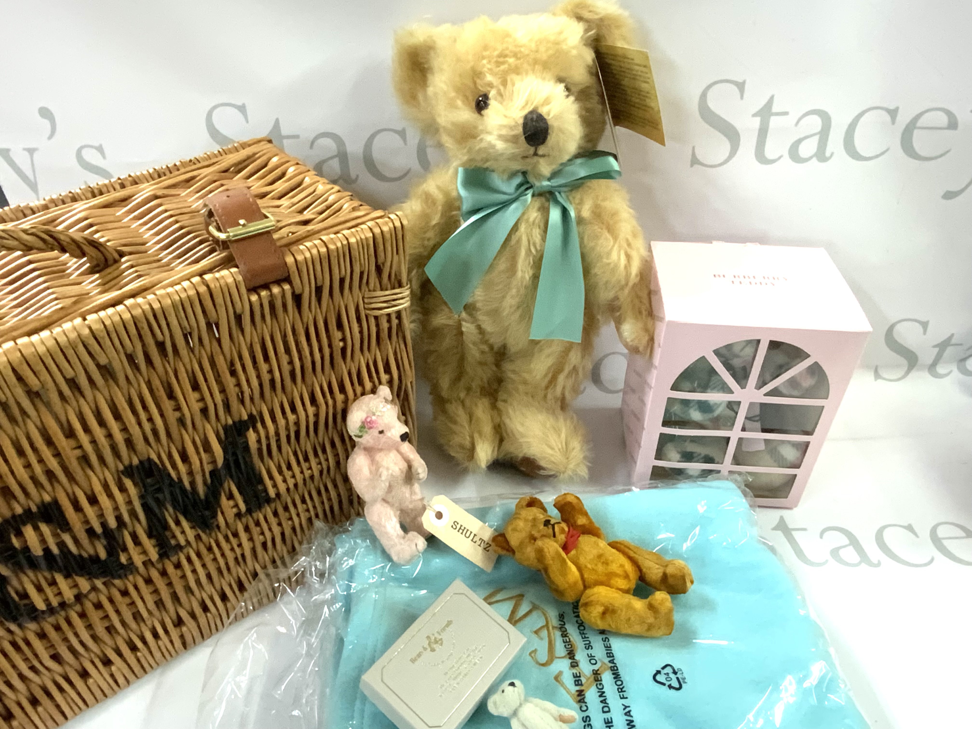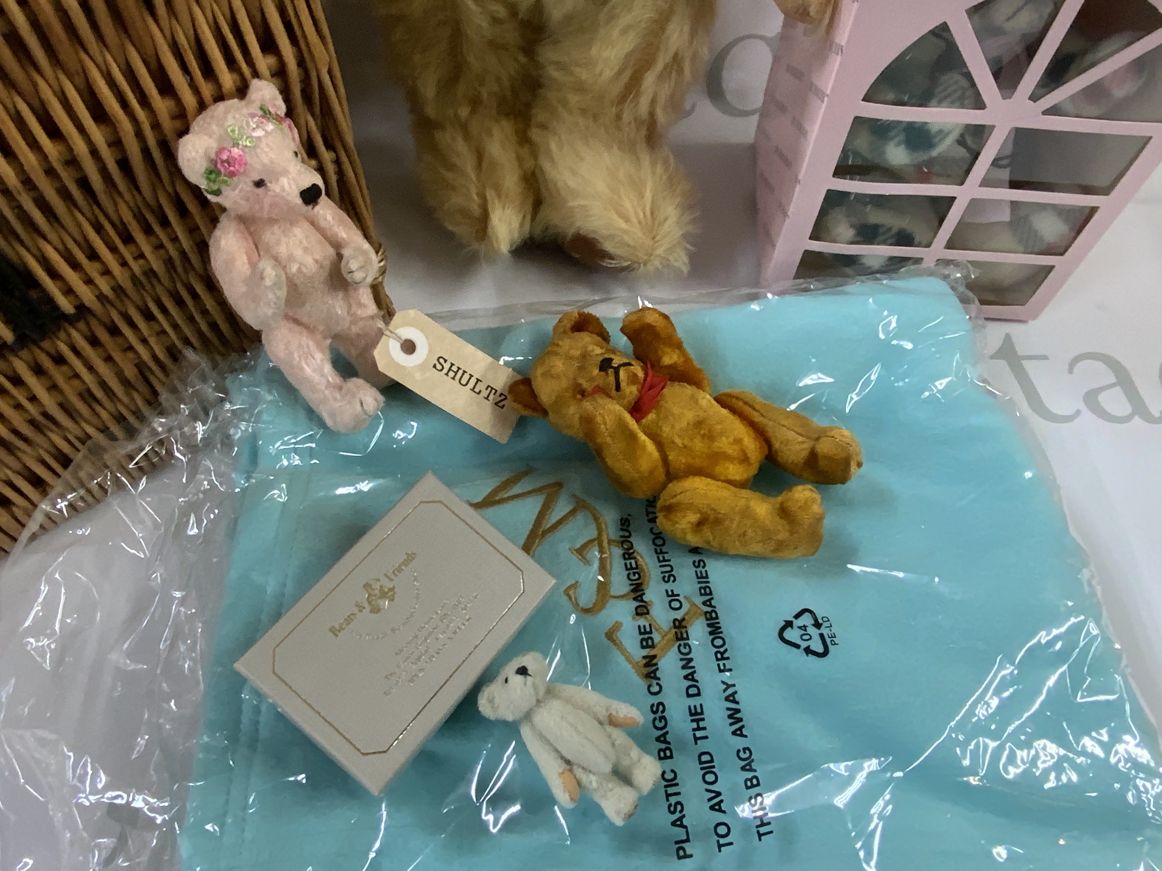 A collection of bears to include a Fortnum & Mason Bear with basket and blanket, Burberry Teddy in box with tag, a miniature Shultz Anastasia bear 1 of 5, A Tiny Bears and friends bear, a vintage teddy bear with slight damage to one leg. (C)