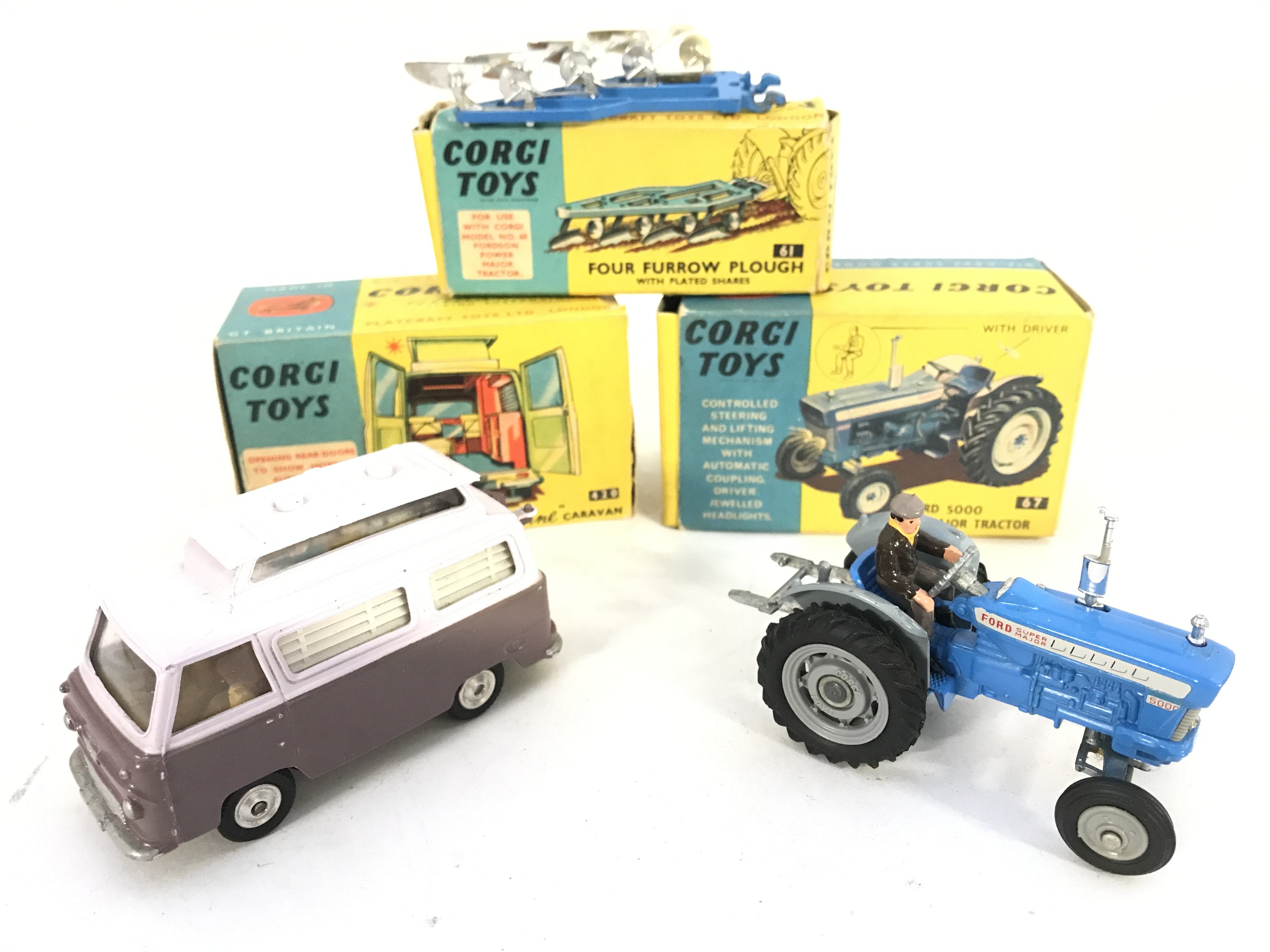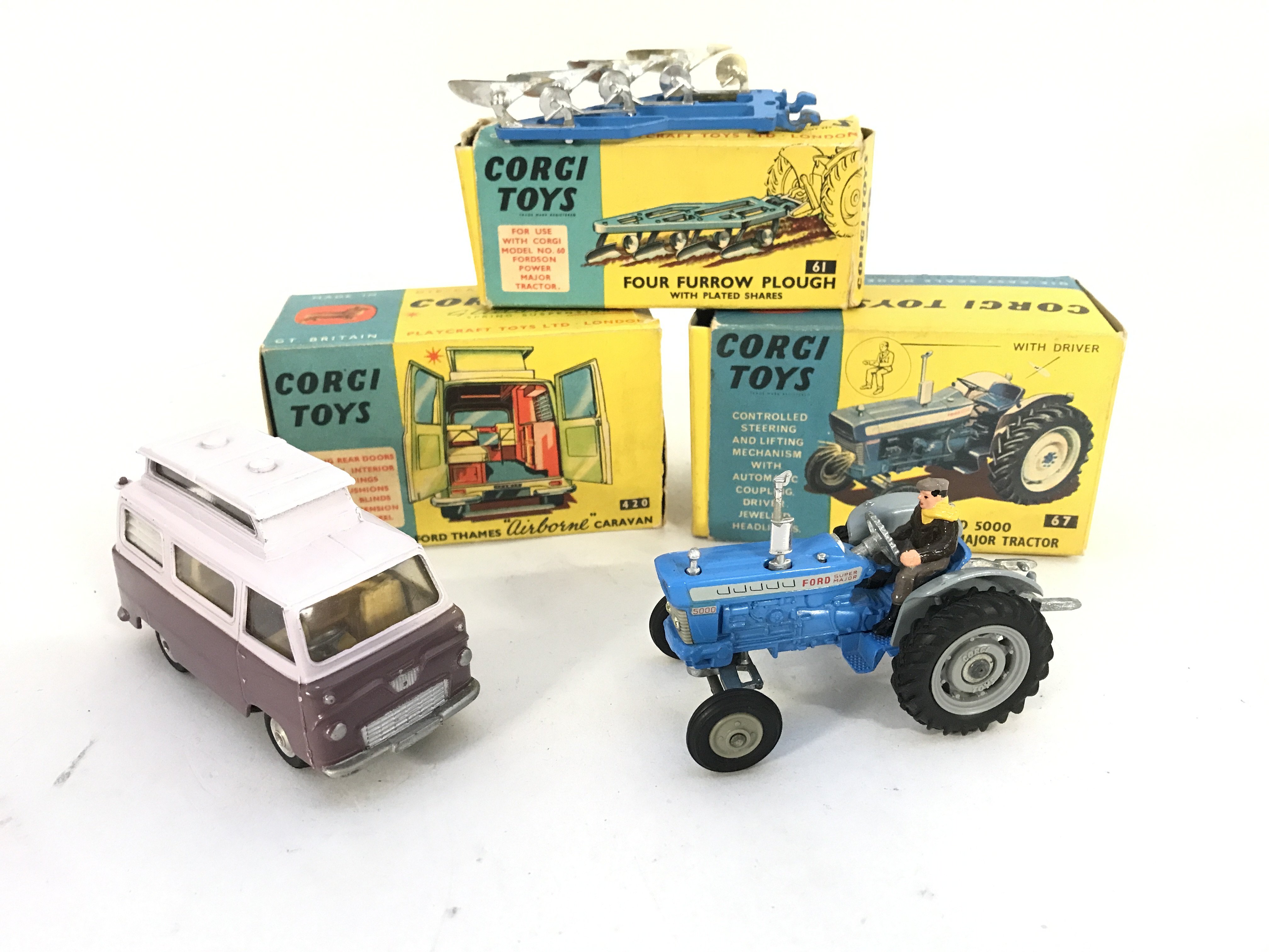 A Boxed Corgi Ford Thames Airborne Caravan #420. A Ford 5000 Super Major Tractor #67 and a Four Furrow Plough #61. No Reserve.