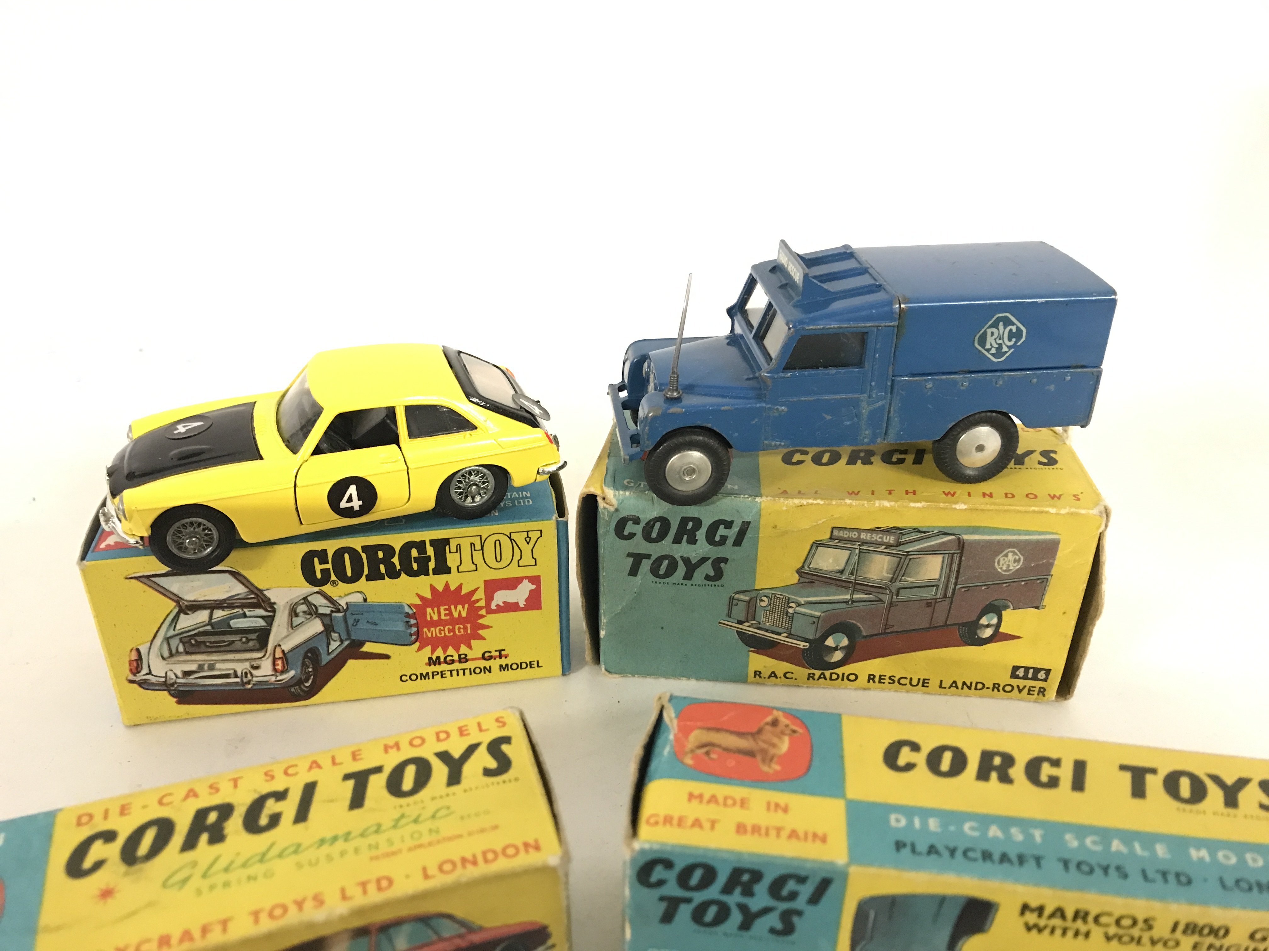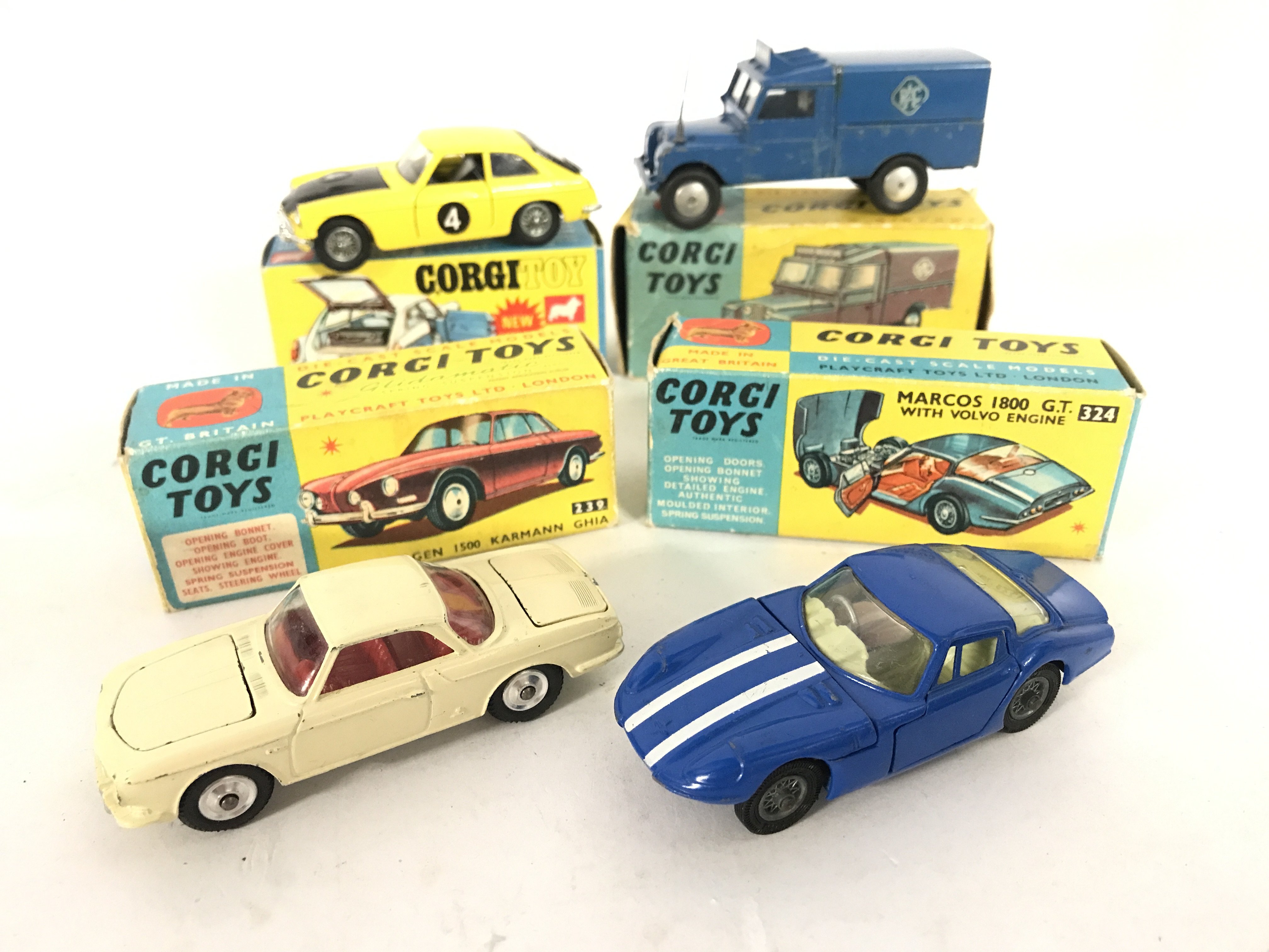 A Boxed Corgi Volkswagen 1500 Karmann Ghia #239. A Boxed Marcos 1800 G.T. #324. A MGB GT #345 and a RAC Radio Rescue Land-Rover #416. No Reserve.