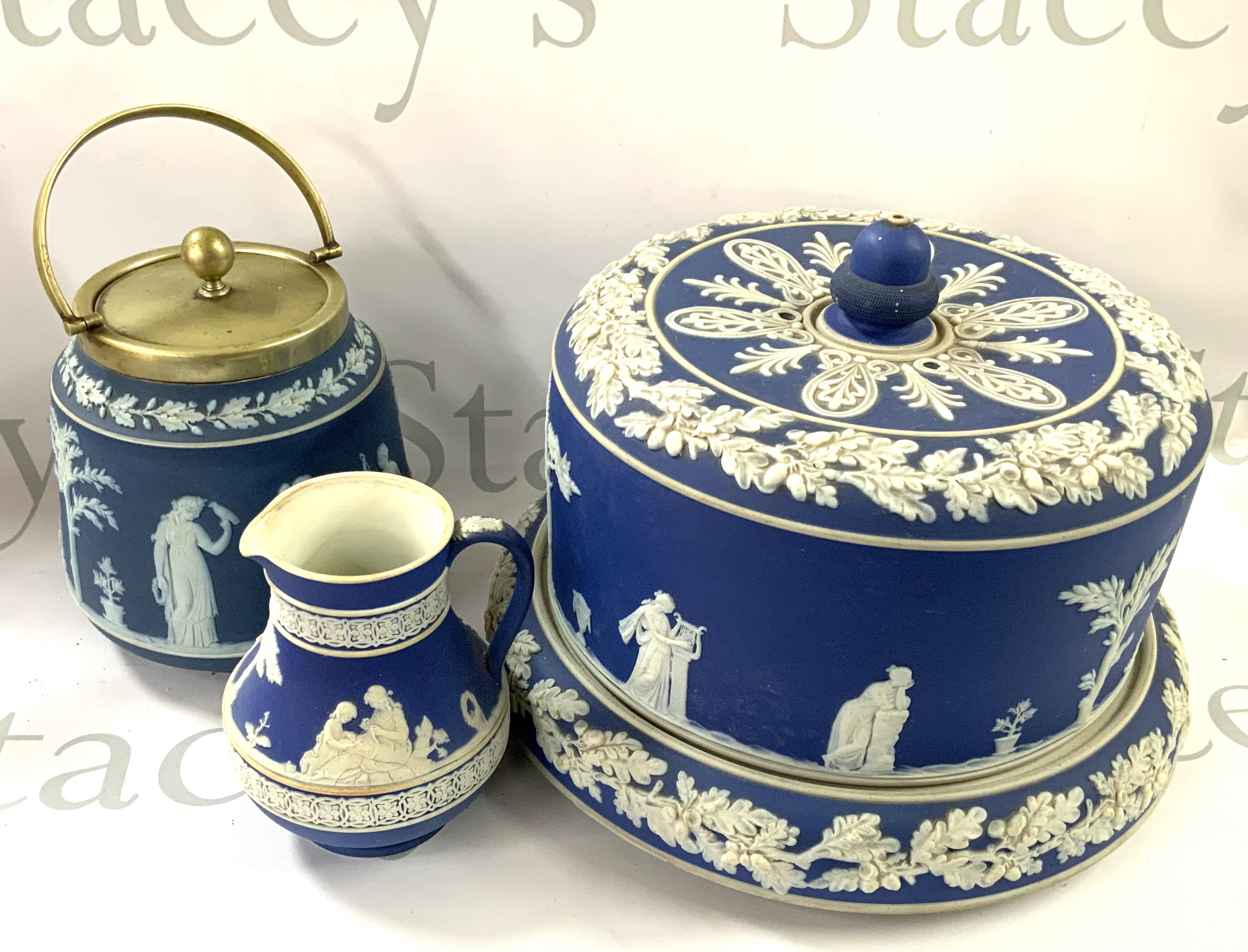 An Adam’s of Tunstall Jasper ware Stilton dish together with 2 early Jasper ware Wedgewood pieces.m