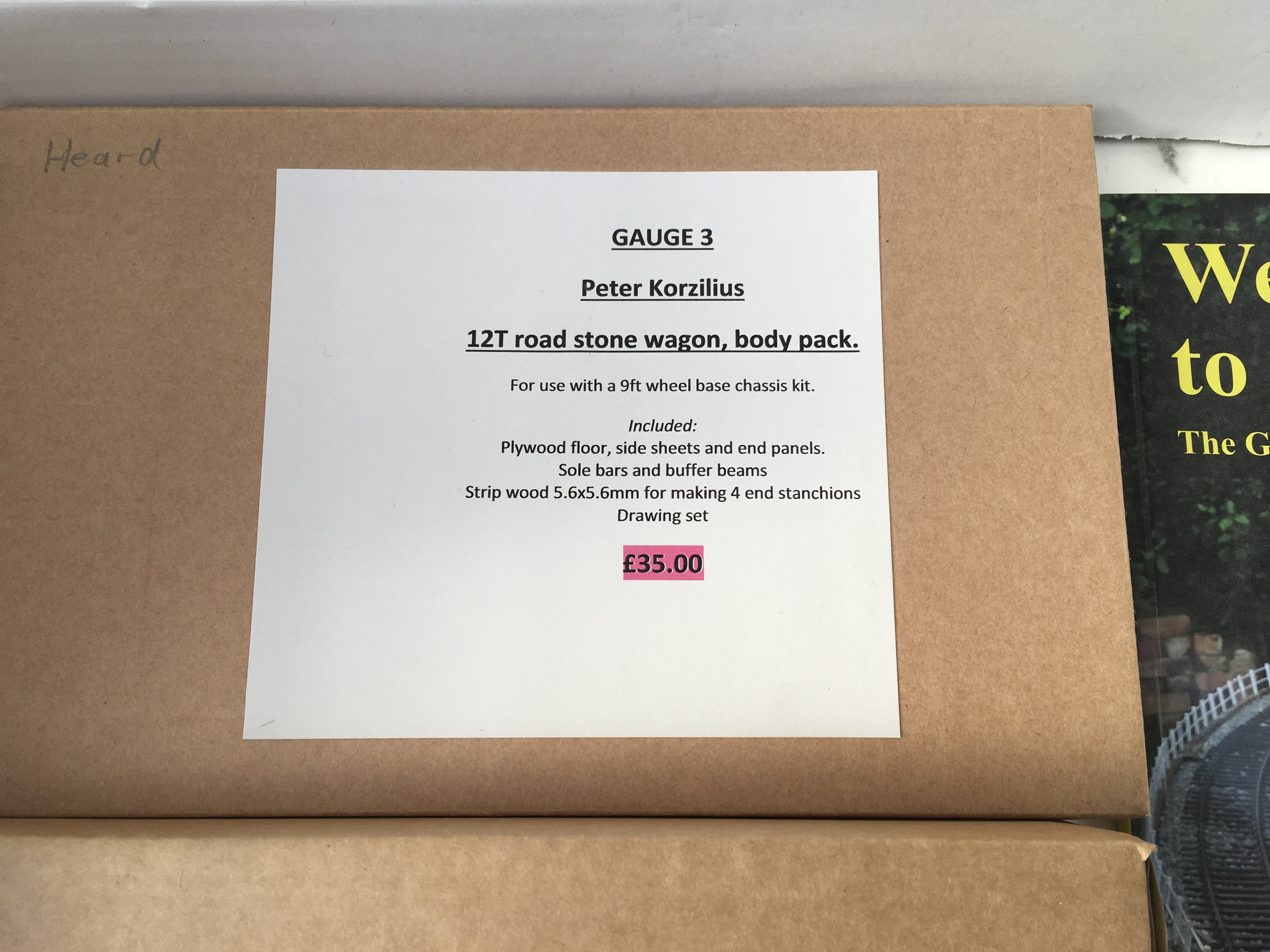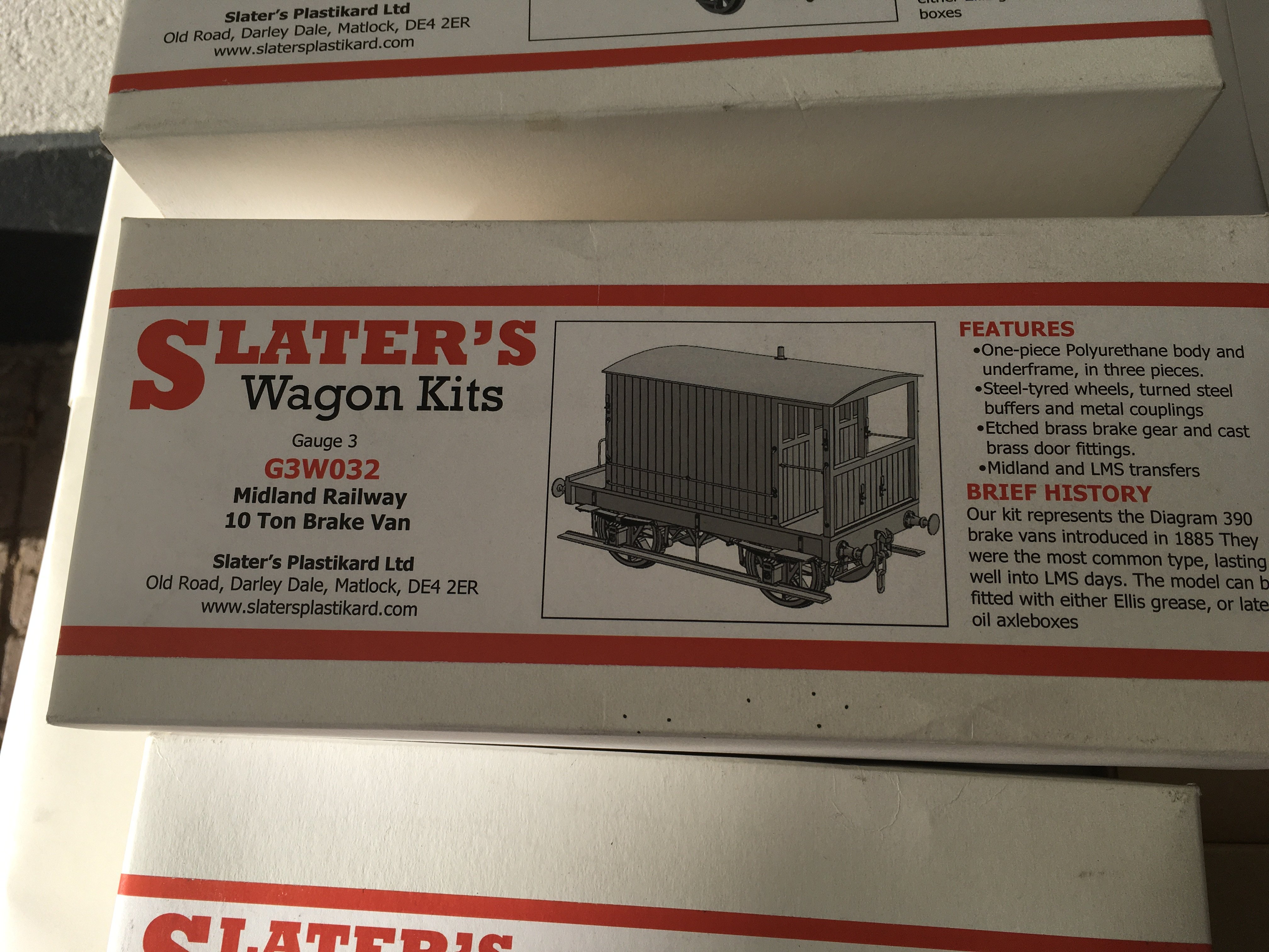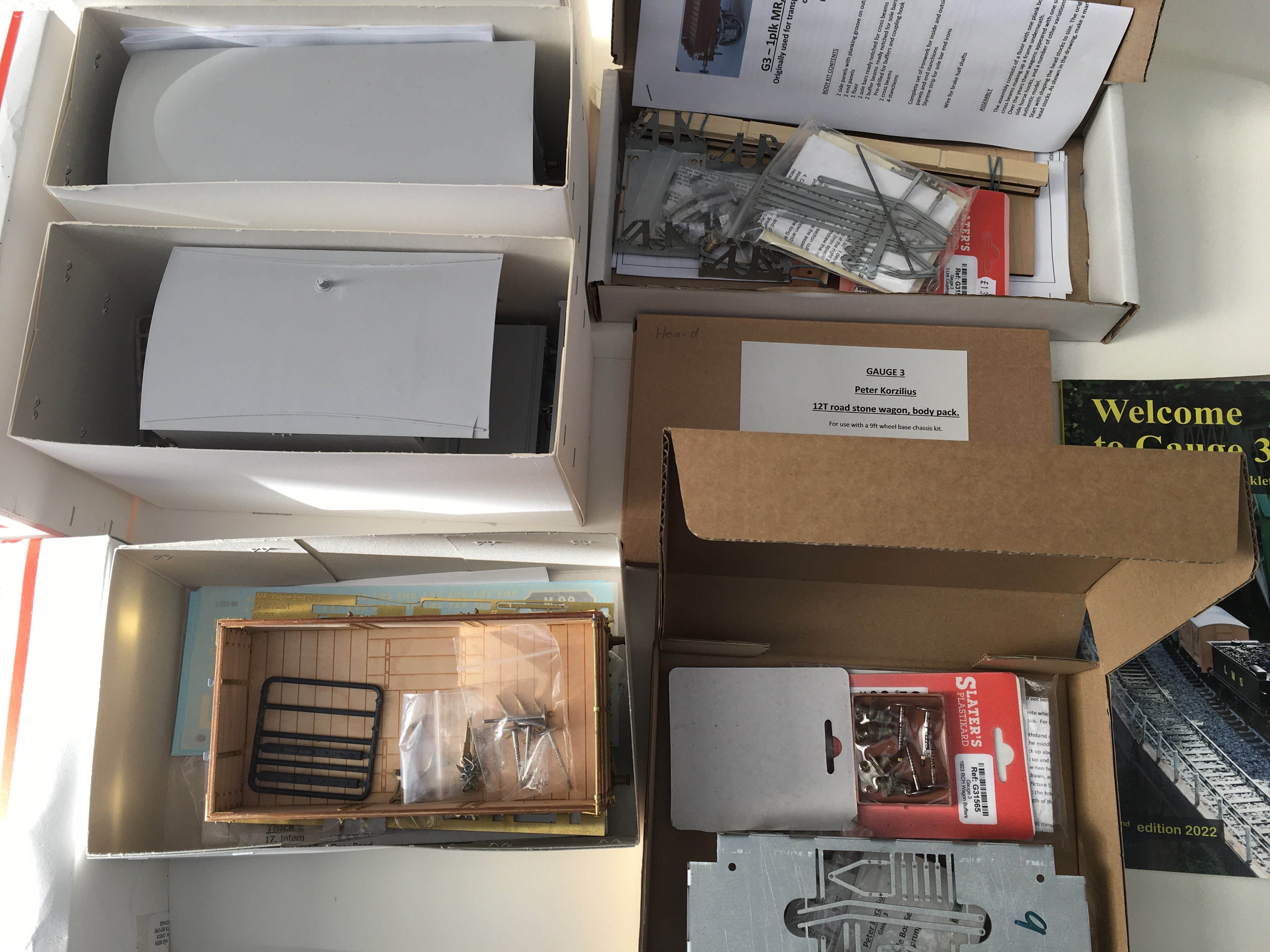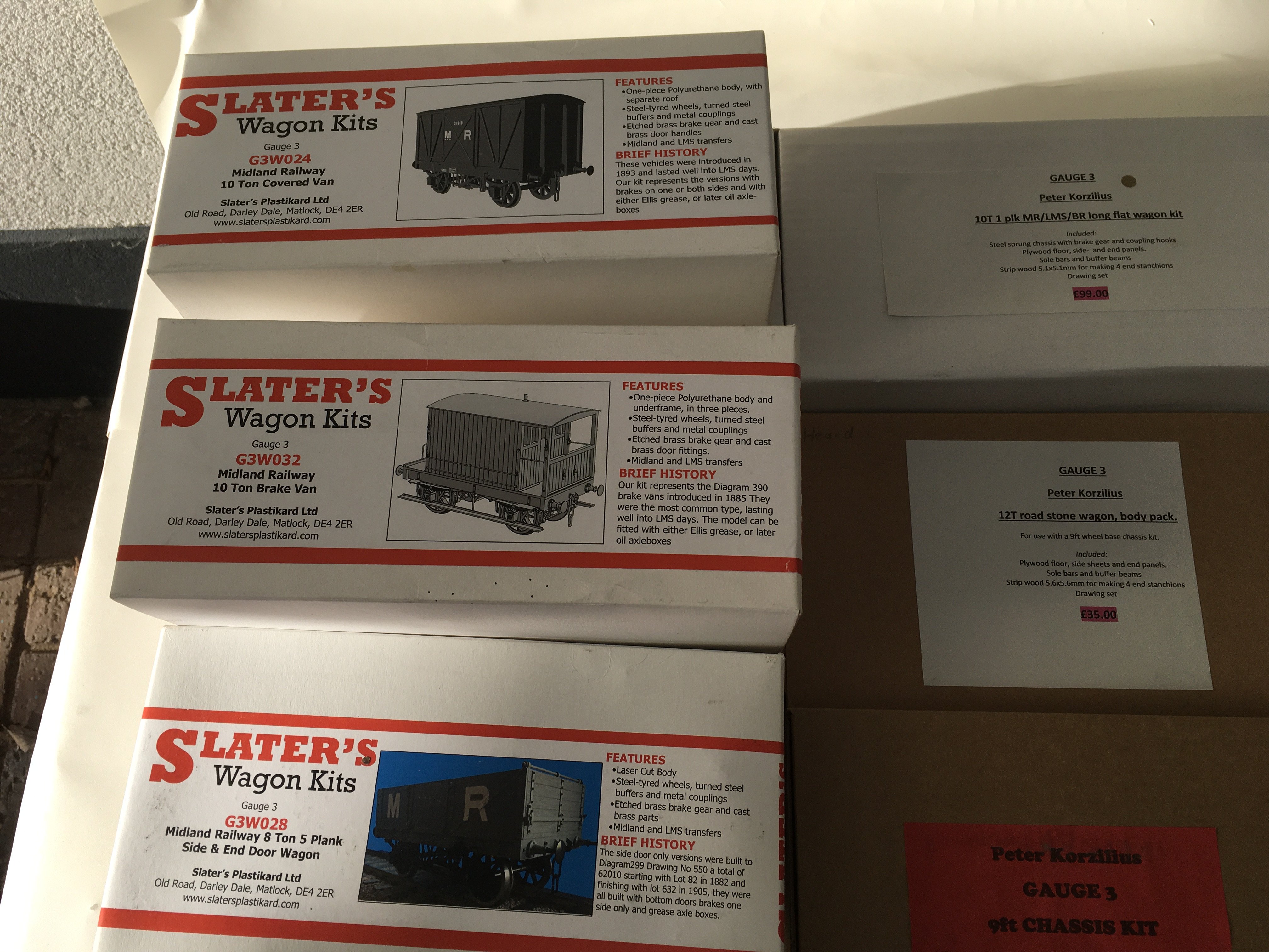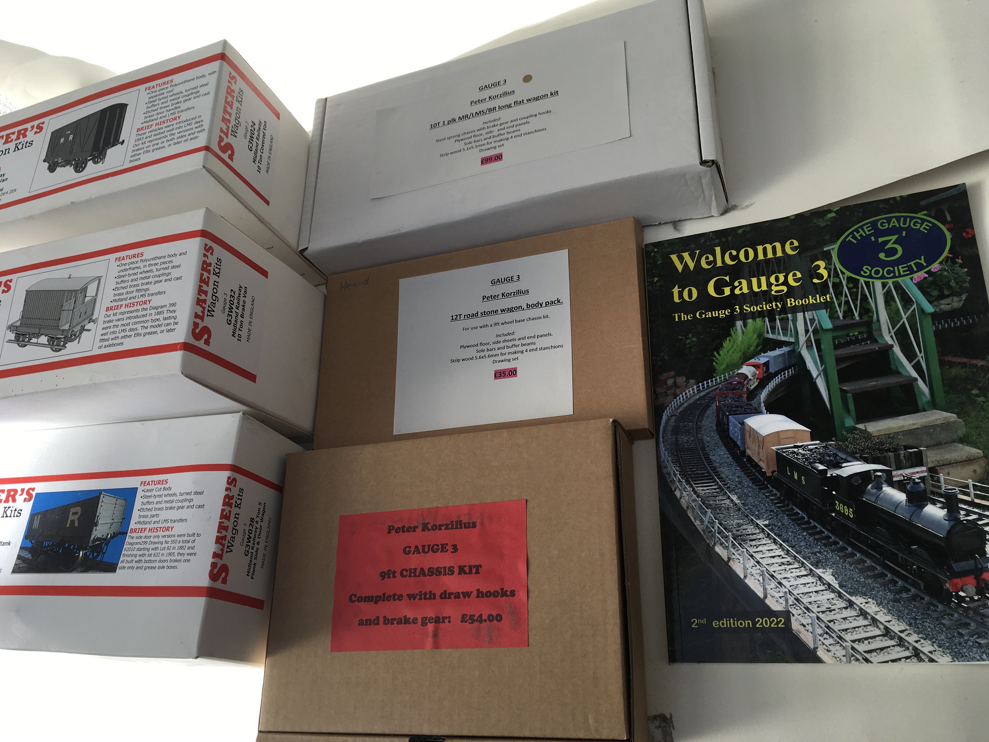 A collection of 3 gauge Model railway boxed wagon kits by Slaters including G3W024..028..032. Also 3x boxed by Peter Korzilius. No reserve