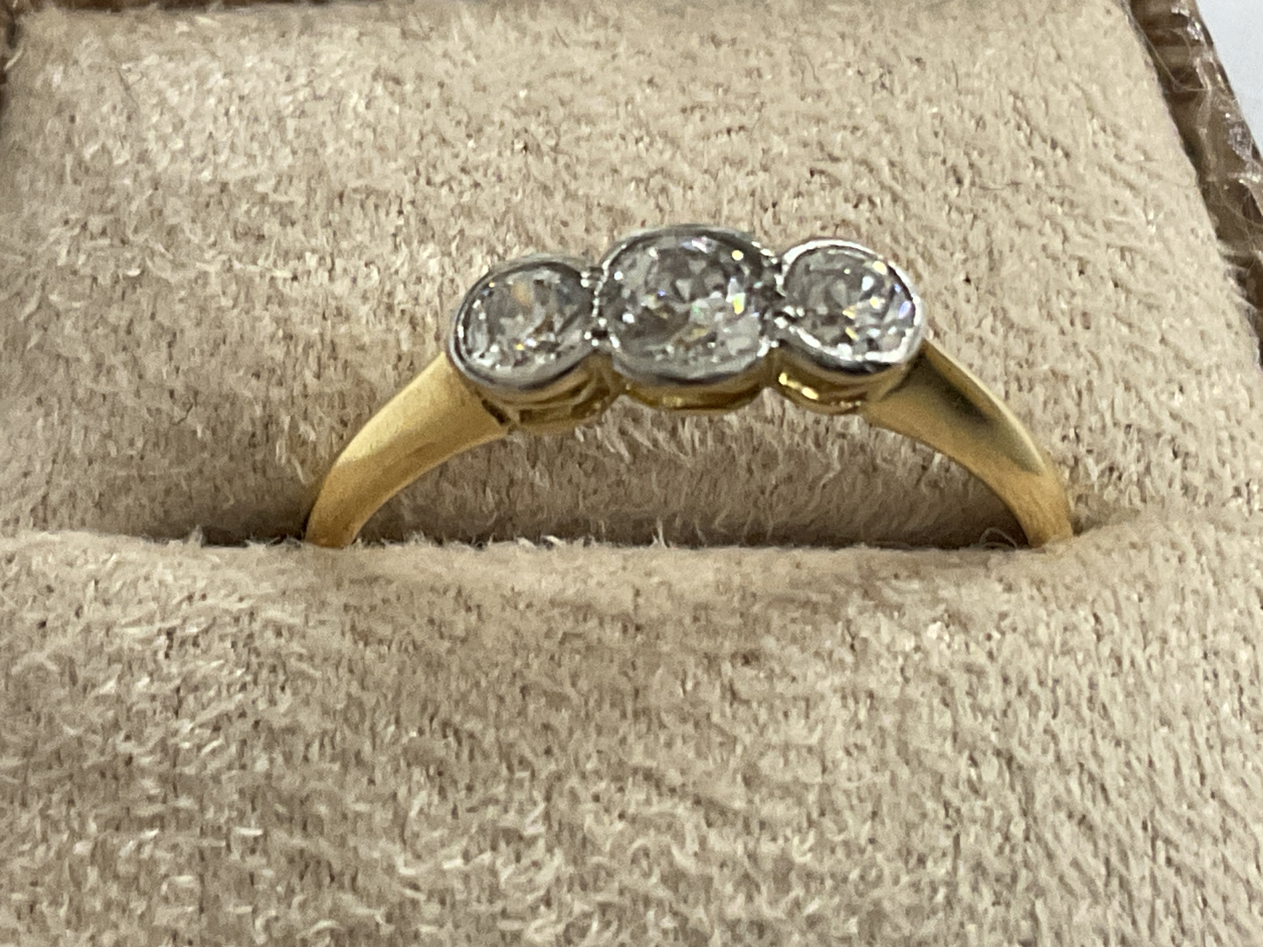 18ct yellow gold graduated RBC diamond rub over set trilogy ring with stylish box. Diamonds 0.45ct. Ring size approx K. Postage category A.