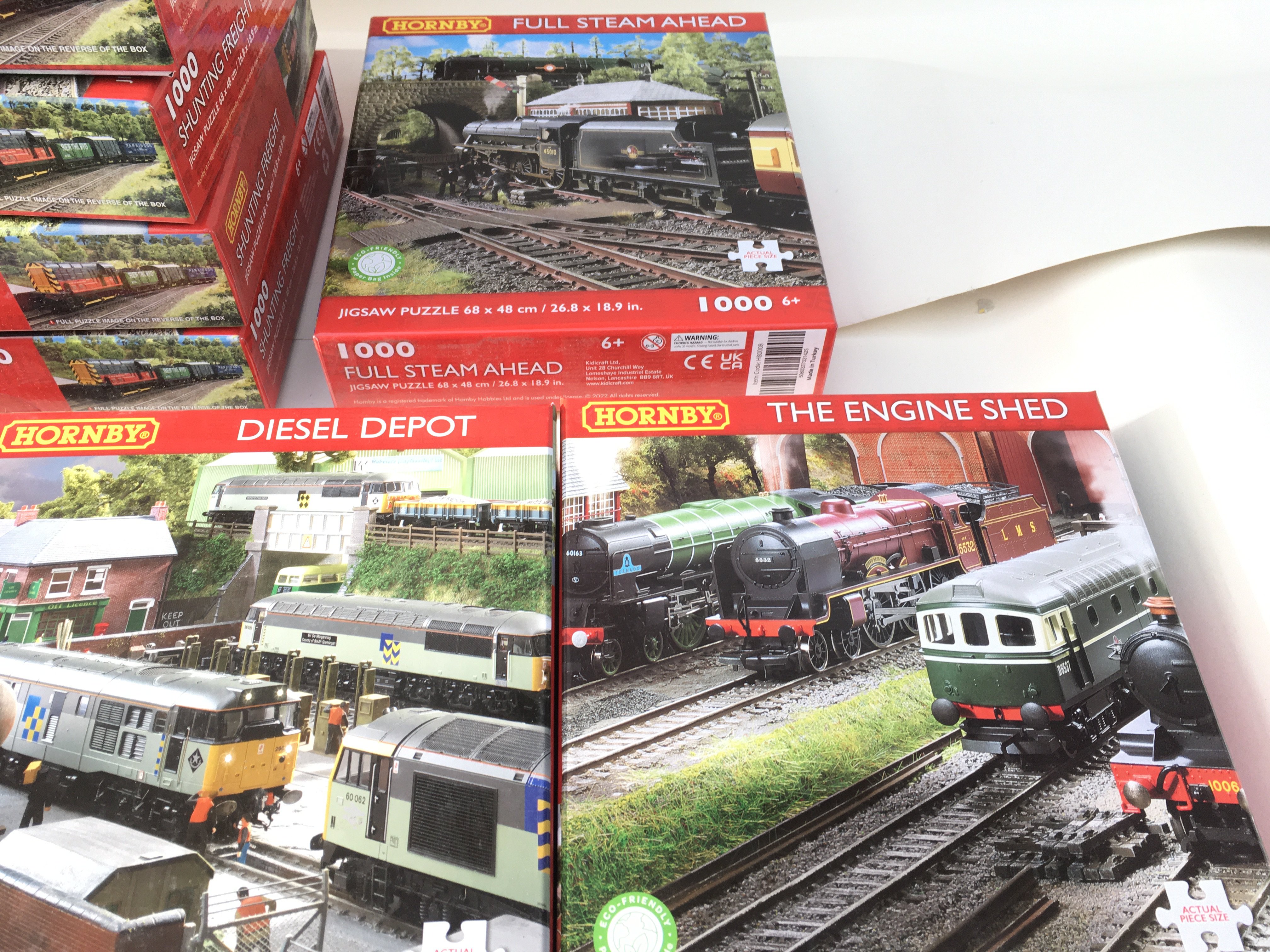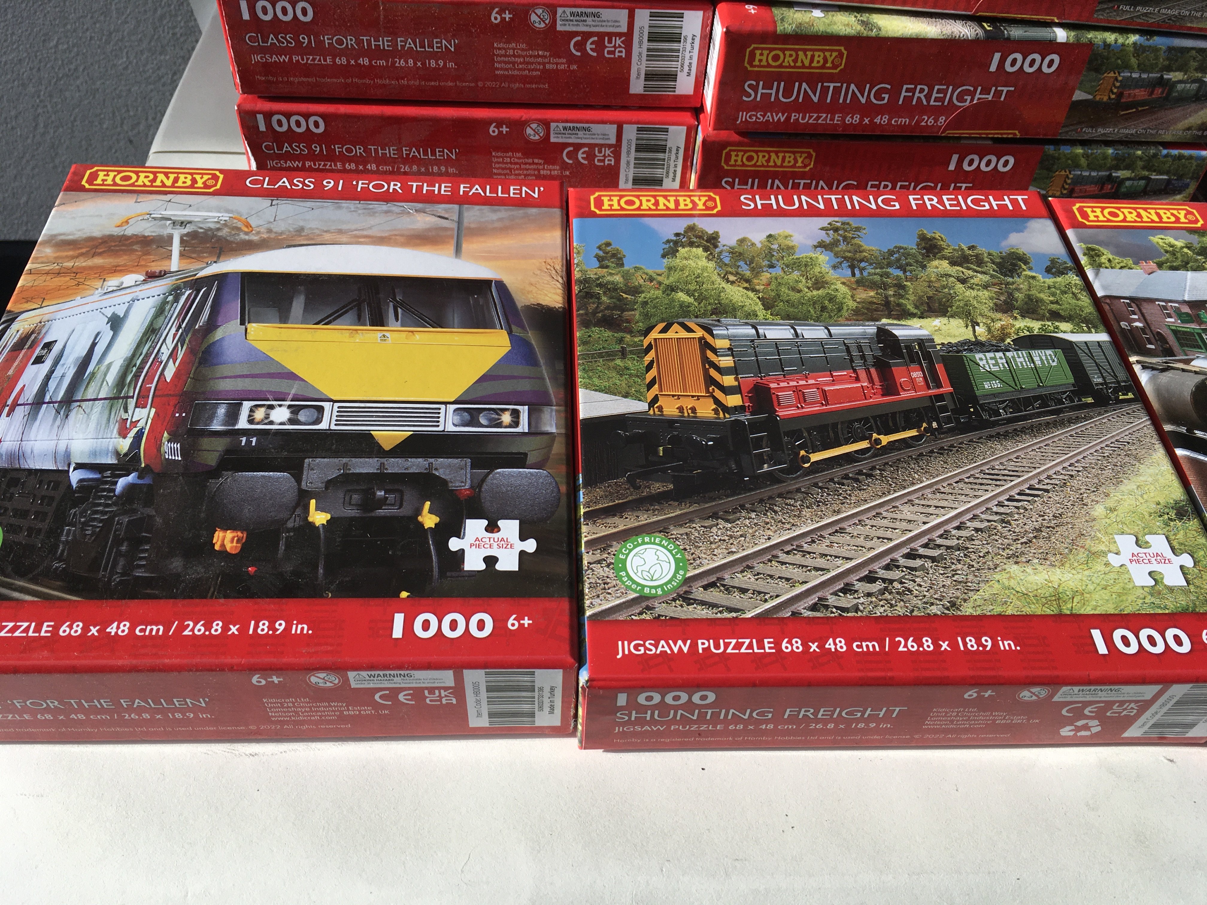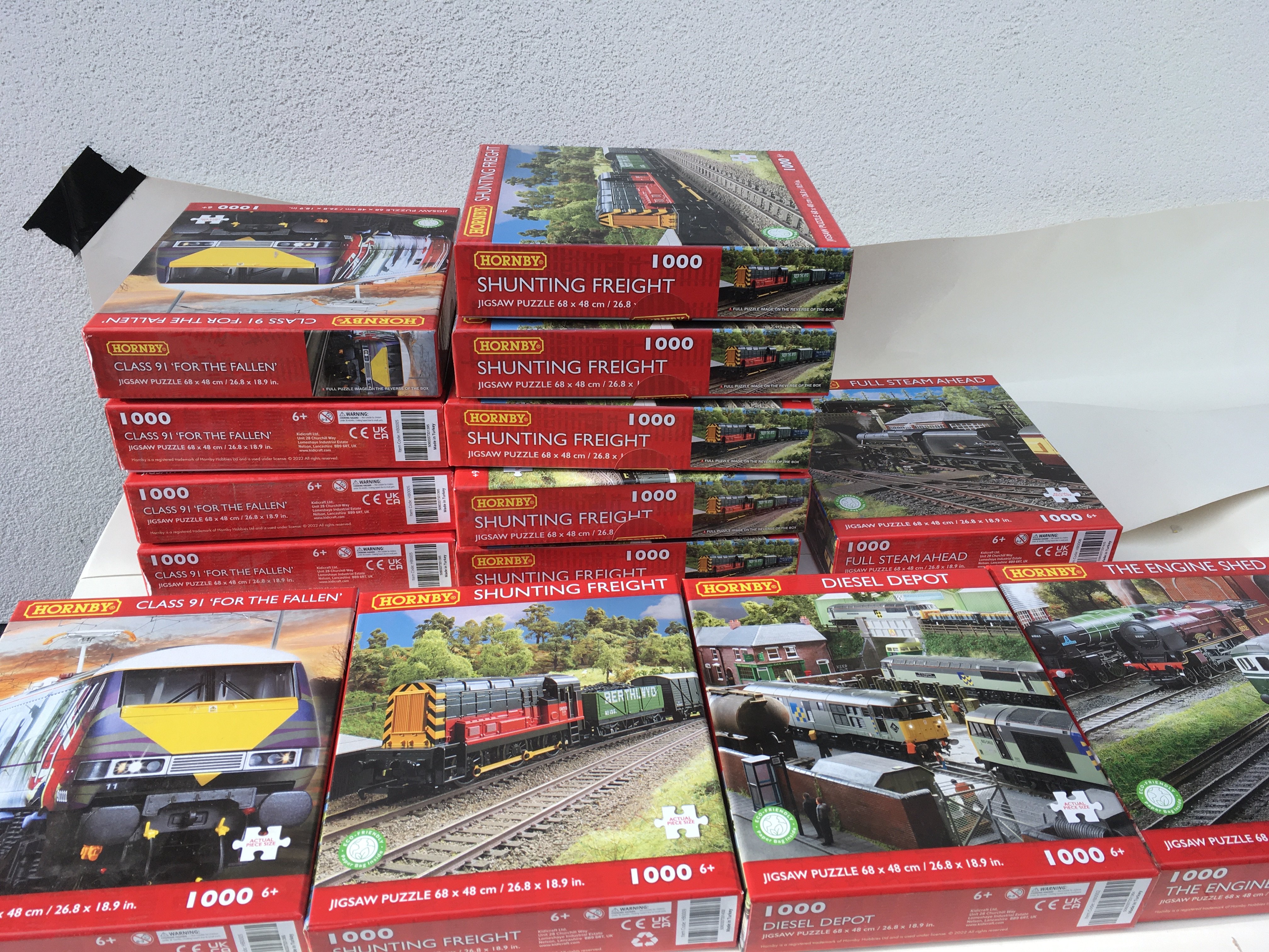 A collection of 14 new boxed railway themed jigsaw puzzles by Hornby each is 1000 pieces and for ages 6 plus. No reserve