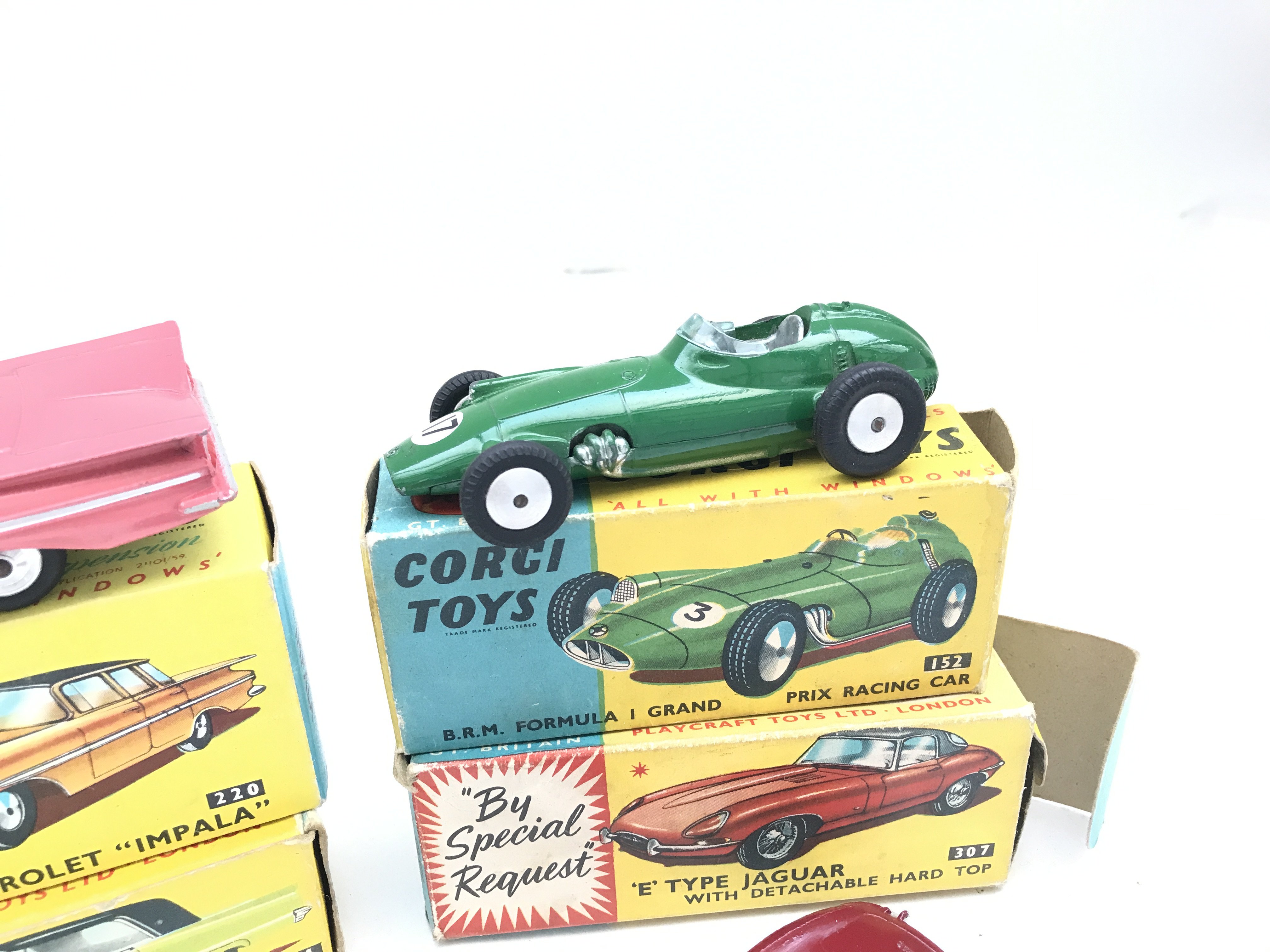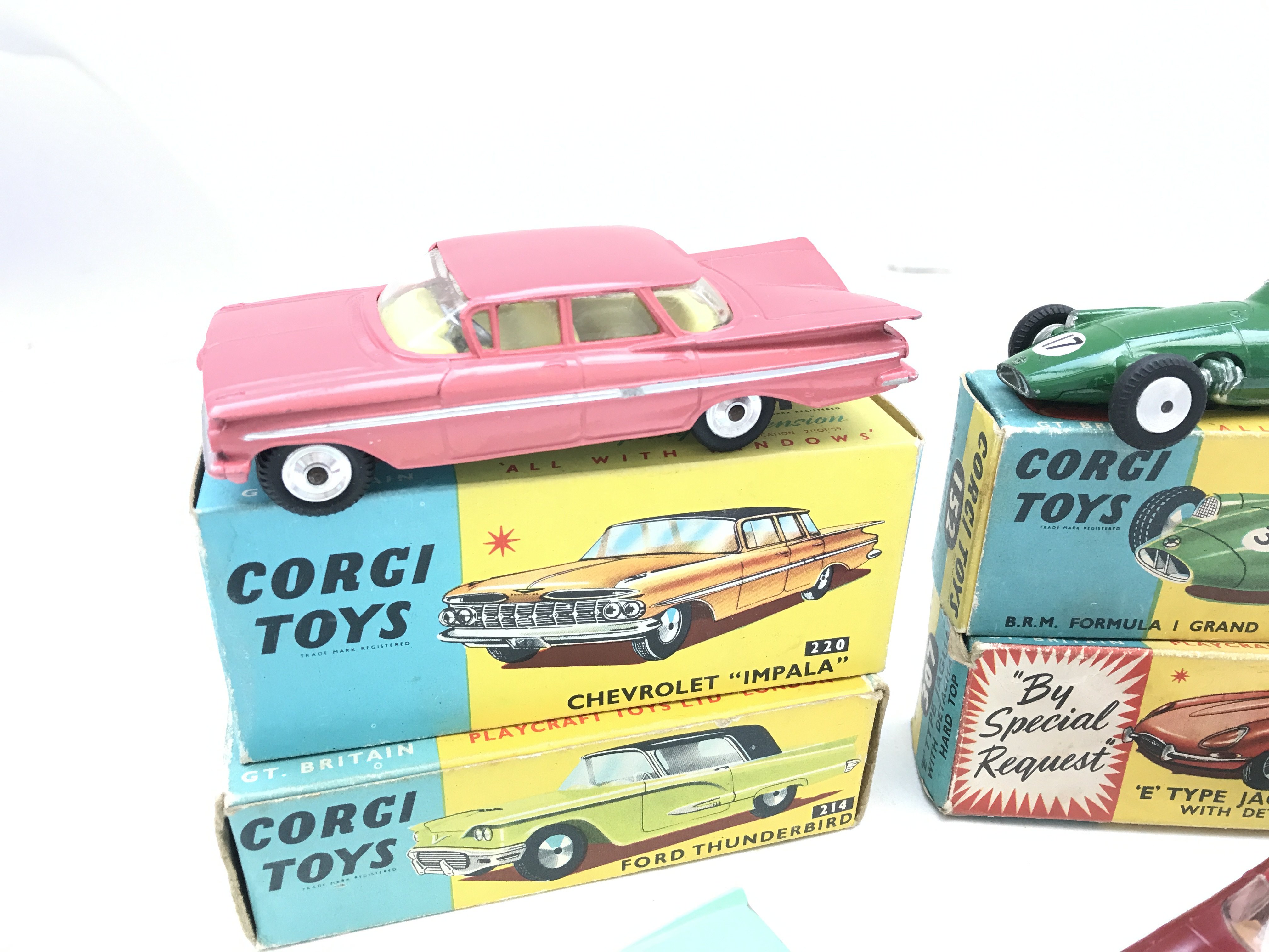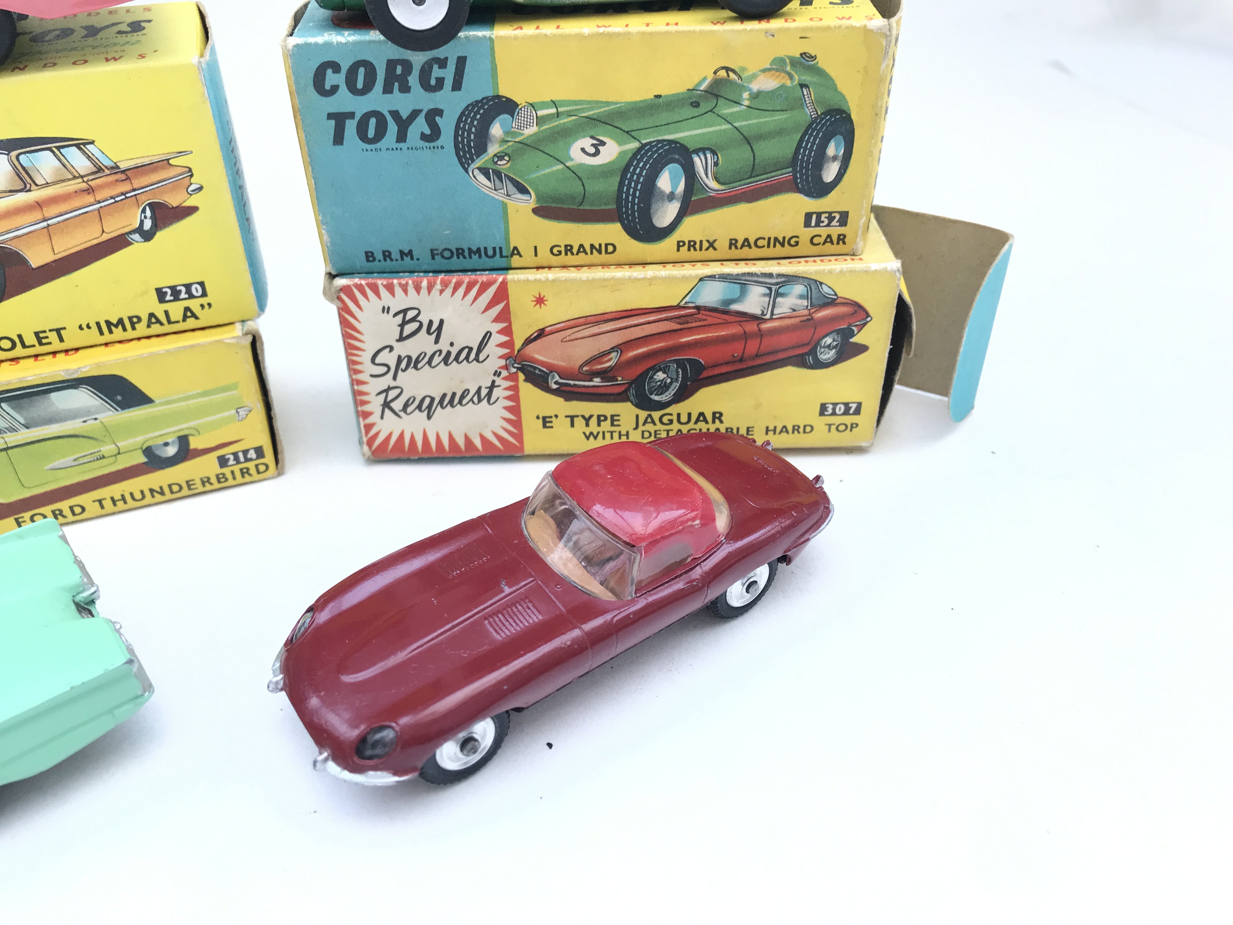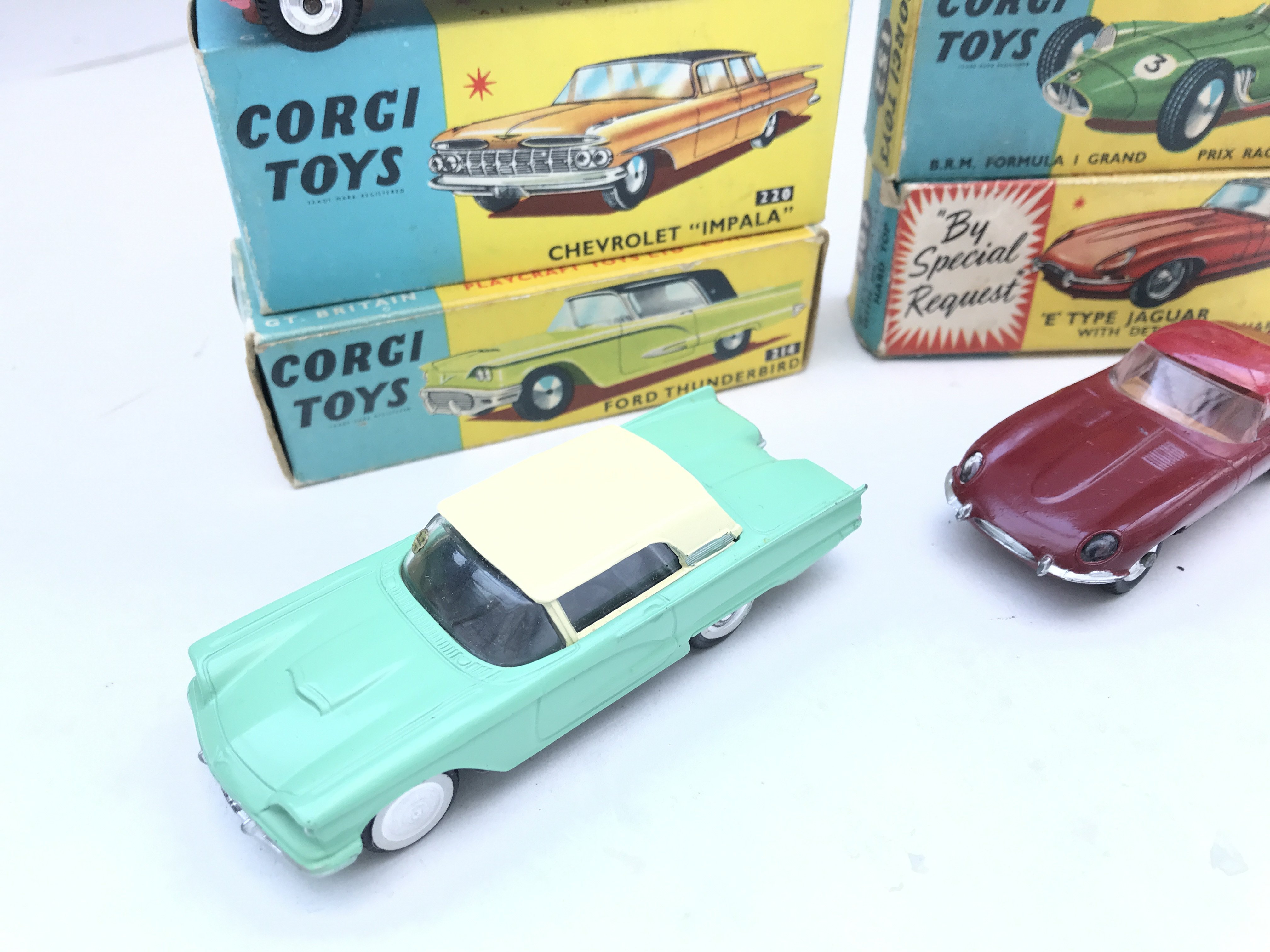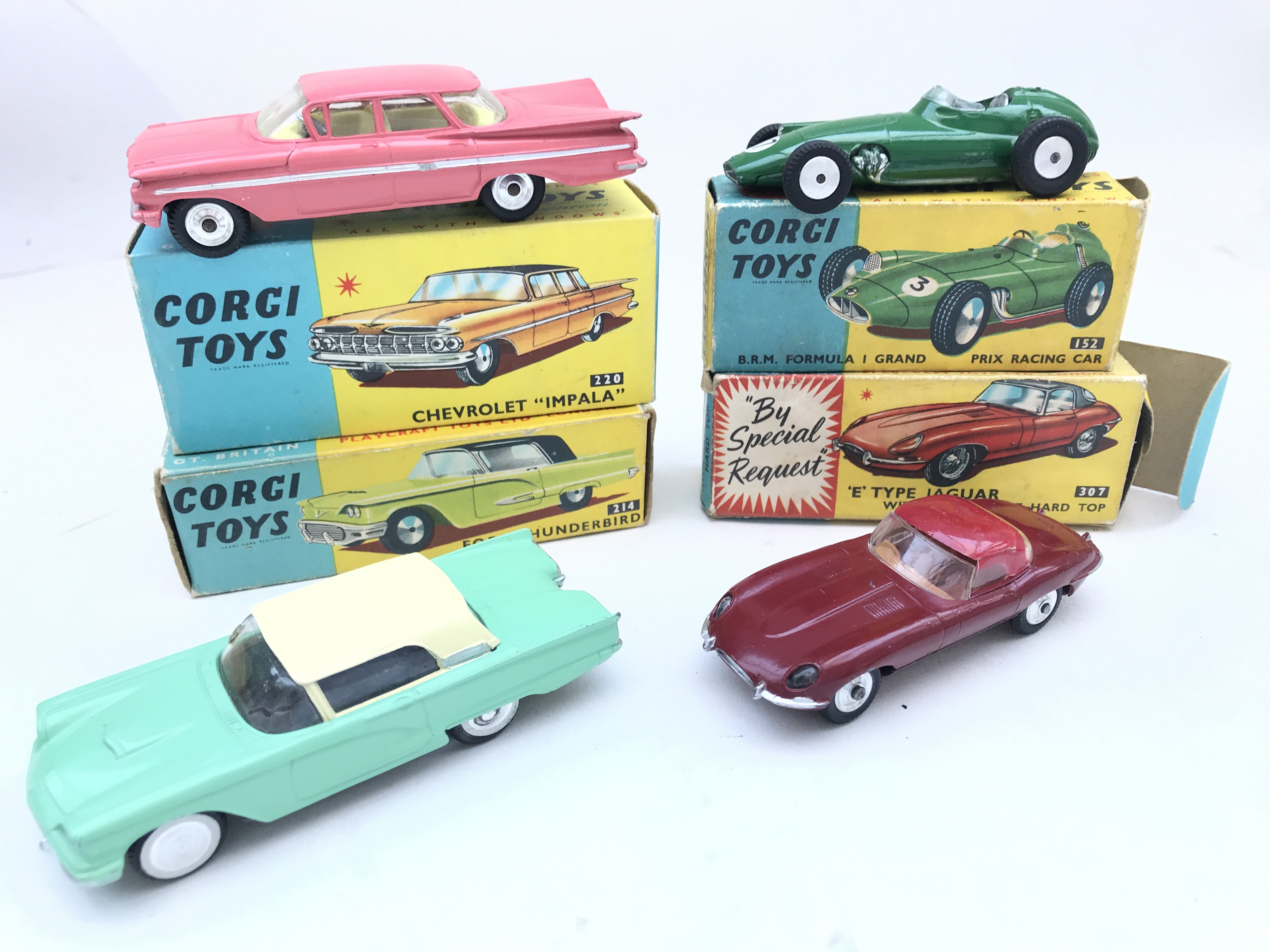A Boxed Corgi Chevrolet Impala #220. A BRM Formula 1 Grand Prix Racing Car #152. A E Type Jaguar #307.. And a Ford Thunderbird #214. No Reserve.
