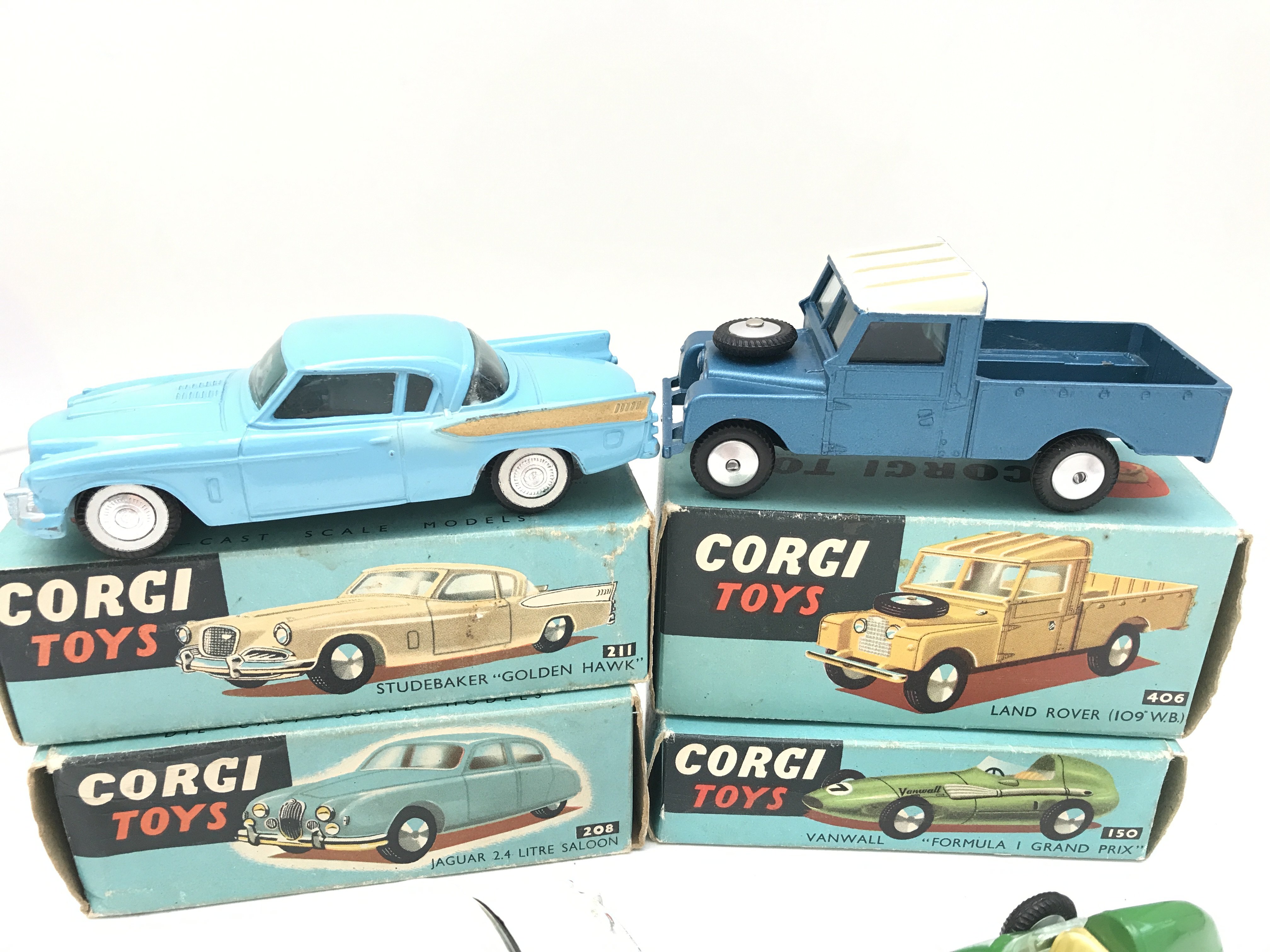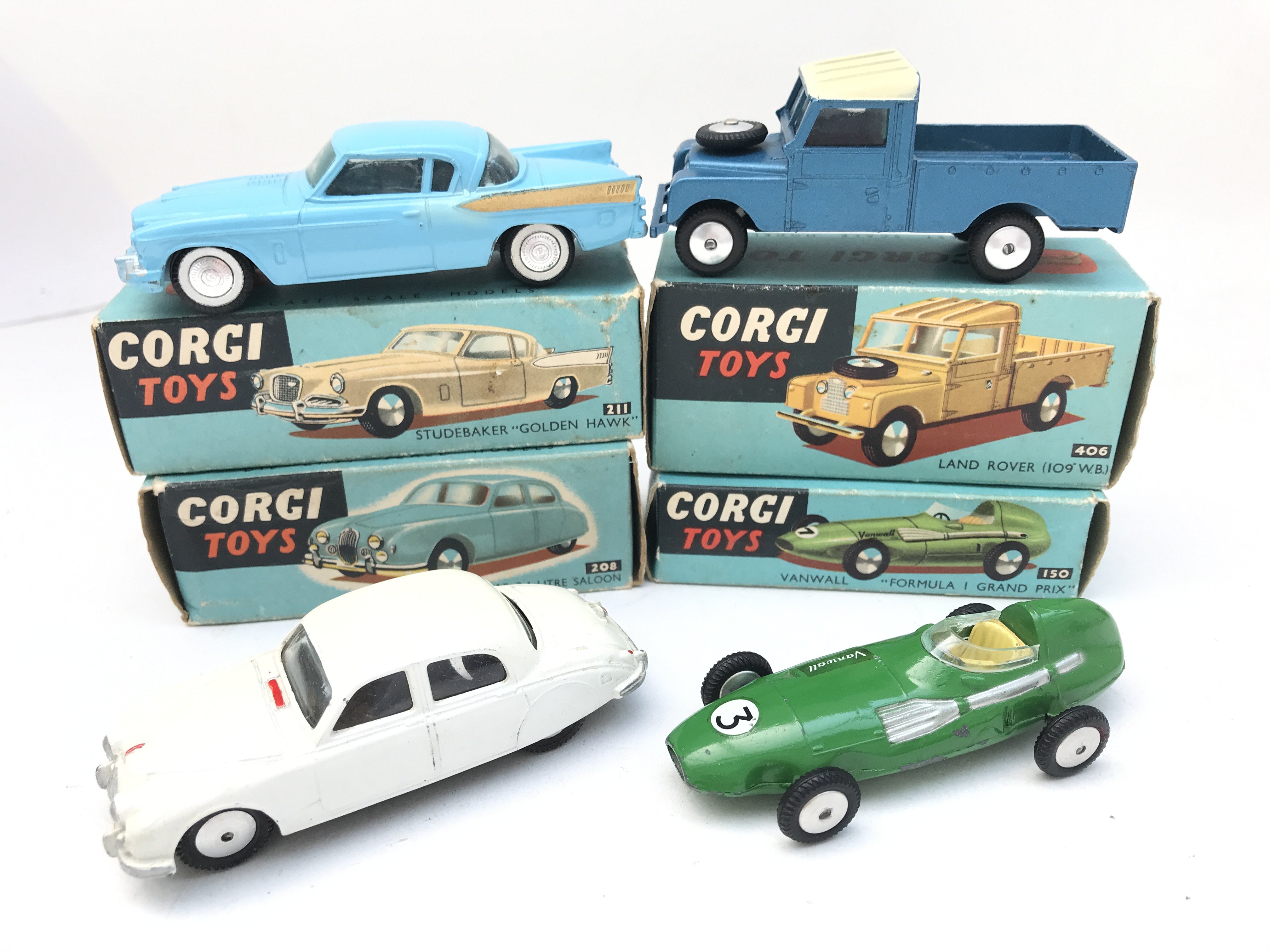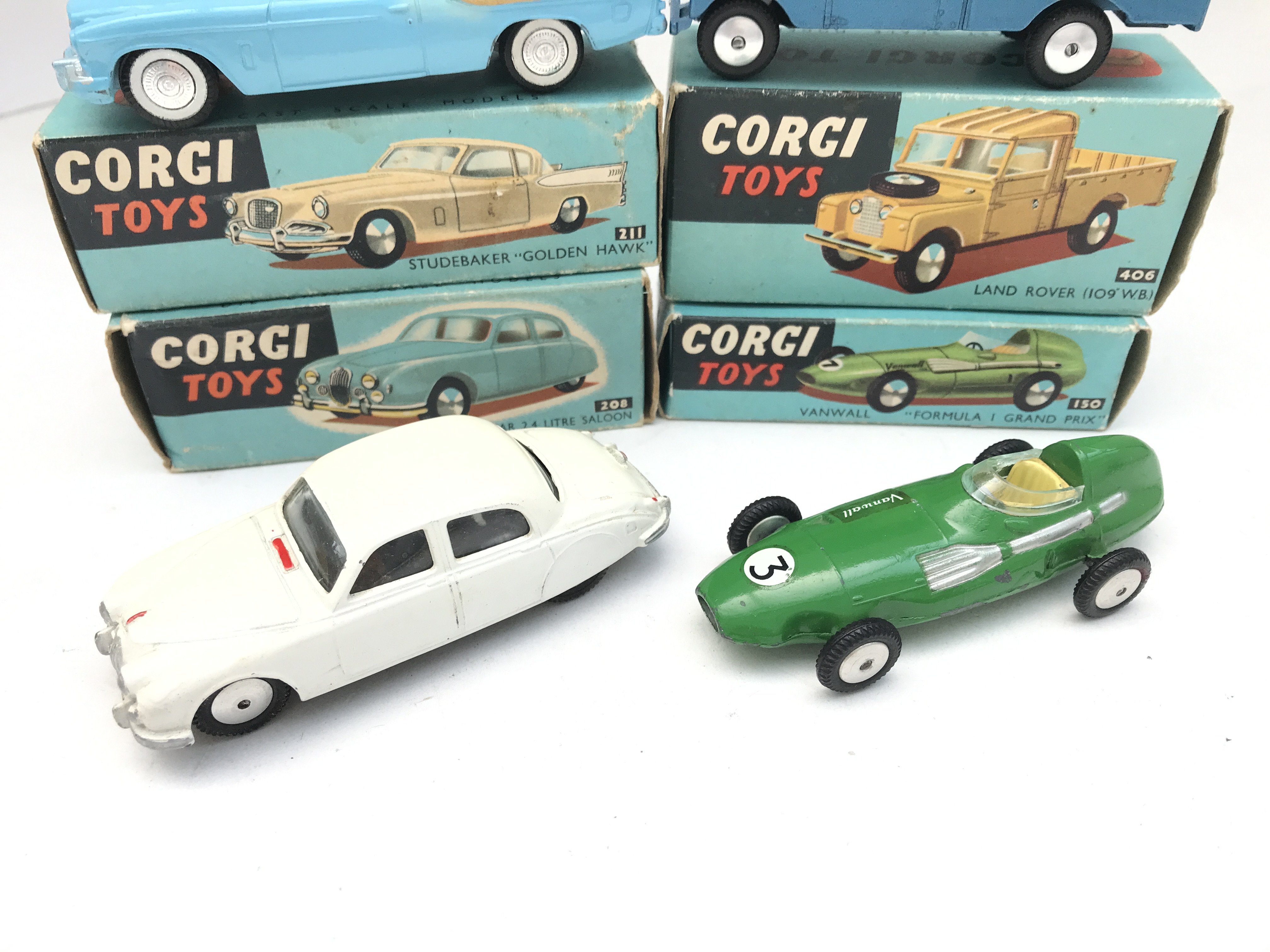 A Boxed Corgi Studebaker Golden Hawk #211. A Land Rover #406. A Jaguar 2.4 Litre Saloon #208 and a Vanwall F1 Grand Prix #150.