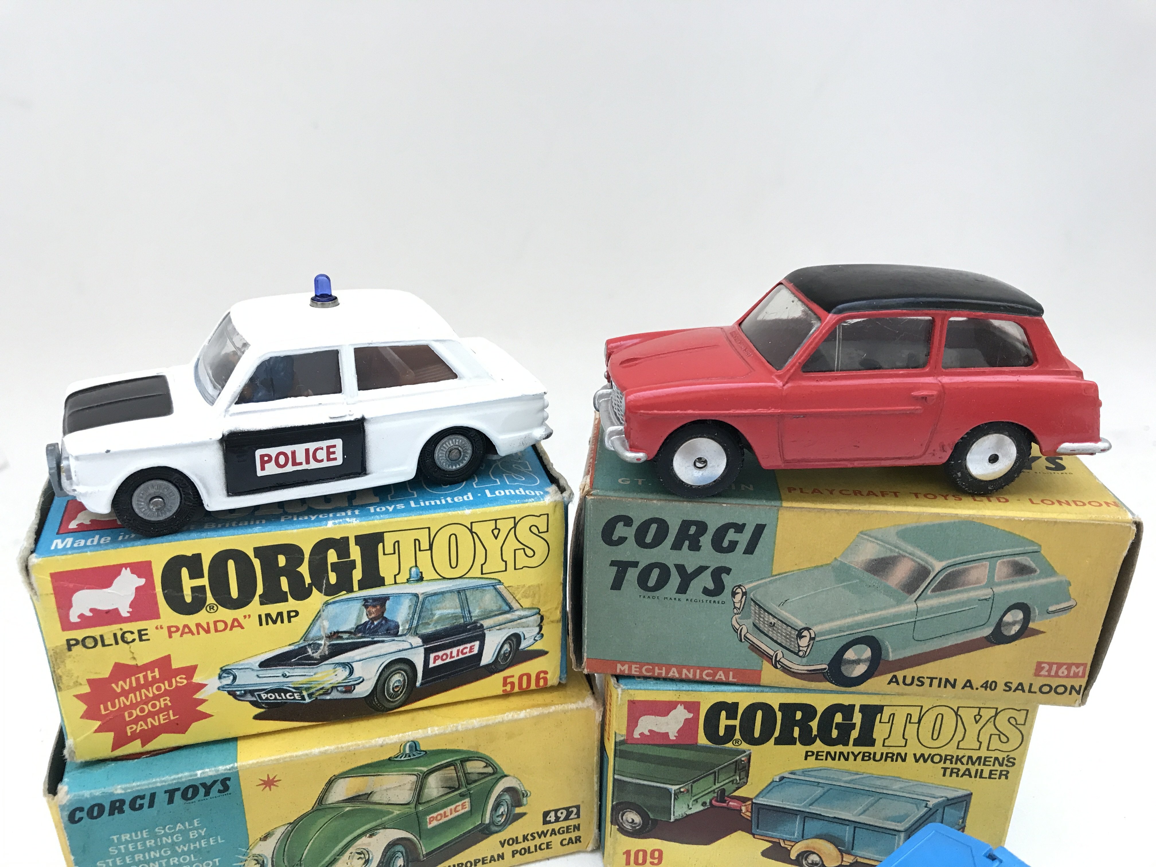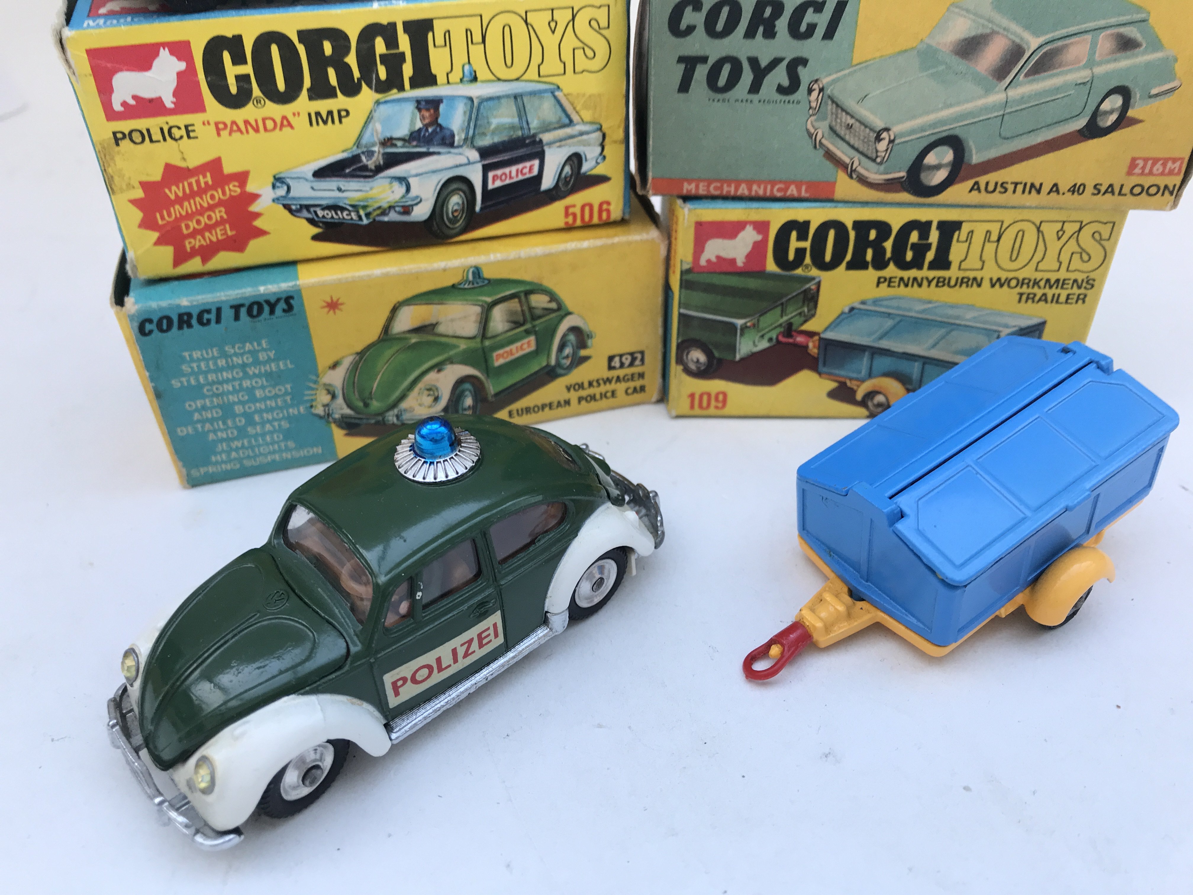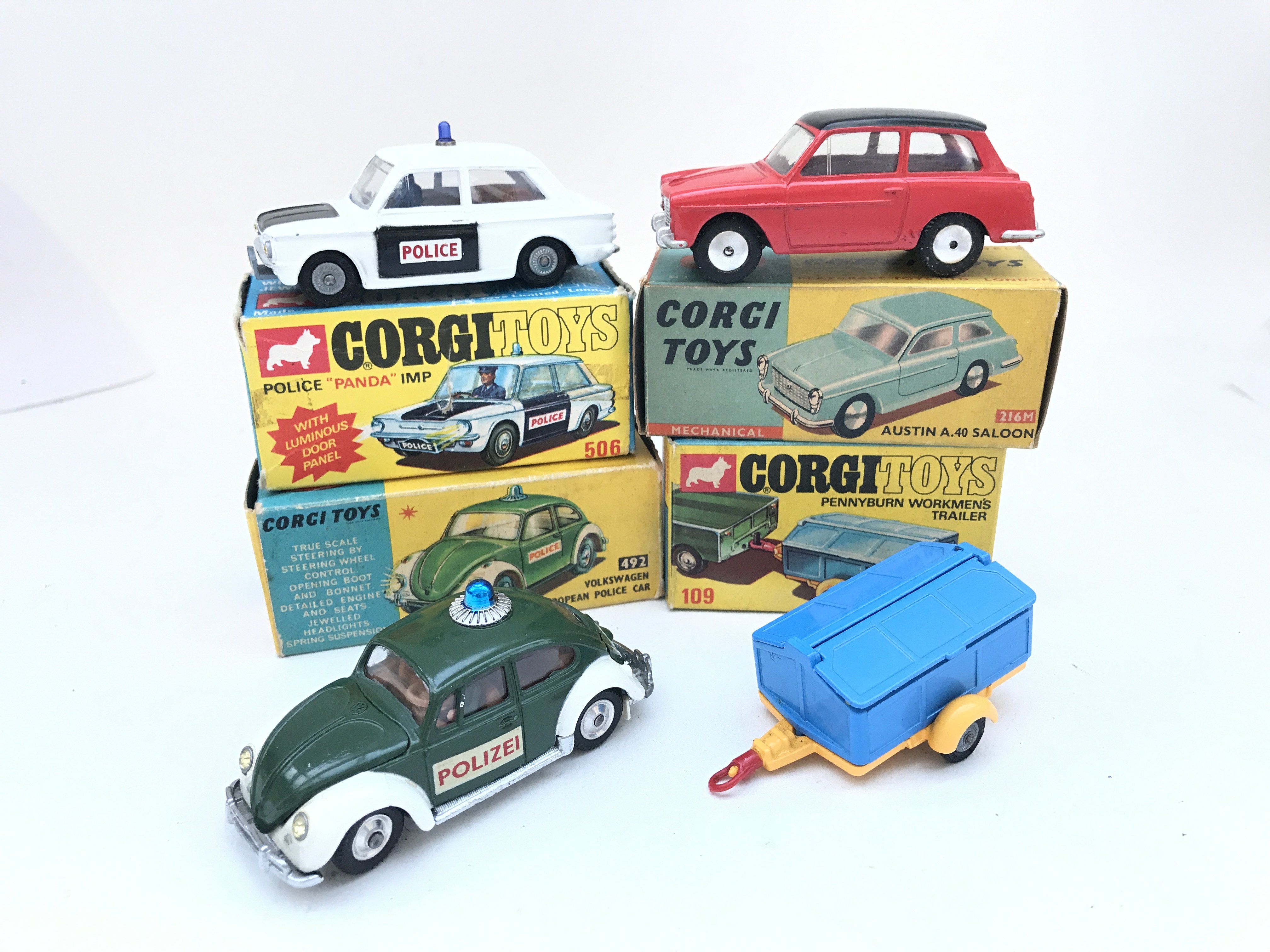 A Boxed Corgi Police Panda IMP 506 an Austin A.40 Saloon #216M A Volkswagen Police Car #492 and a Pennyburn Workman's Trailer #109.