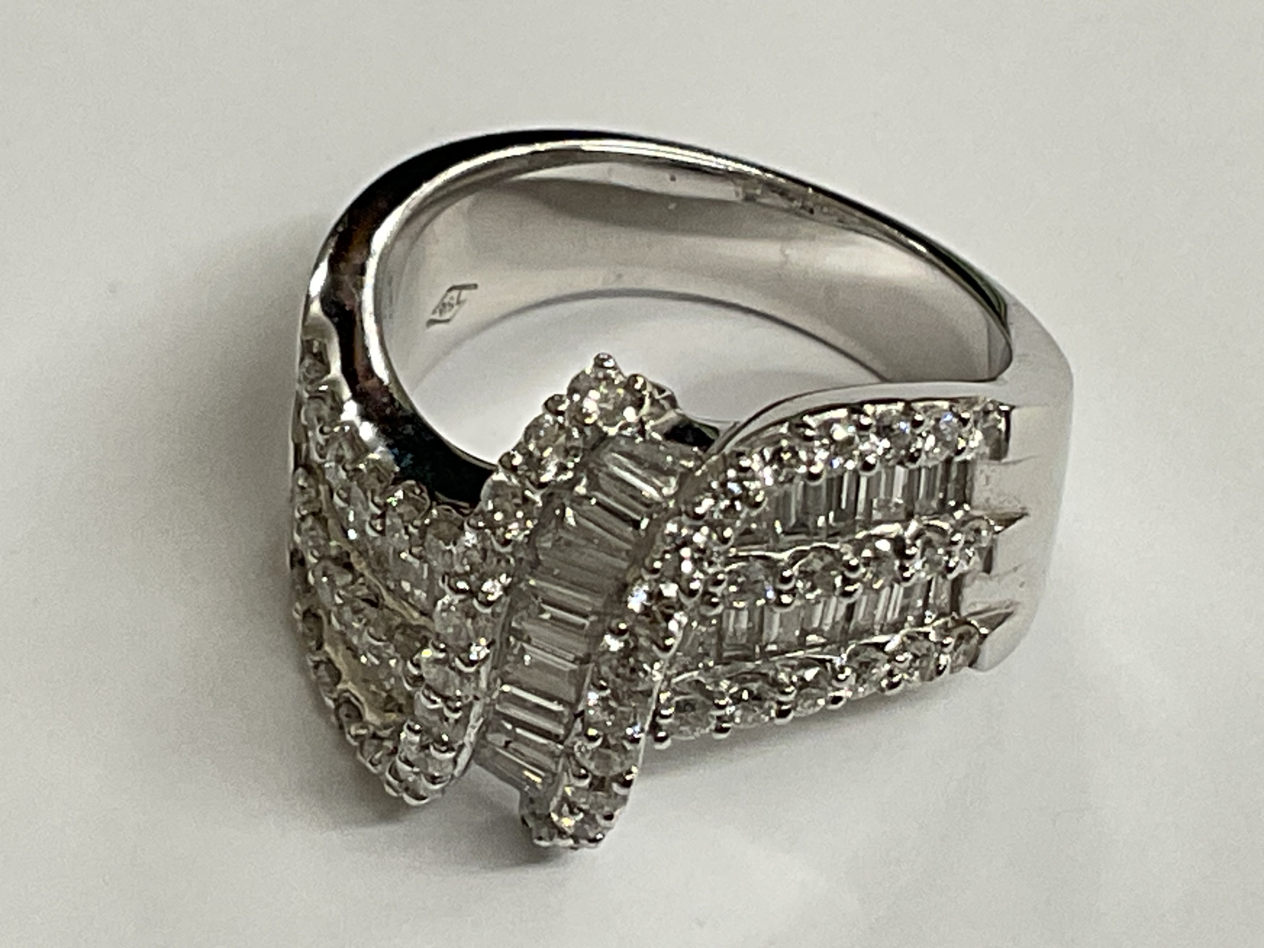18ct white gold diamond ring baguette round diamond ring. 2ct, 11g, approx ring size N. Postage category A.